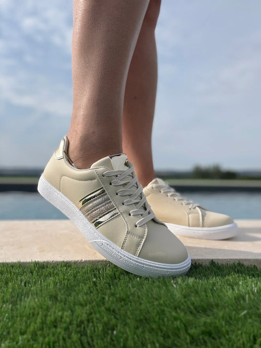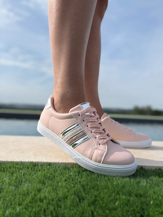Chaussures baskets rose pâle avec bandes argentées et dorées style sneakers