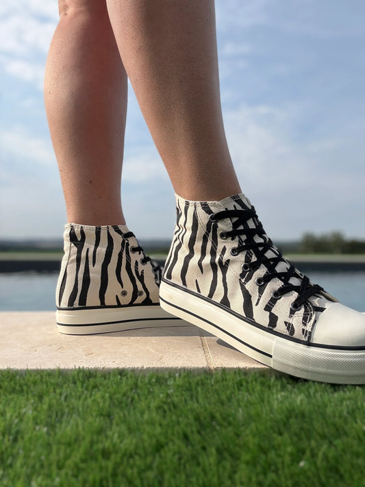 Chaussures baskets hautes en toile motif zèbre noir et blanc style converse