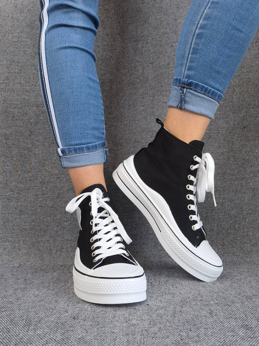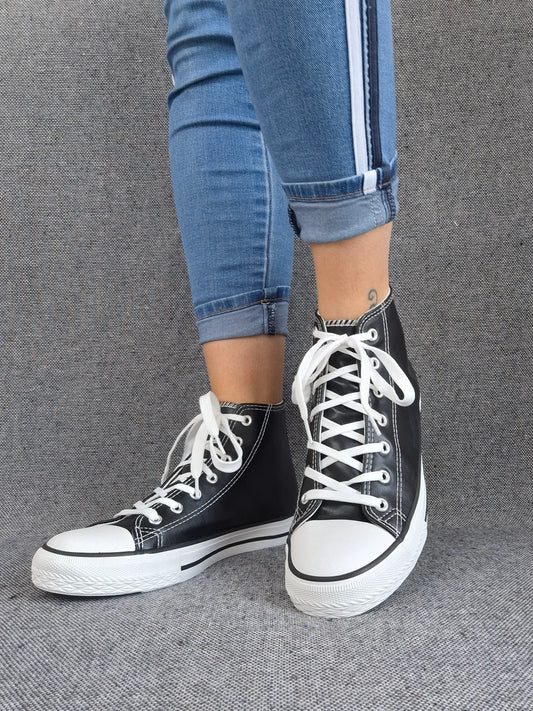 Chaussures baskets hautes noires et blanches avec motif cœur argenté style converse