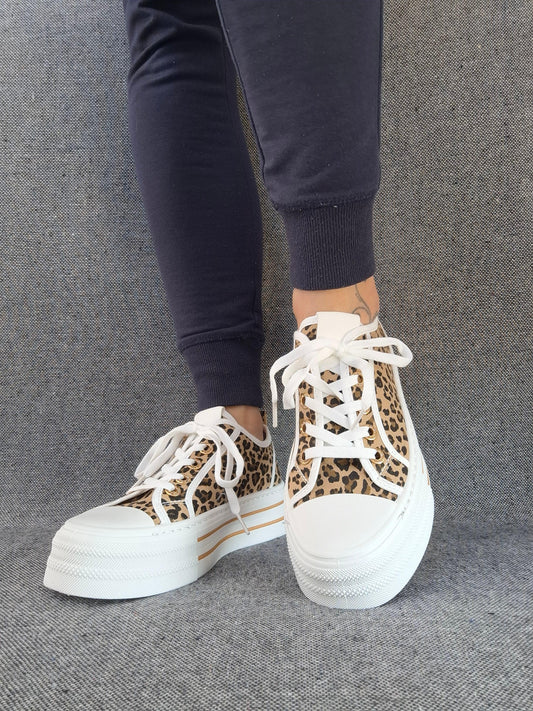 Chaussures baskets blanches à motif léopard semelle compensée style converse