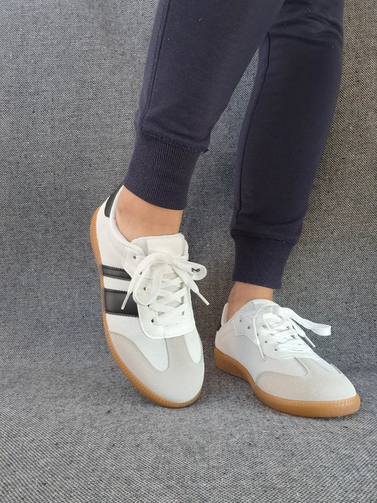 Chaussures baskets plates blanches avec bandes noires style sneakers