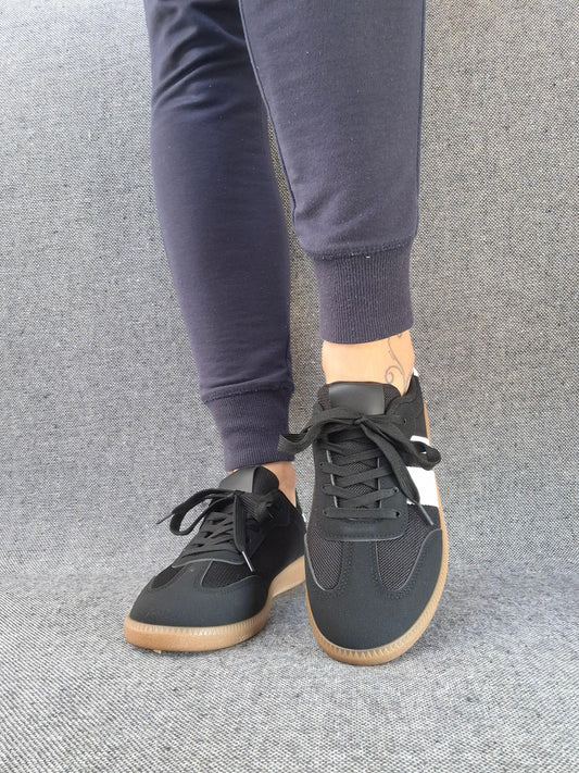 Chaussures baskets plates noires avec bandes blanches style sneakers
