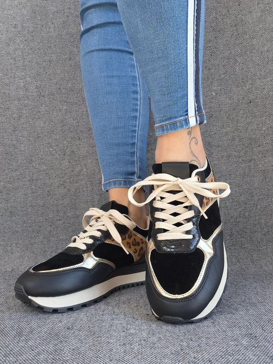 Chaussures baskets en tissu noir avec un motif léopard style sneakers