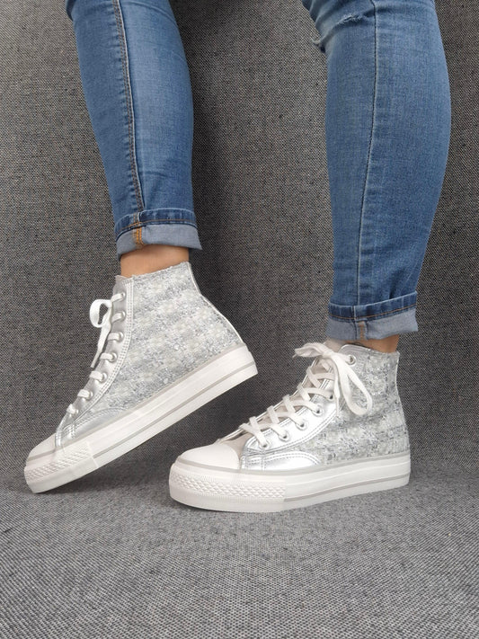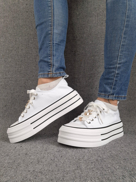 Chaussures baskets basses semelle compensée en tissu blanc style converse
