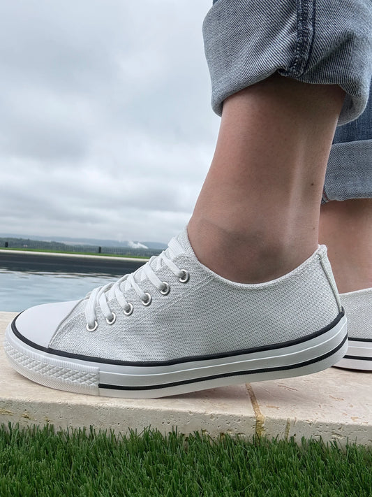 Chaussures baskets basses en simili beige strié et blanc type converse