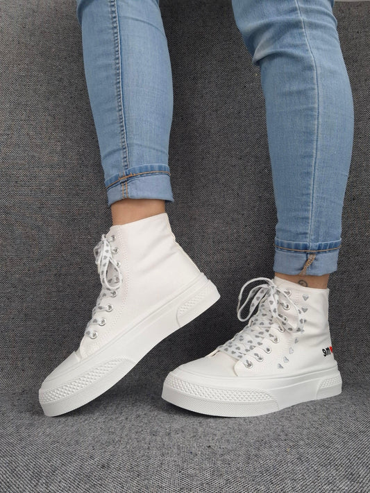 Chaussures baskets hautes en tissu toile blanc avec motifs coeurs semelles compensées