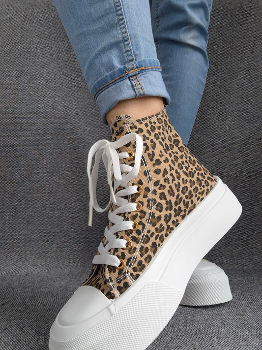 Chaussures baskets hautes en tissu toile leopard marron beige semelles compensées