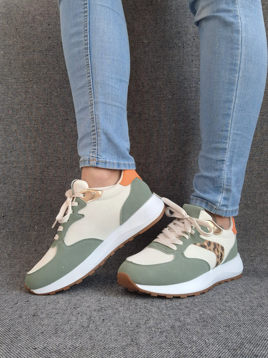 Chaussures baskets basses vert d'eau tendance avec détails léopard style sneakers