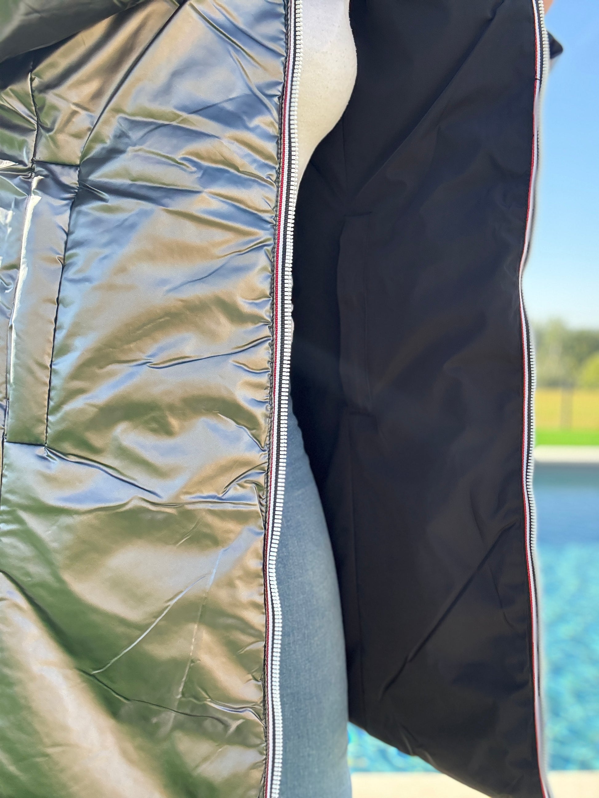La veste présente un design réversible avec une face noir et une autre argentée brillante plus douce. Elle est dotée d'une fermeture éclair centrale robuste. La capuche est intégrée, offrant une protection contre le vent et le froid. Les manches longues complètent le design pratique et stylé de la veste.