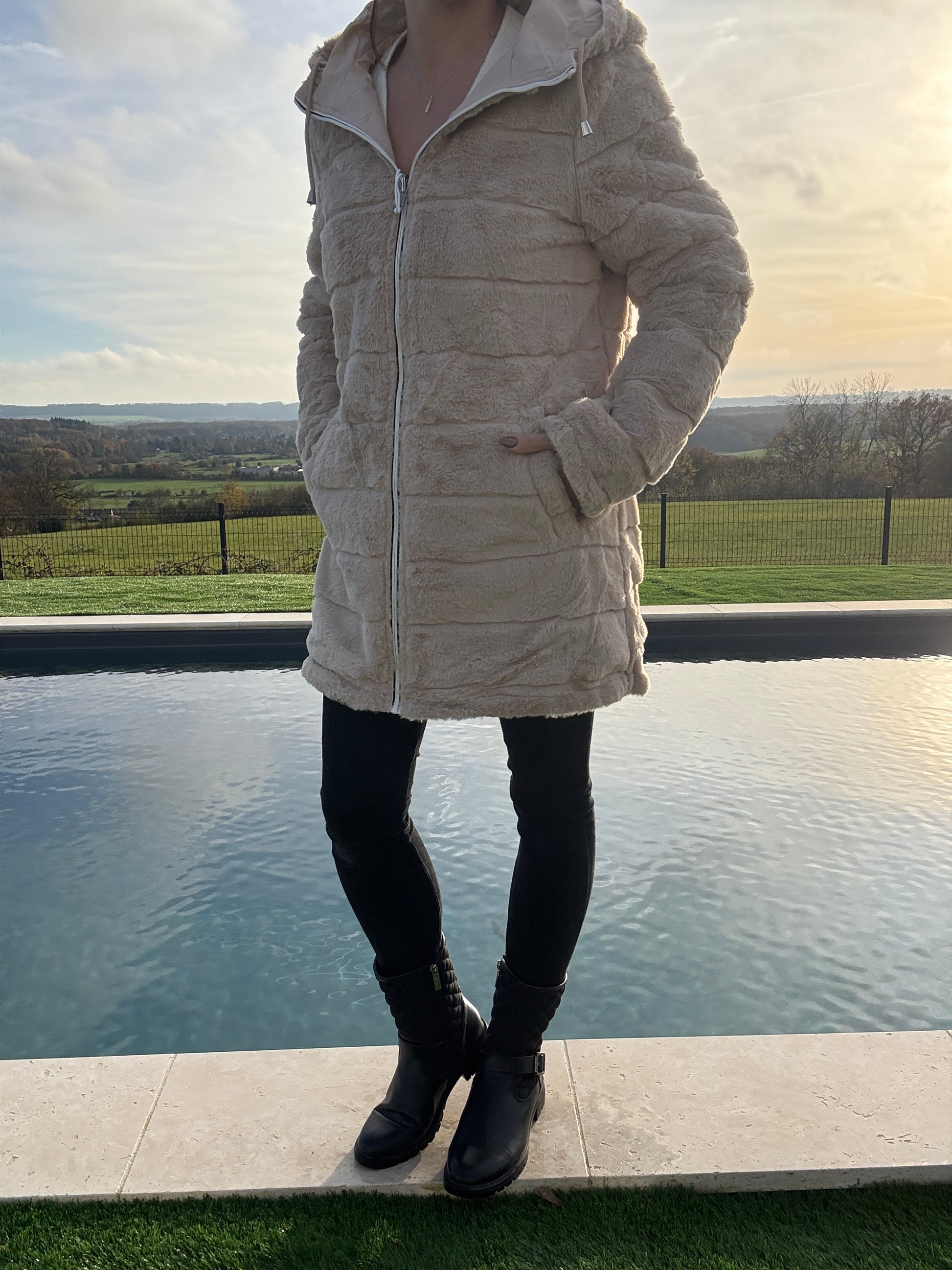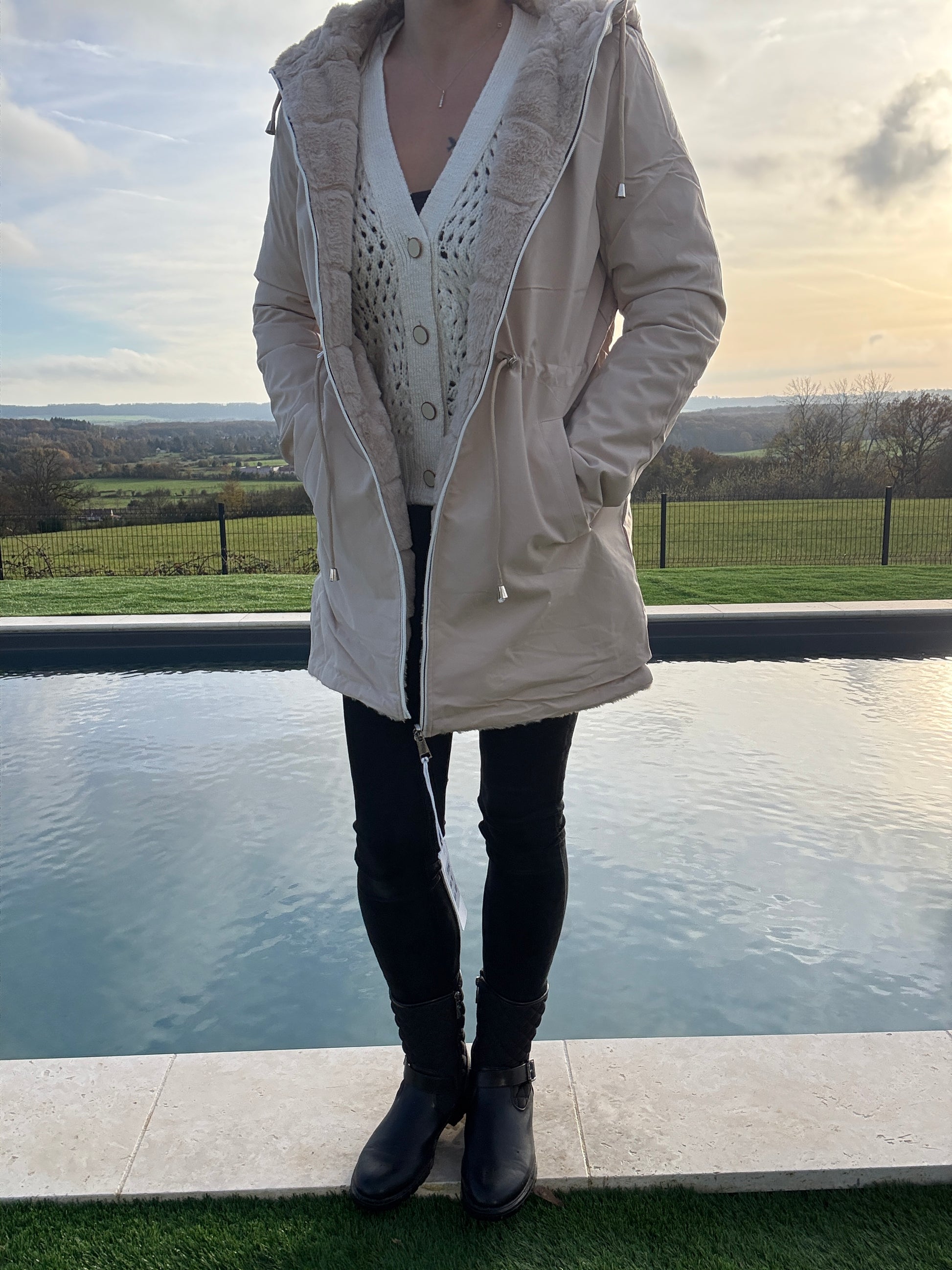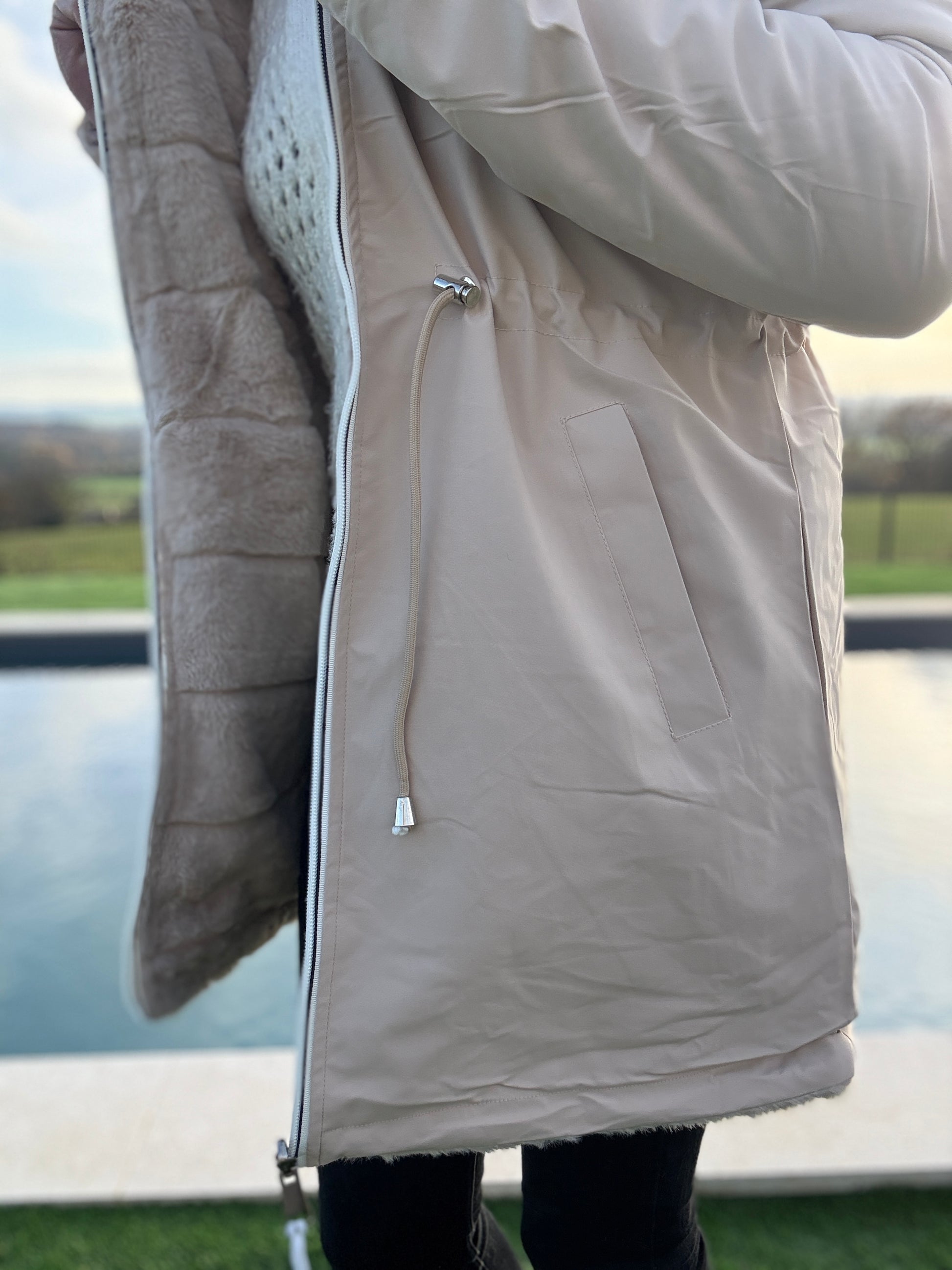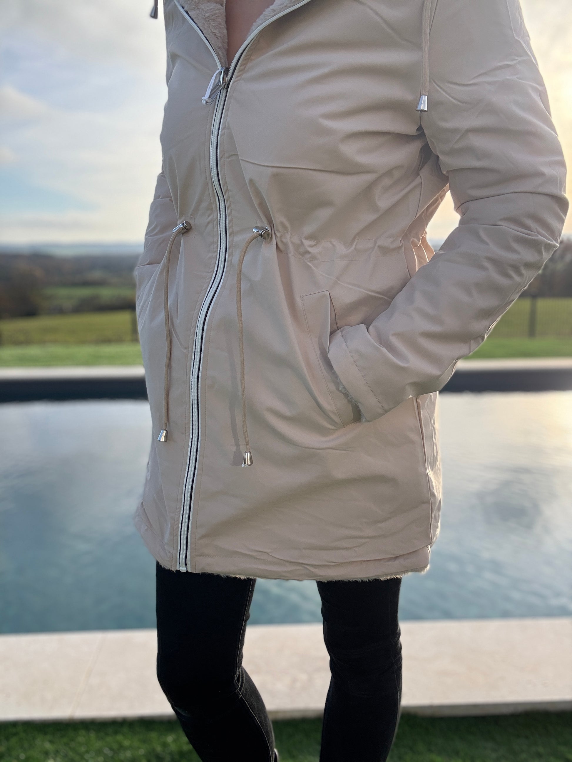 New Lolo - Manteau long beige réversible imperméable fourré fausse fourrure avec un cordon de resserrage à la taille