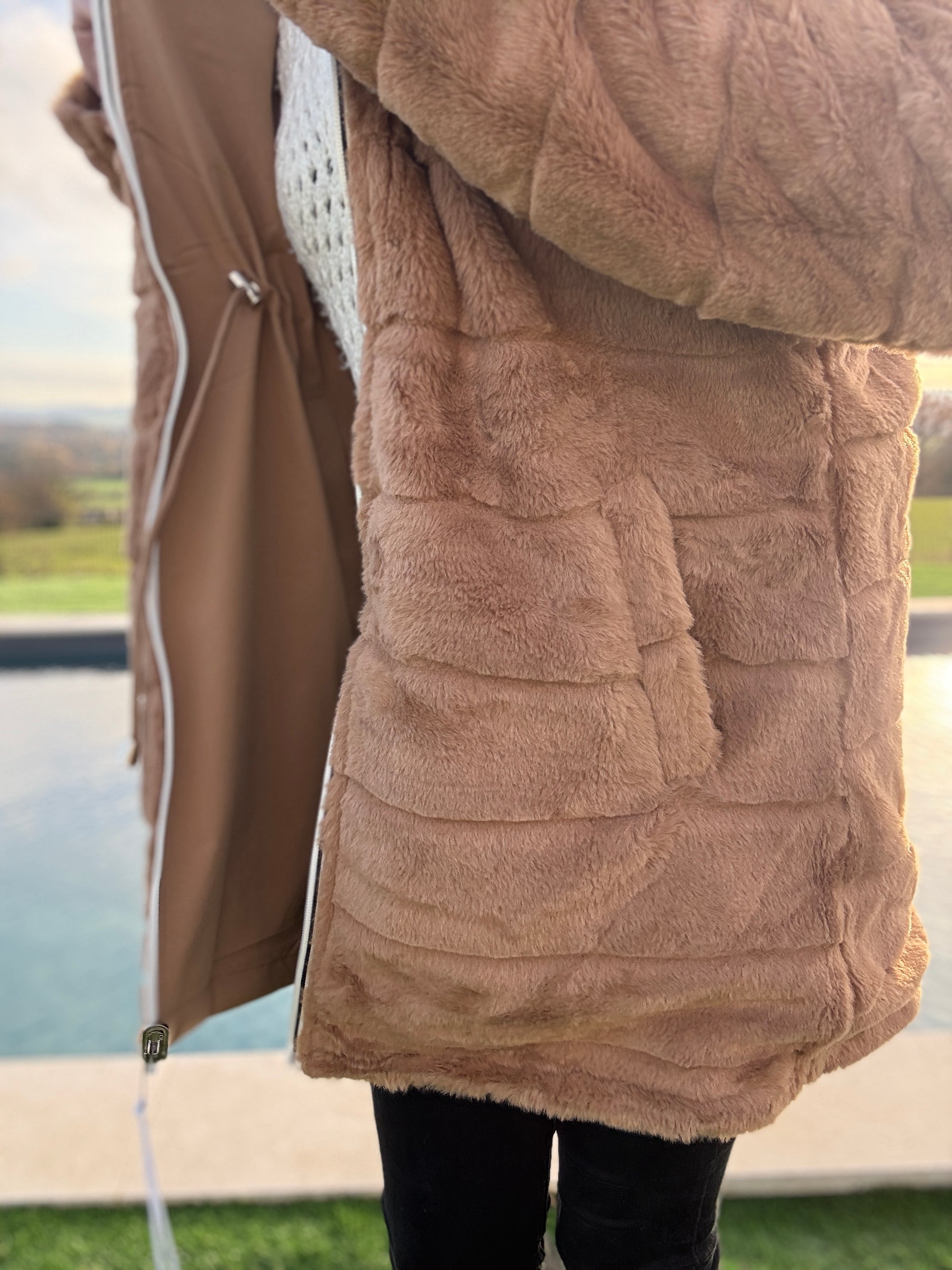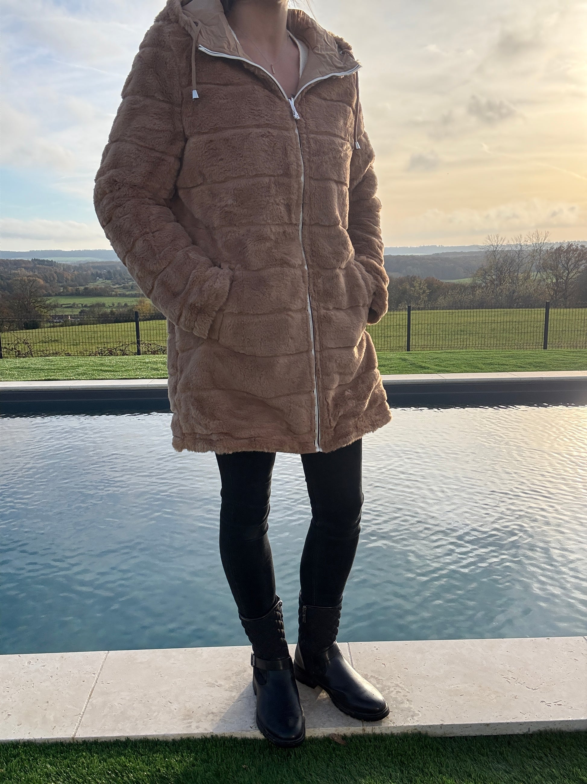 New Lolo - Manteau long camel réversible imperméable fourré fausse fourrure avec un cordon de resserrage à la taille- Curvy