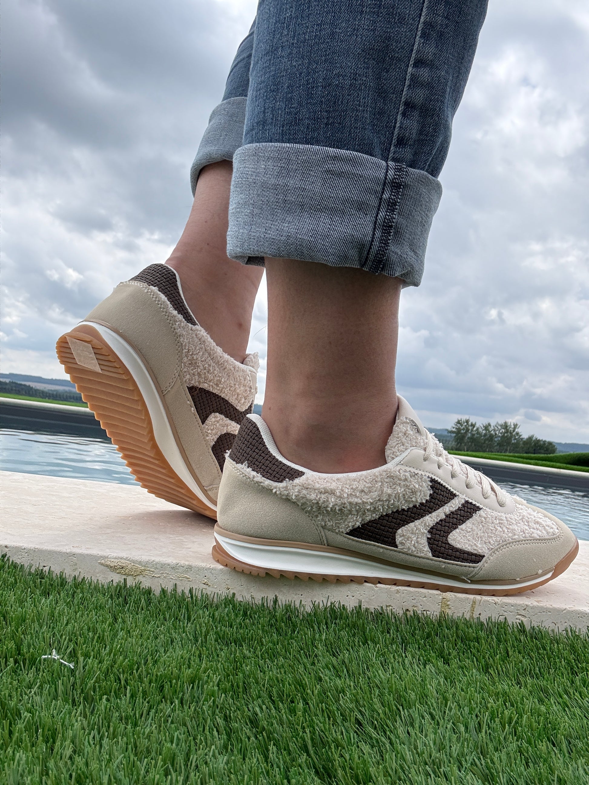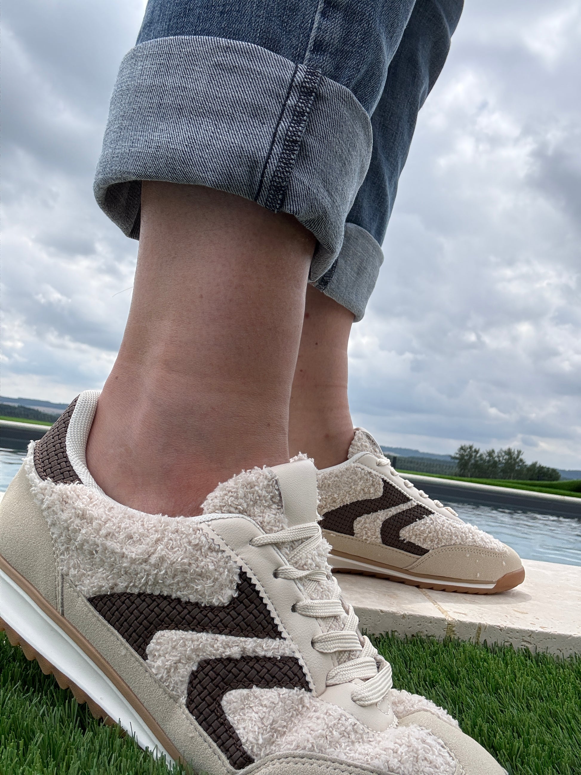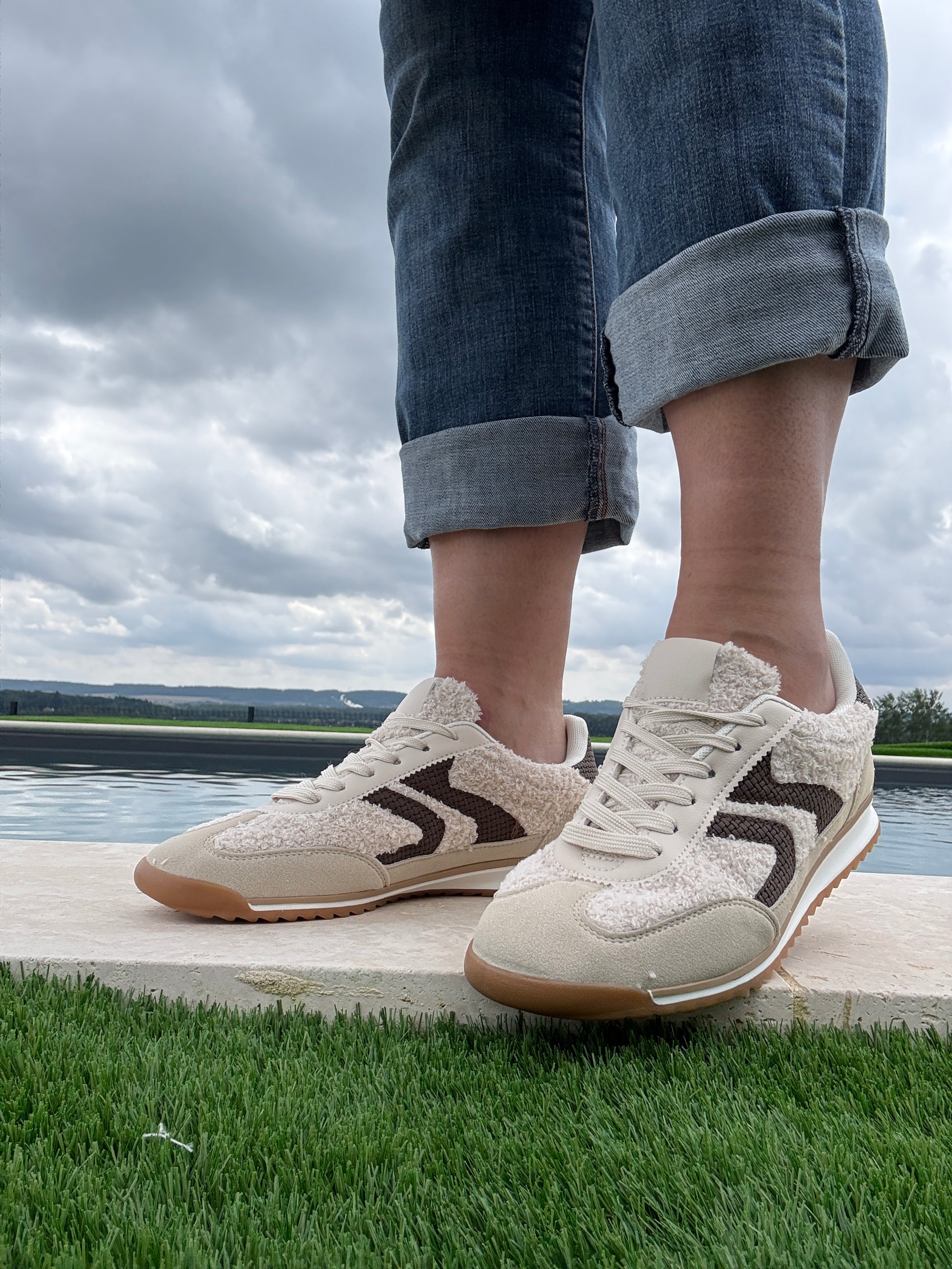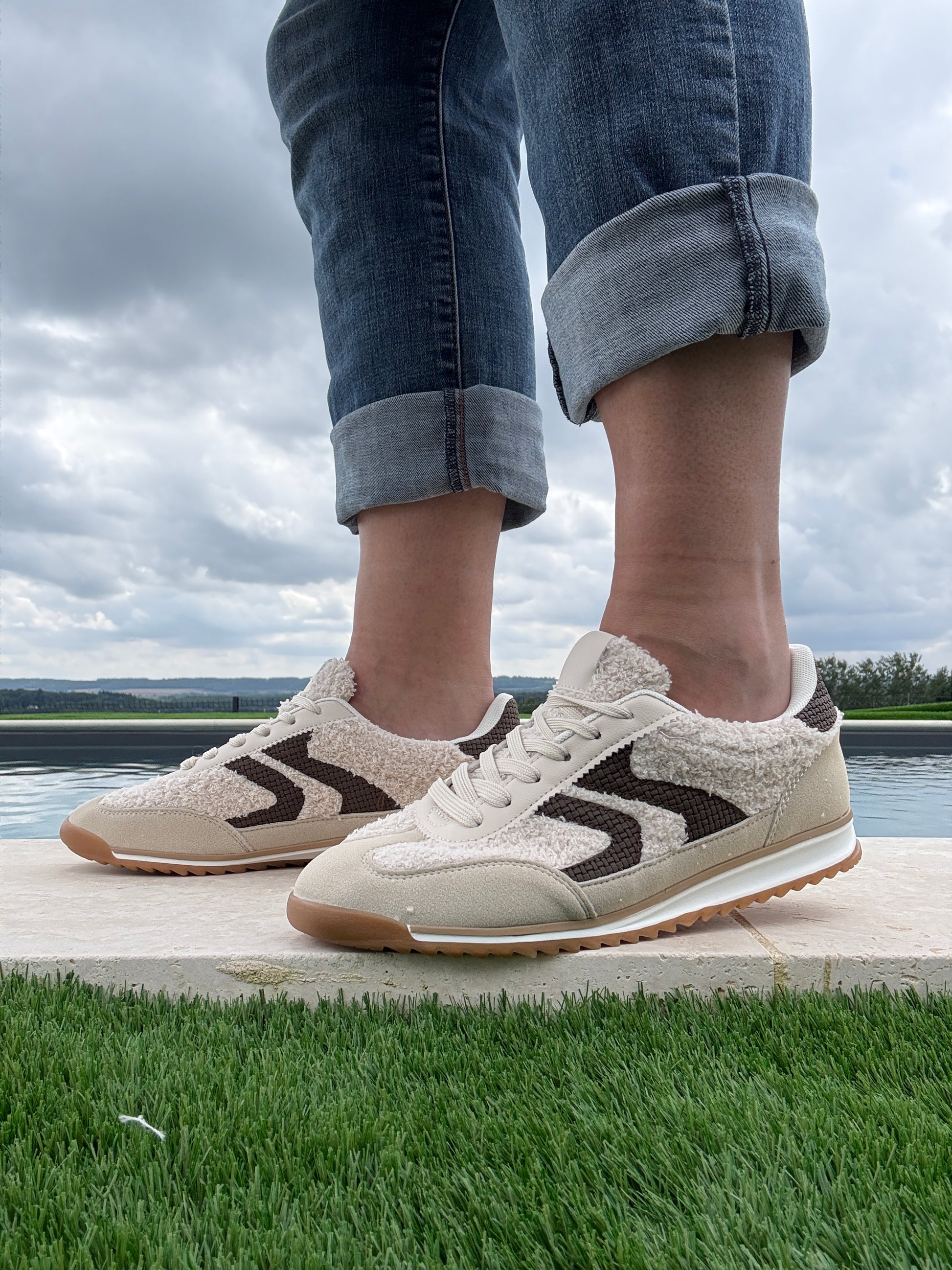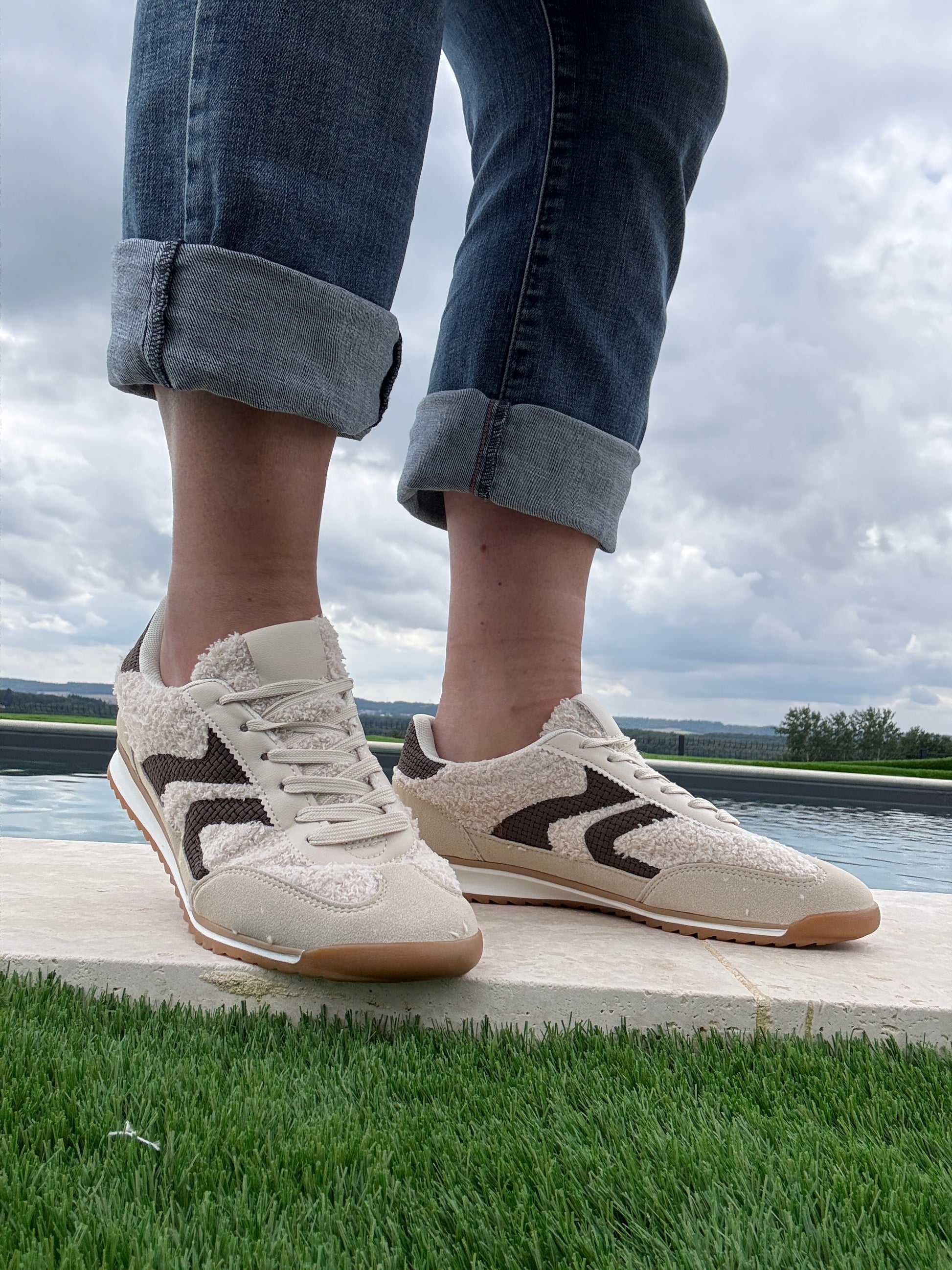 Chaussures baskets en moumoute bouclettes blanches et noires avec motif en zigzag