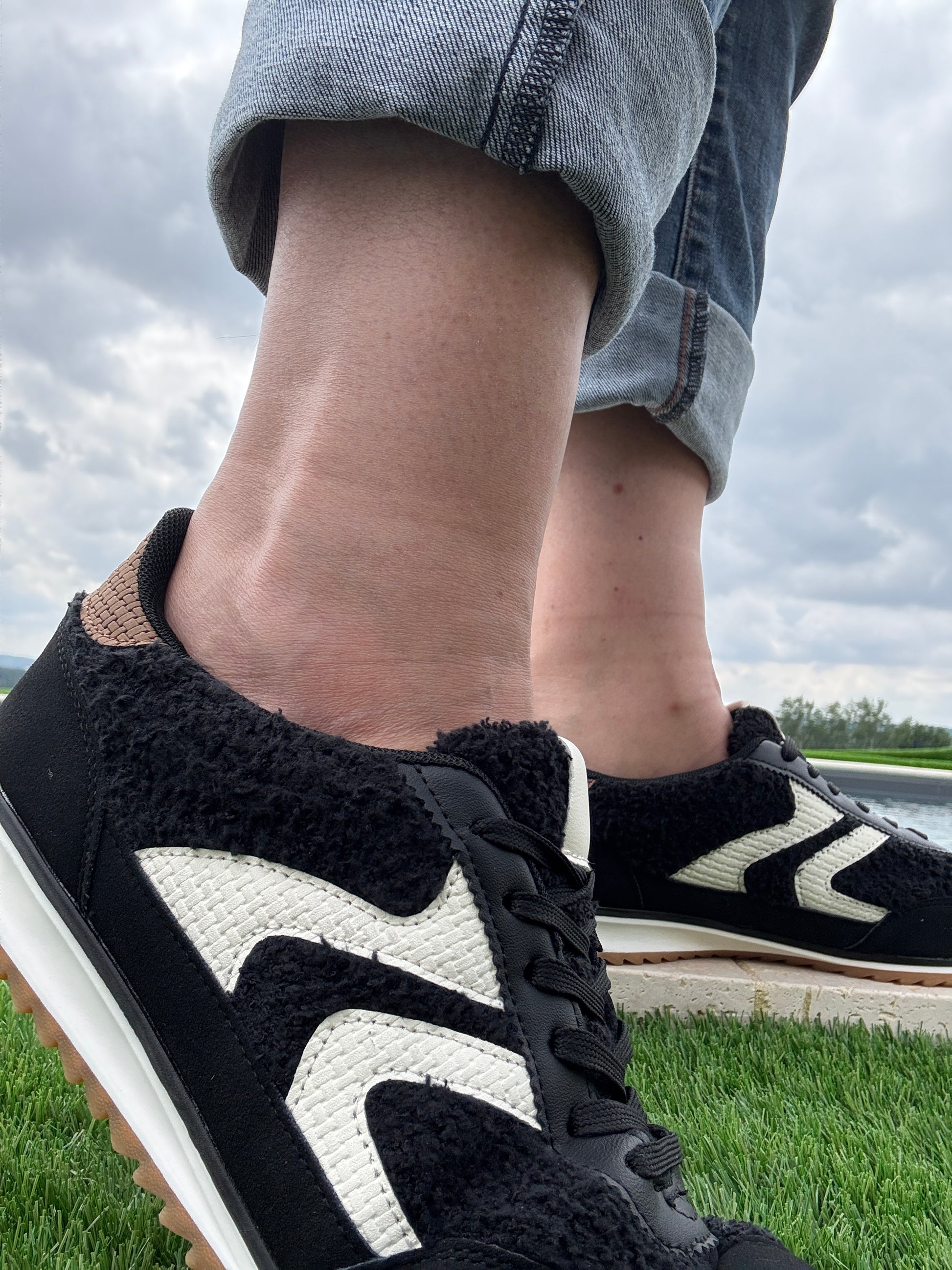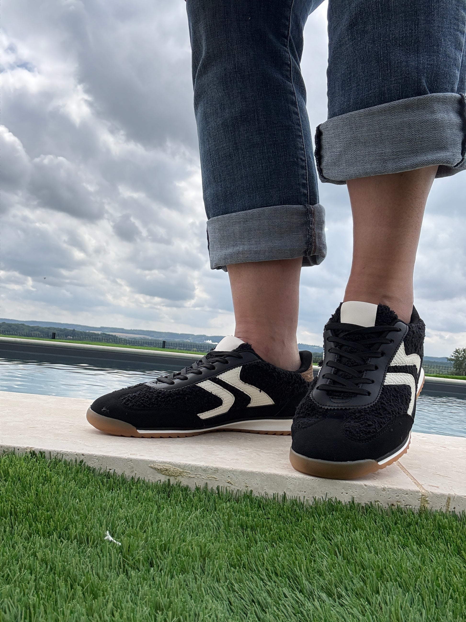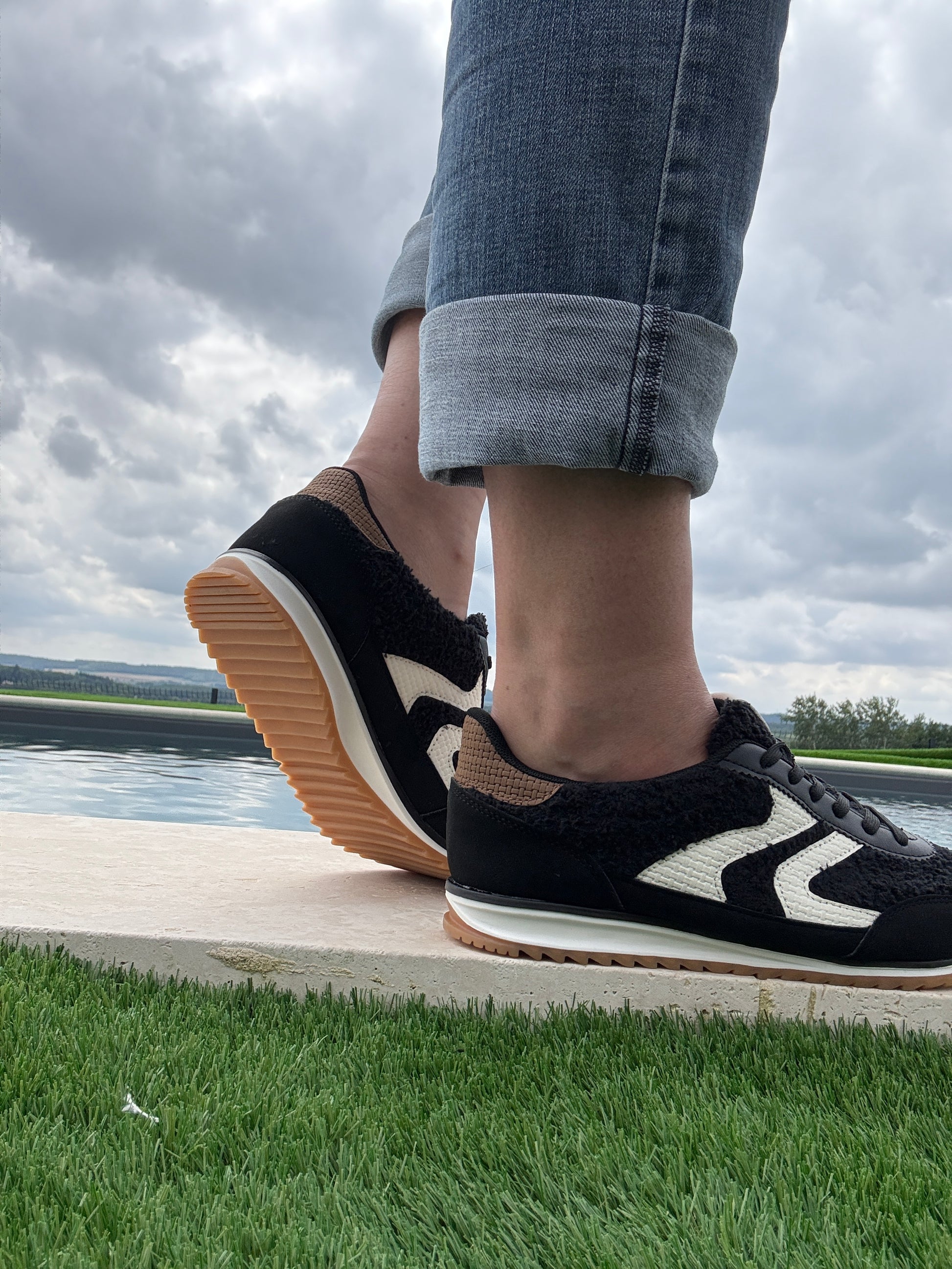 Chaussures baskets en moumoute bouclettes noires et blanches avec motif en zigzag
