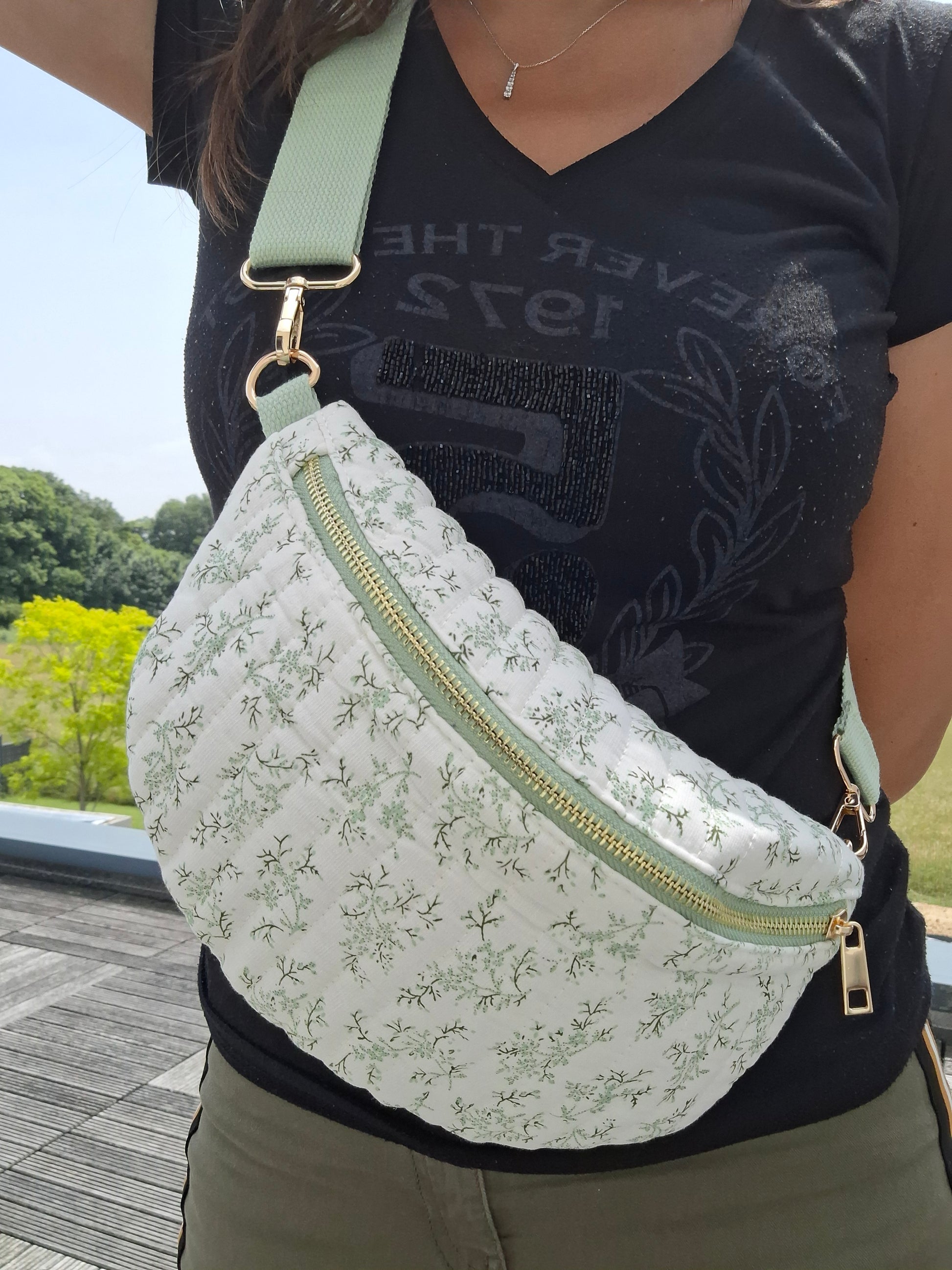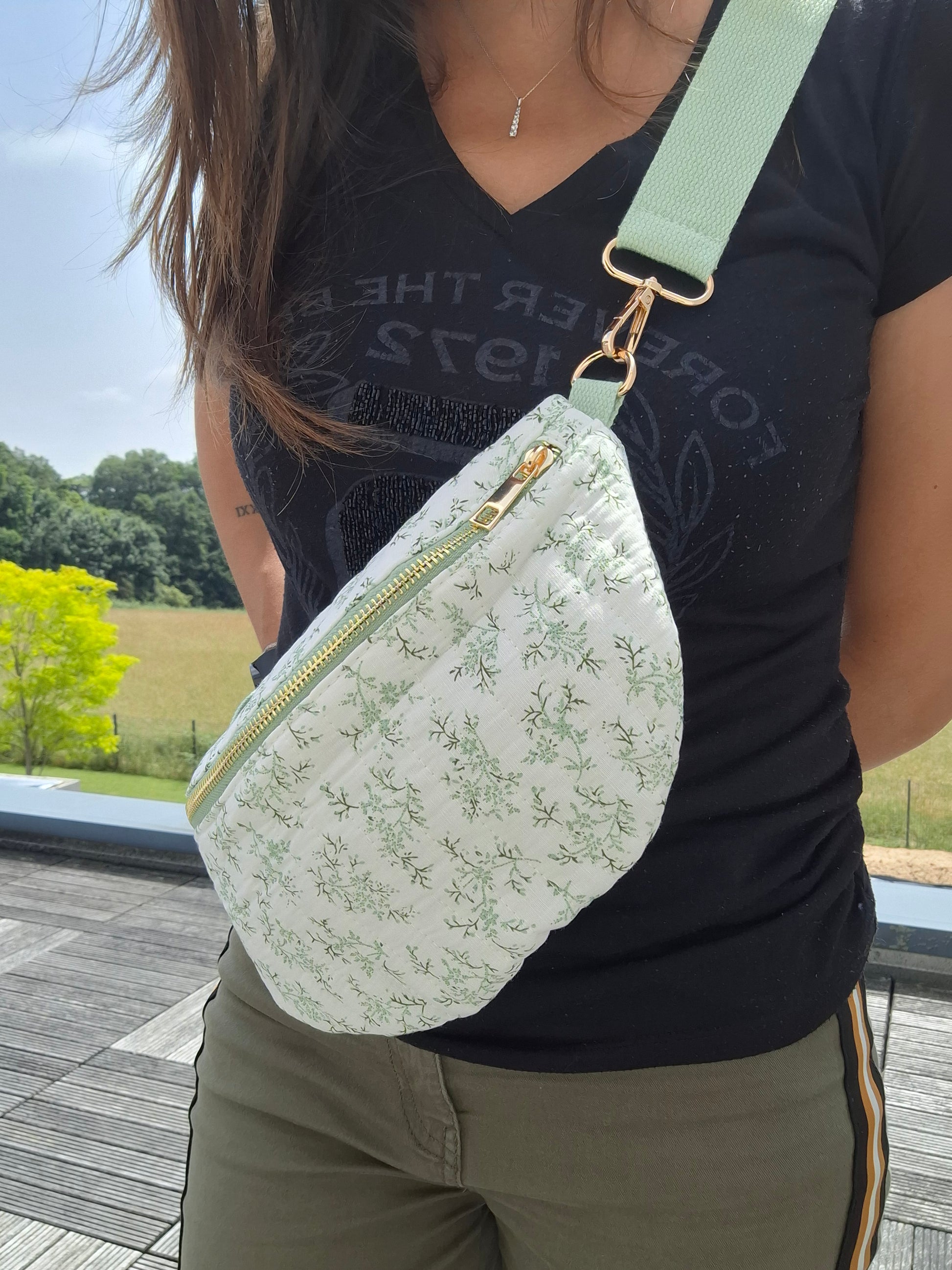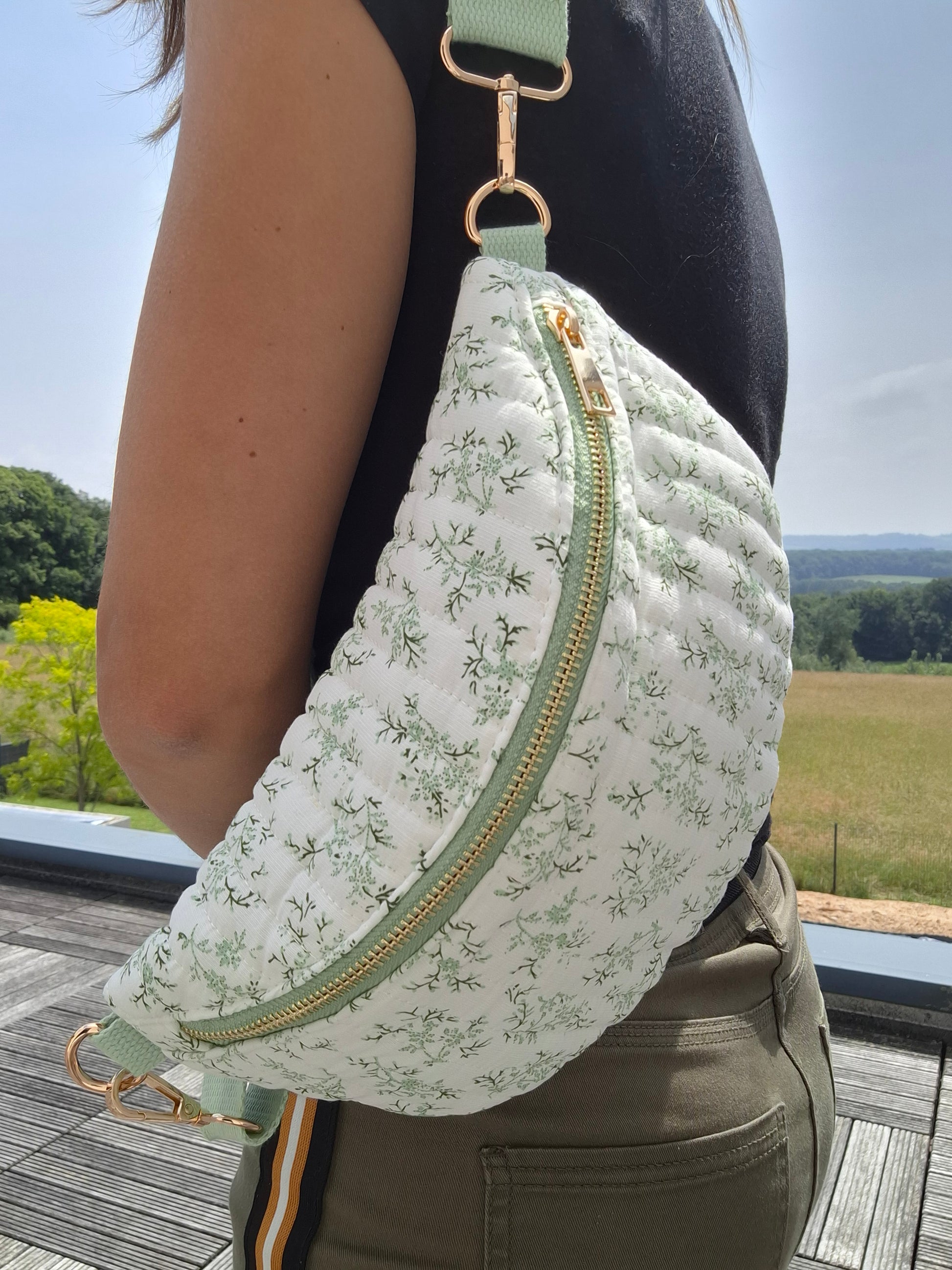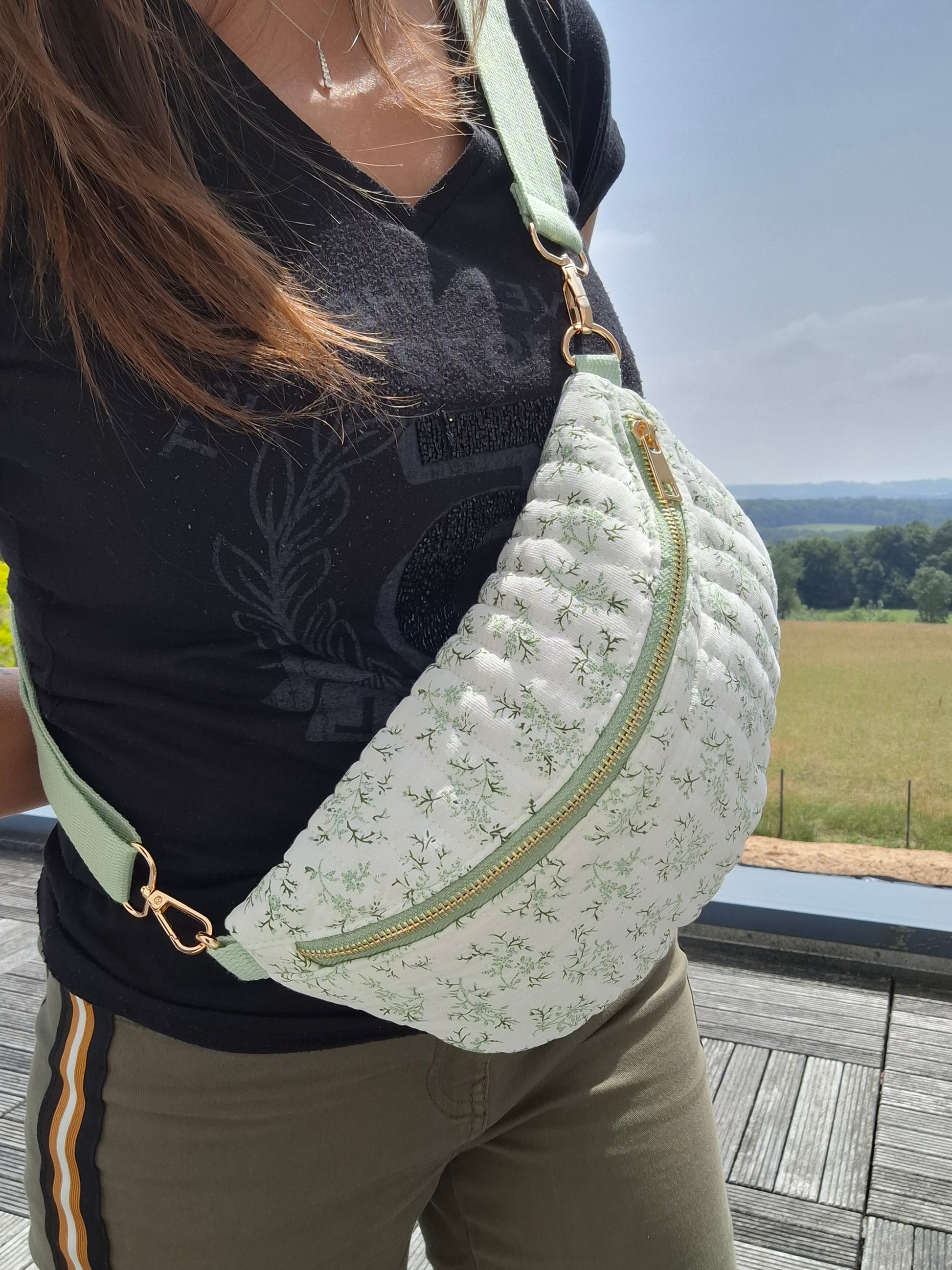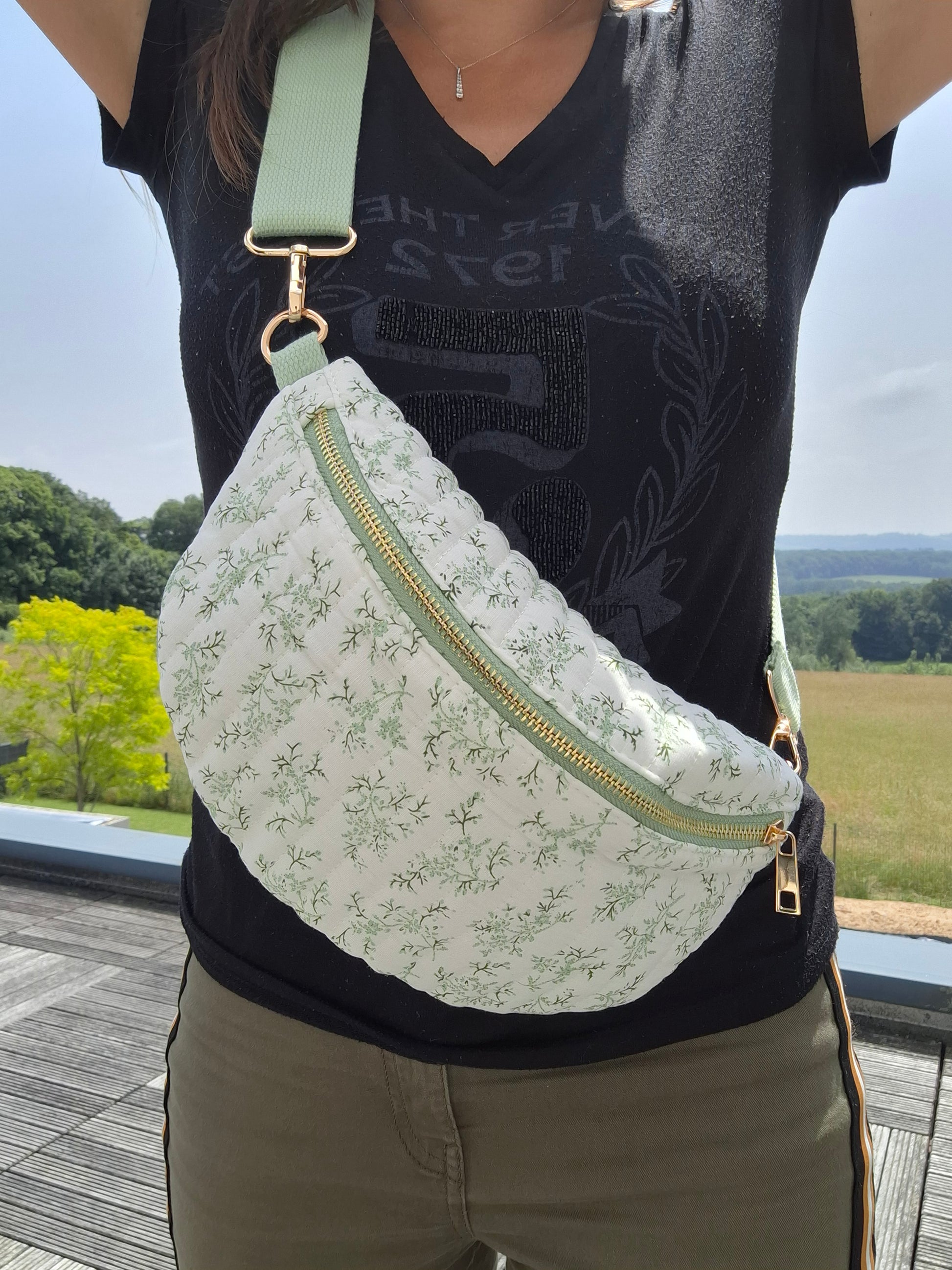 Sac banane en coton matelassé liberty blanc motif floral vert olive