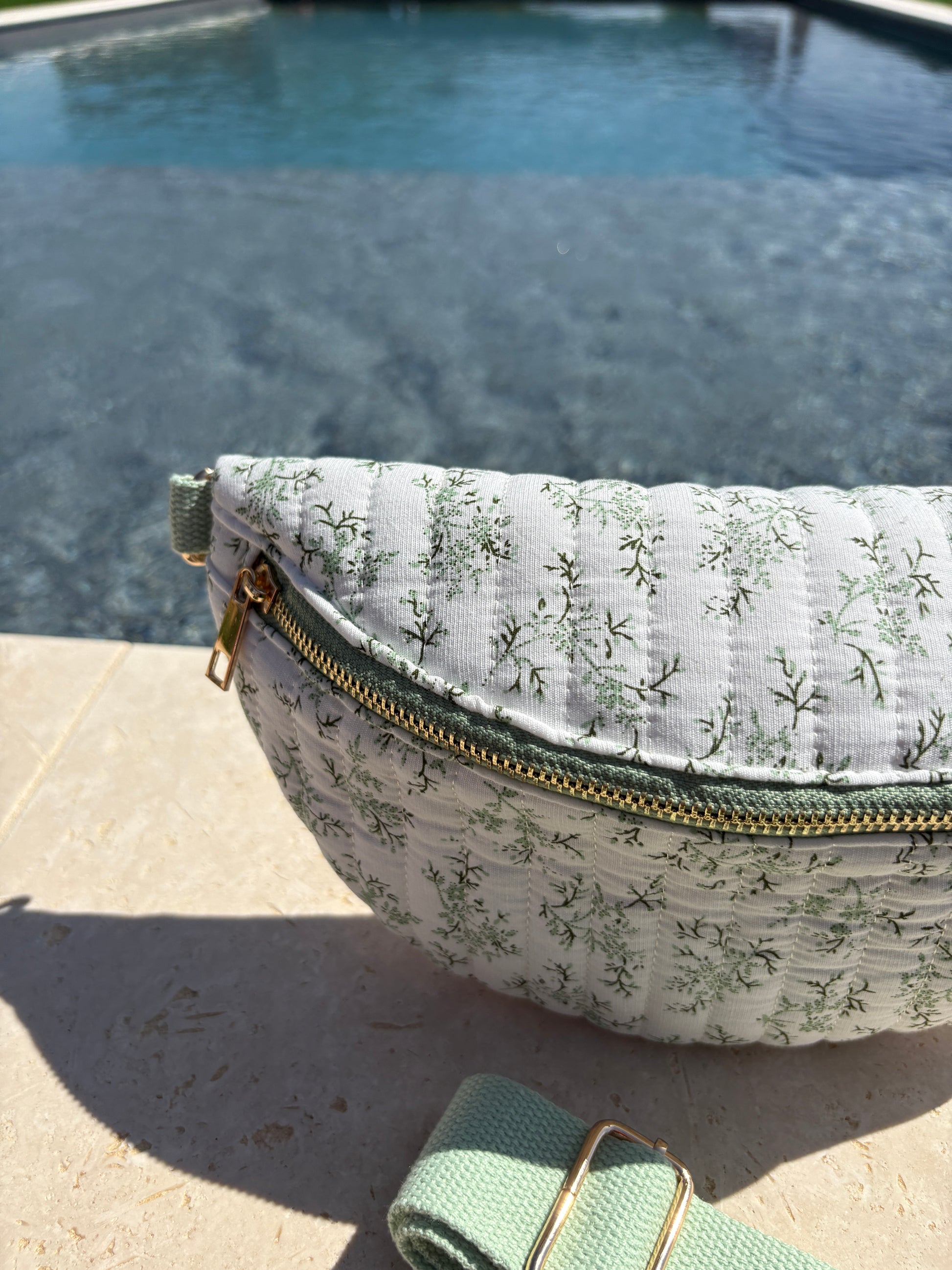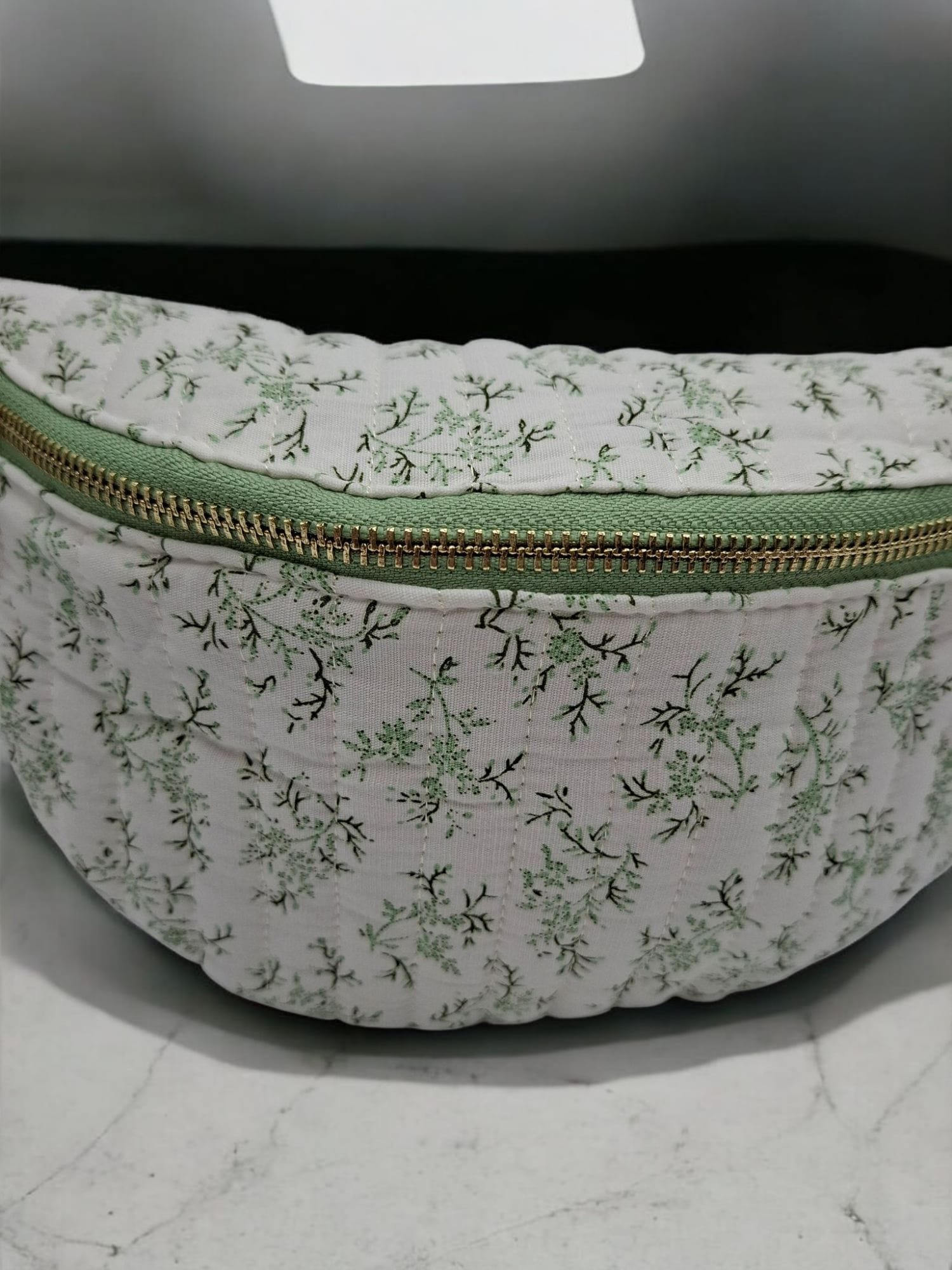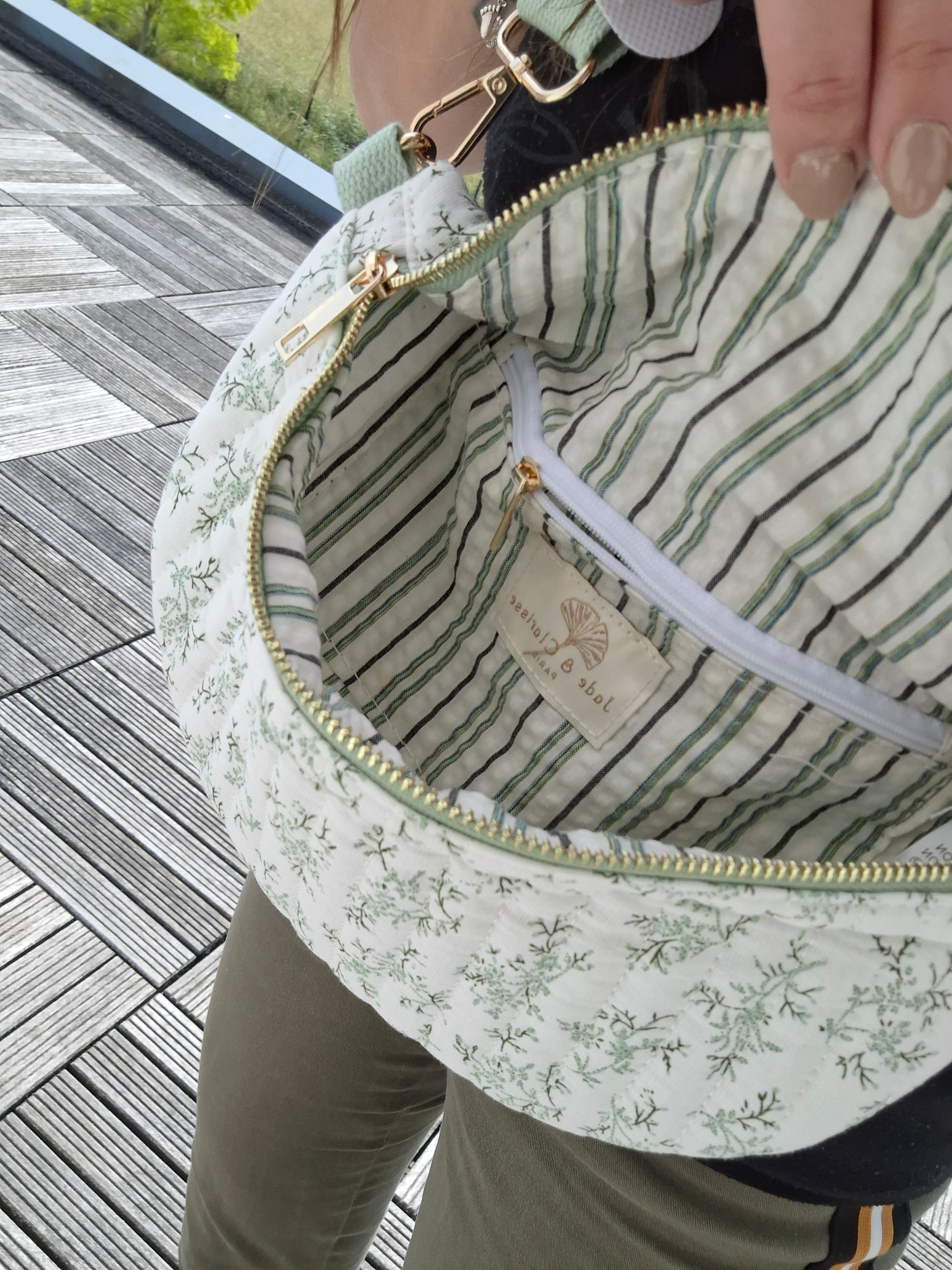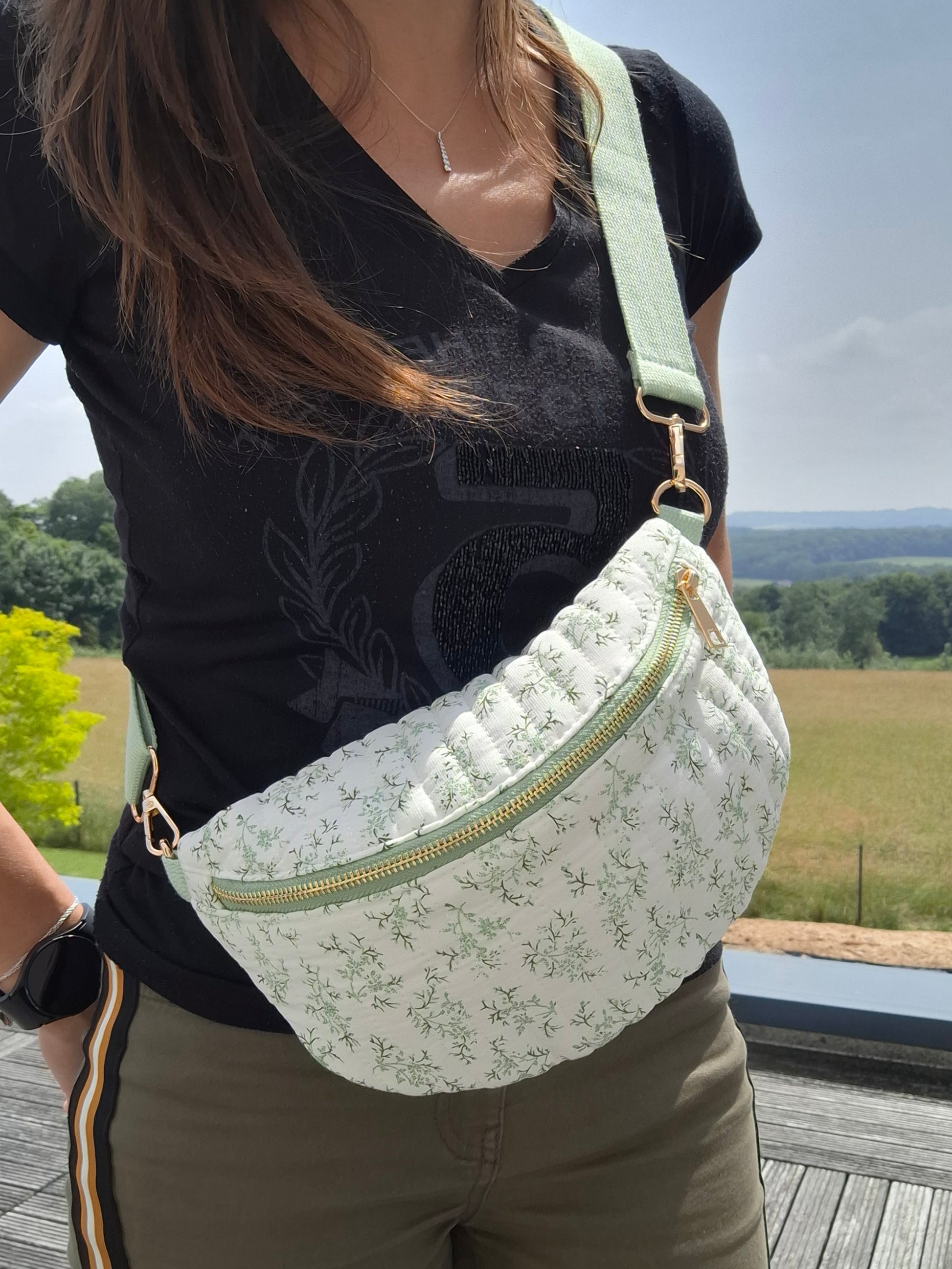 Sac banane en coton matelassé liberty blanc motif floral vert olive