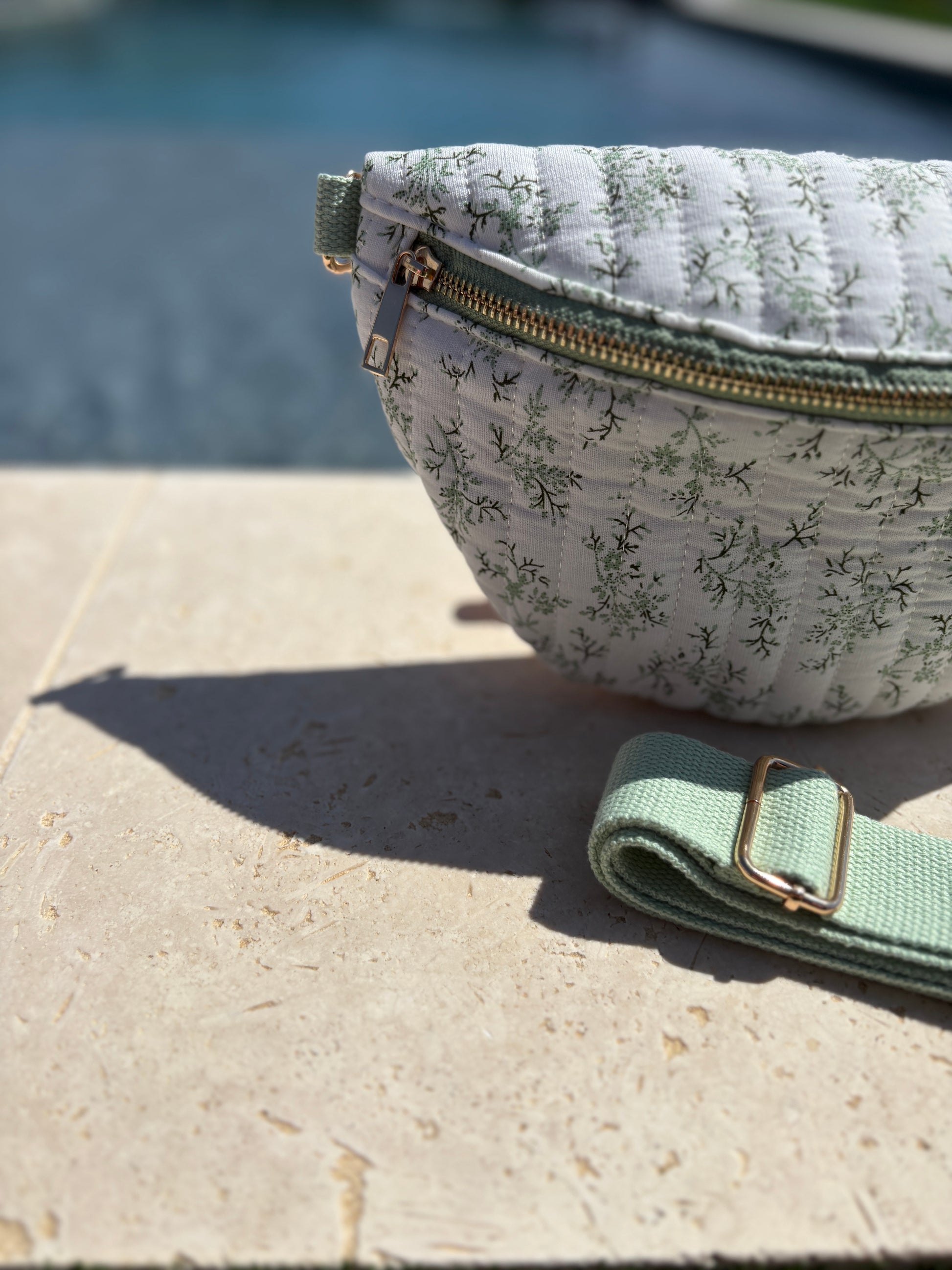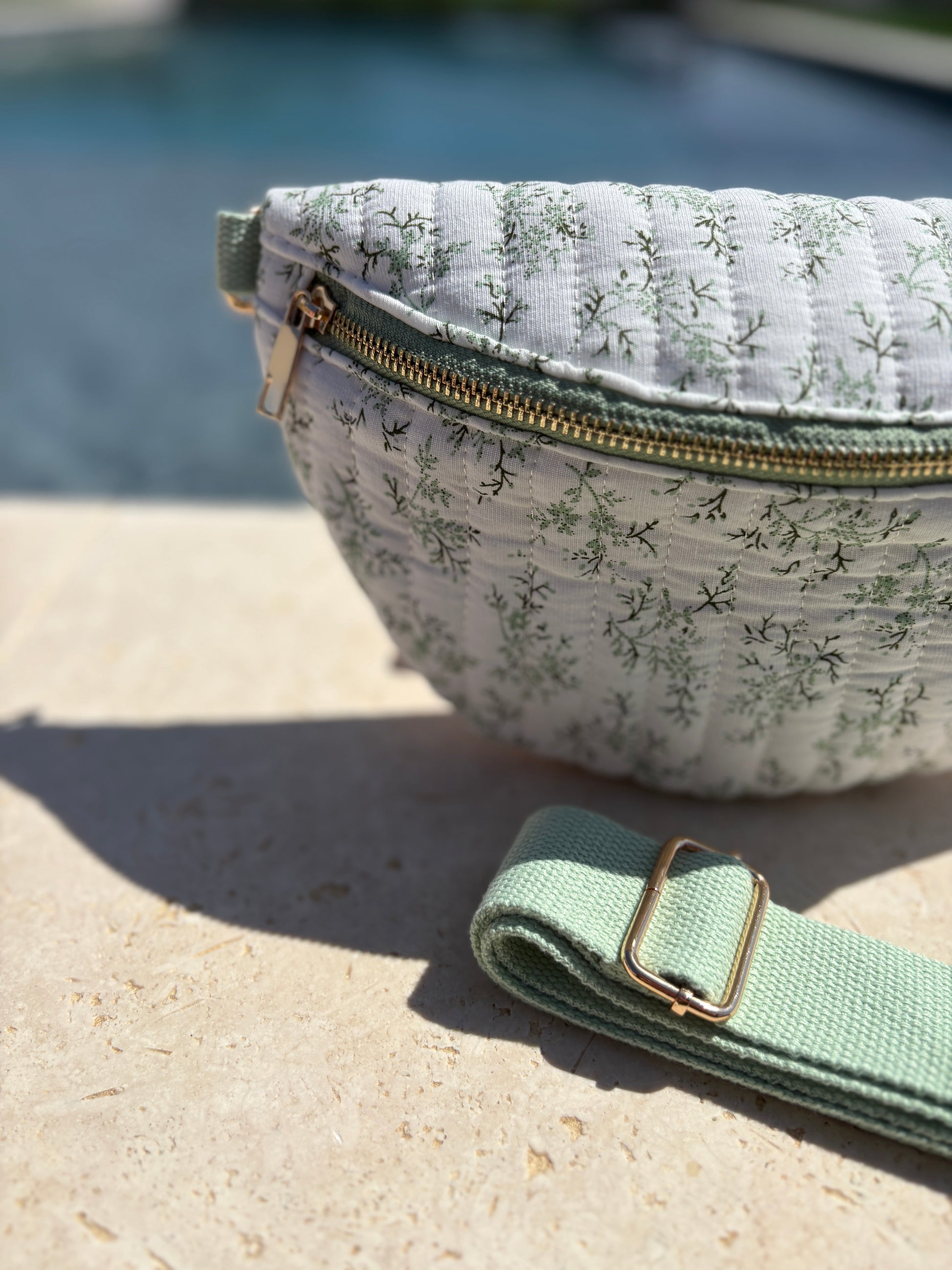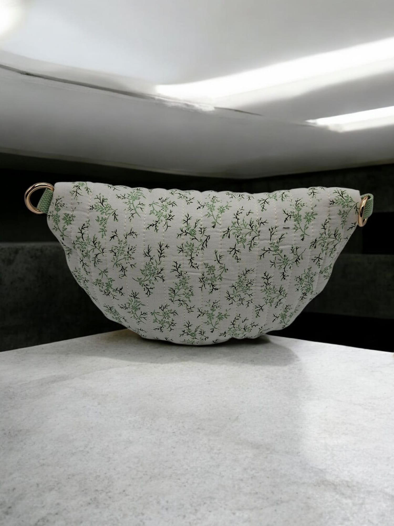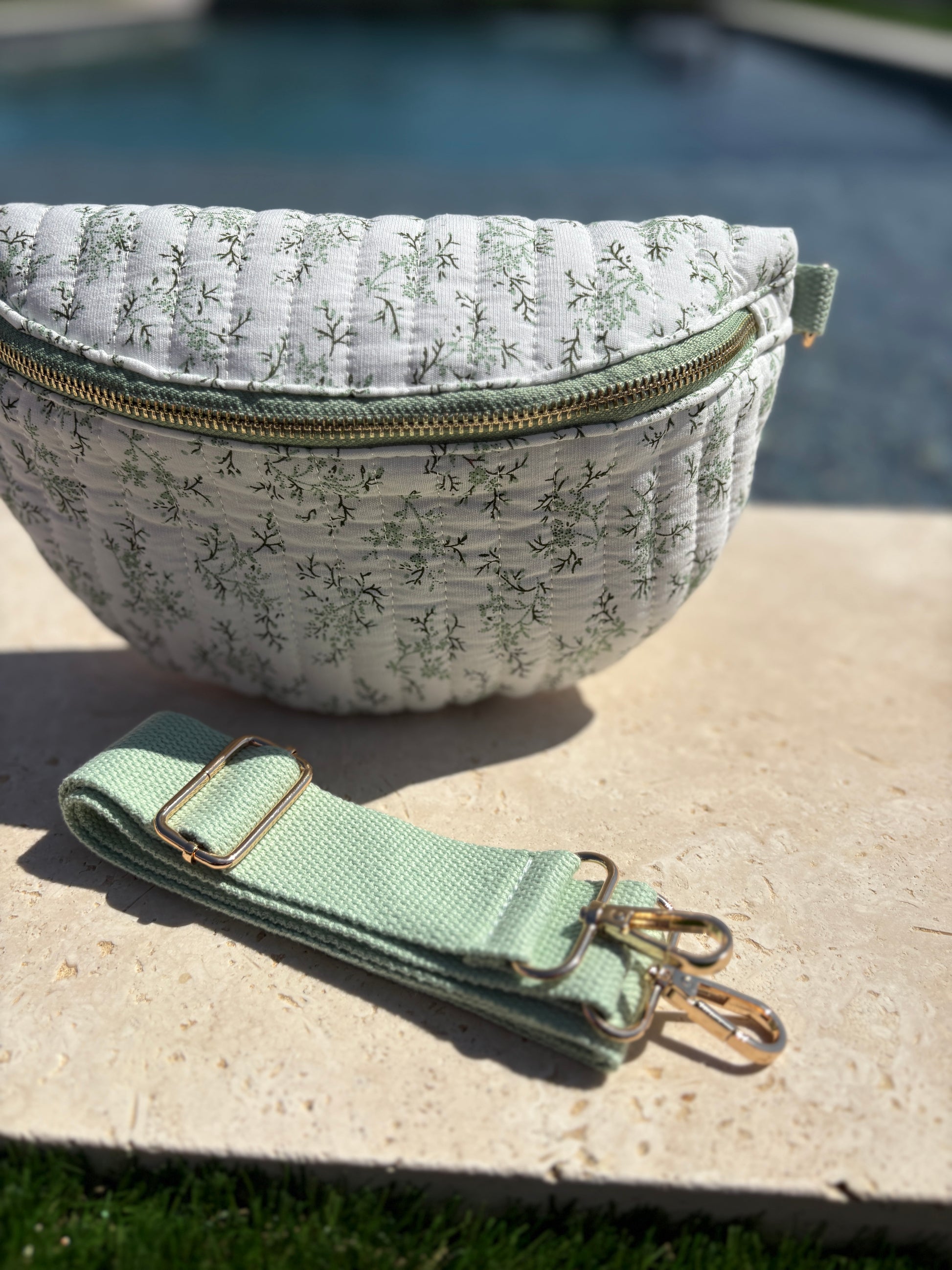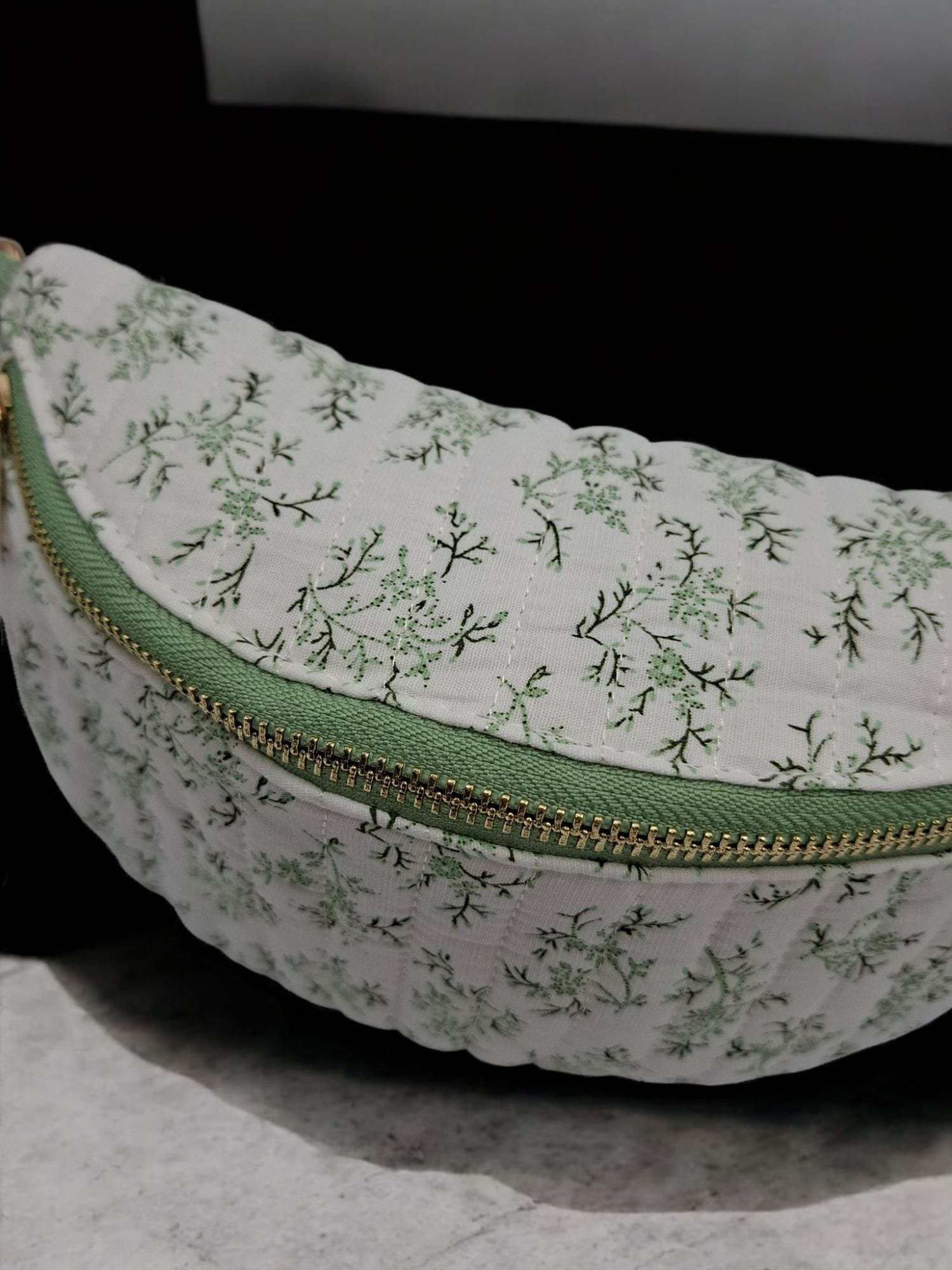 Sac banane en coton matelassé liberty blanc motif floral vert olive
