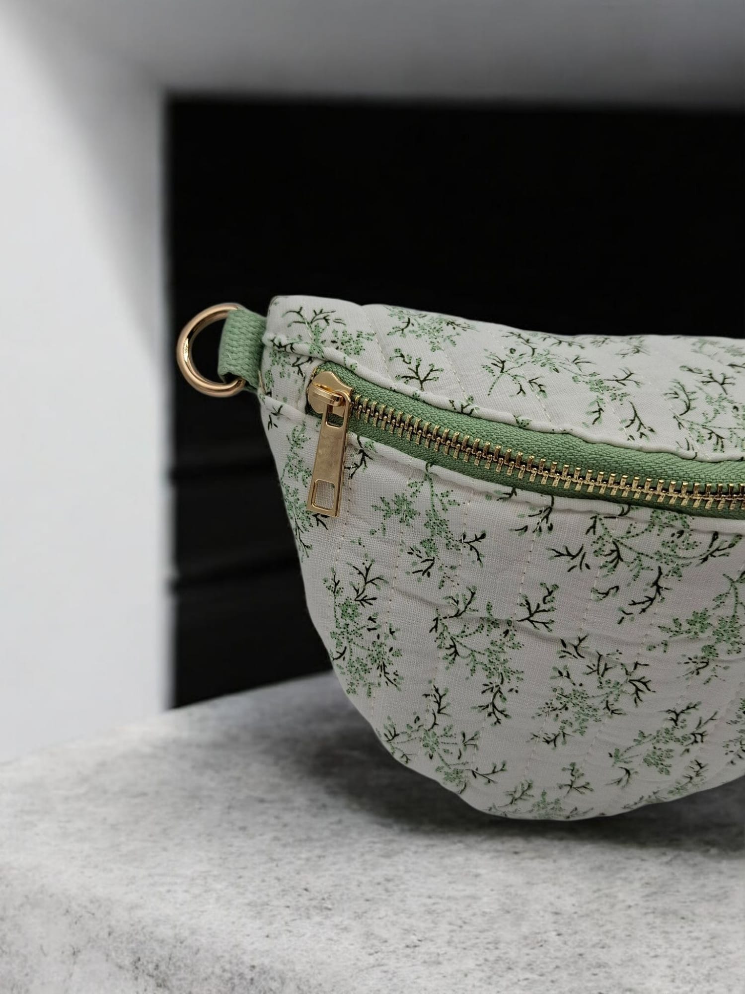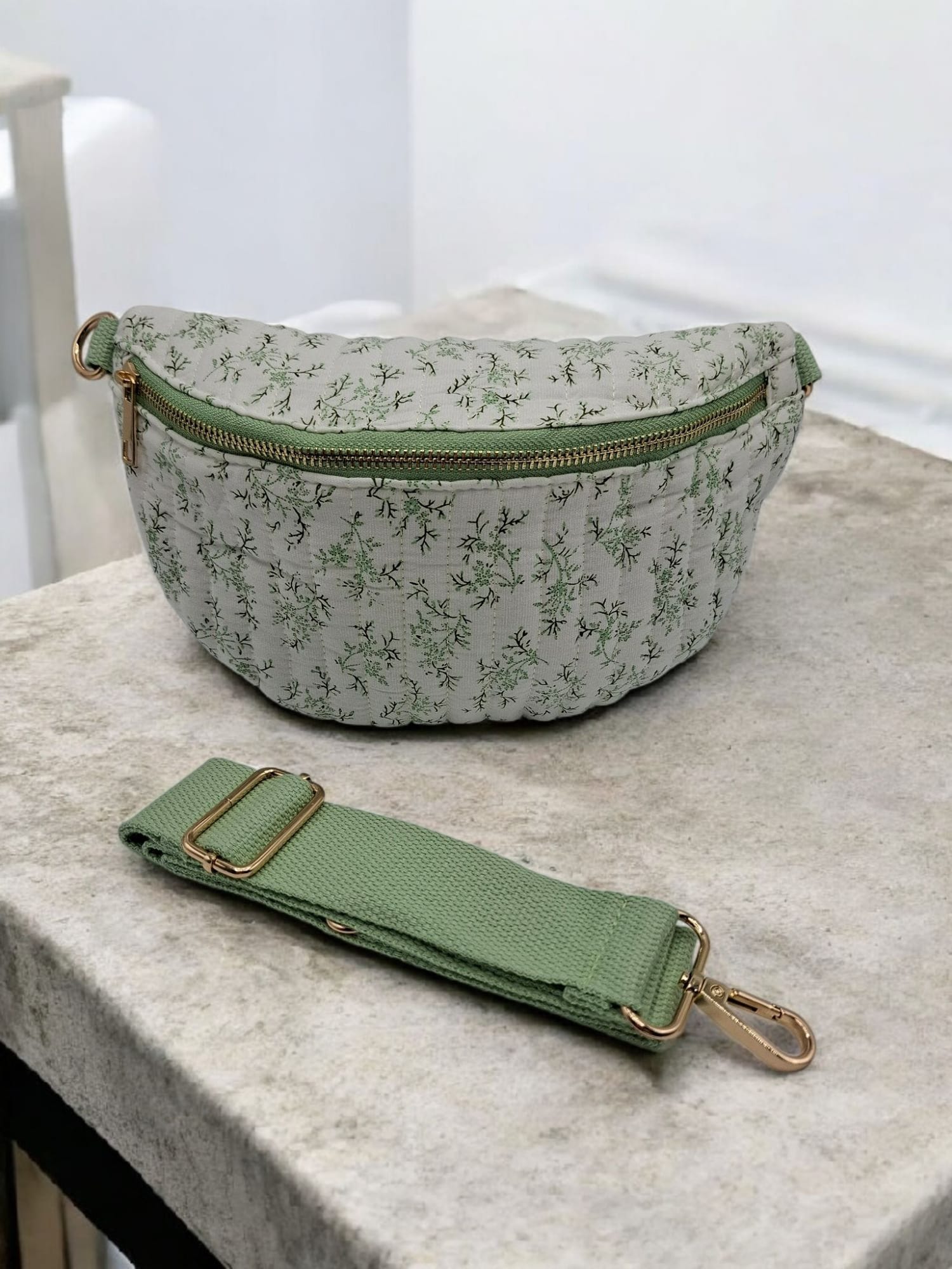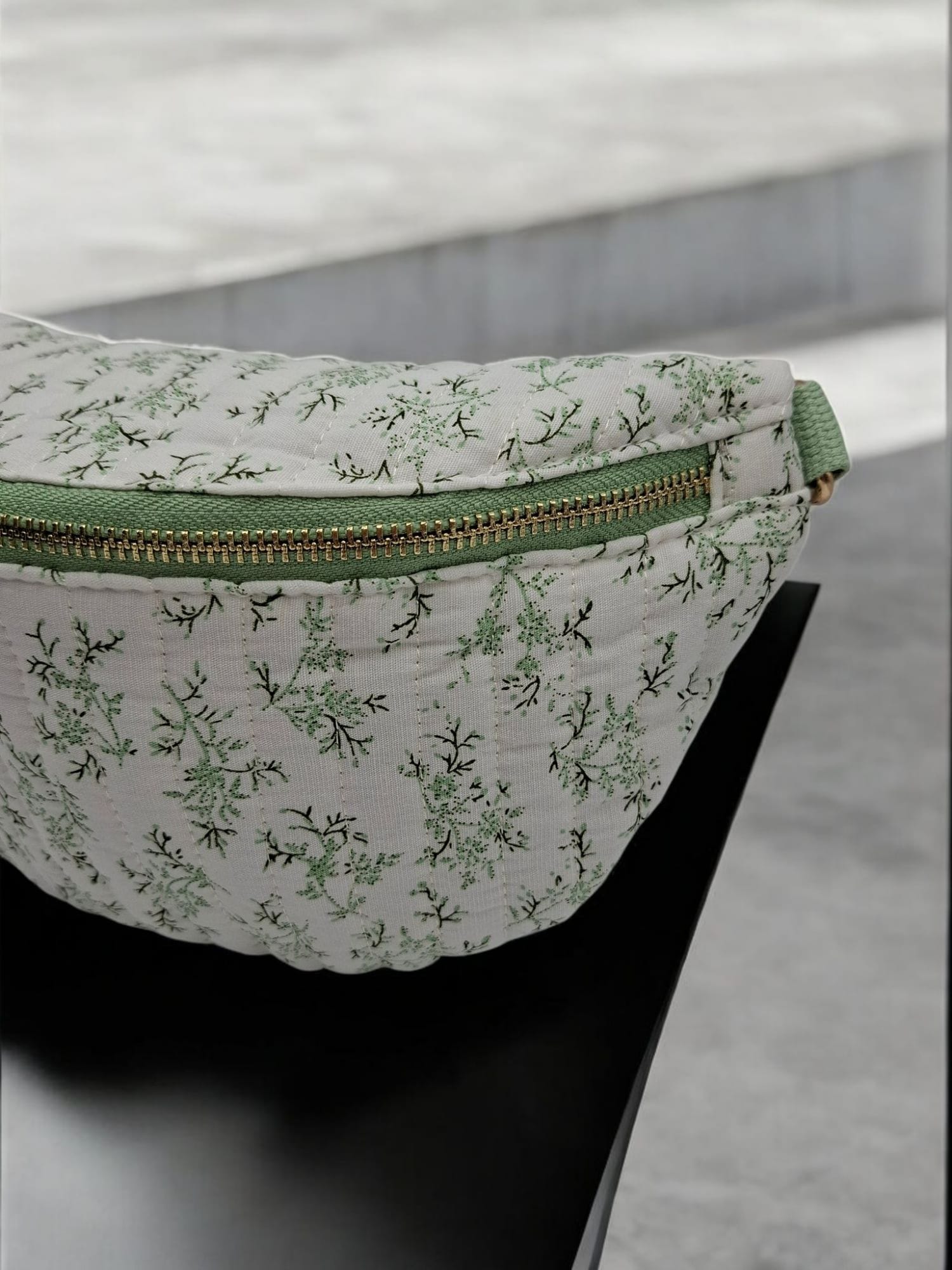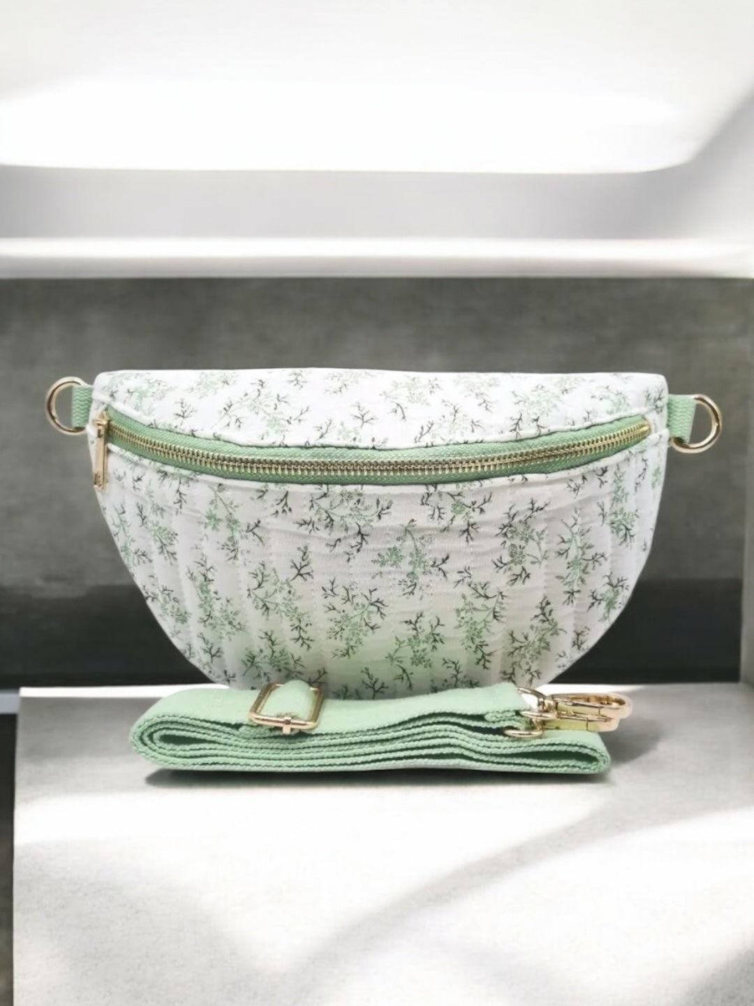 Sac banane en coton matelassé liberty blanc motif floral vert olive