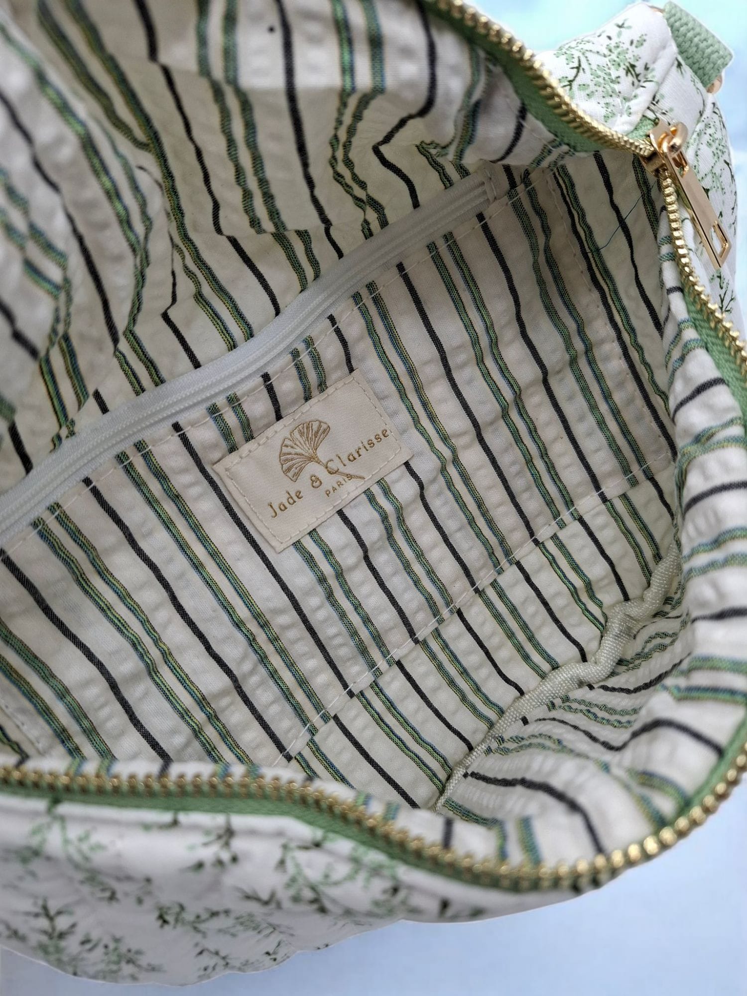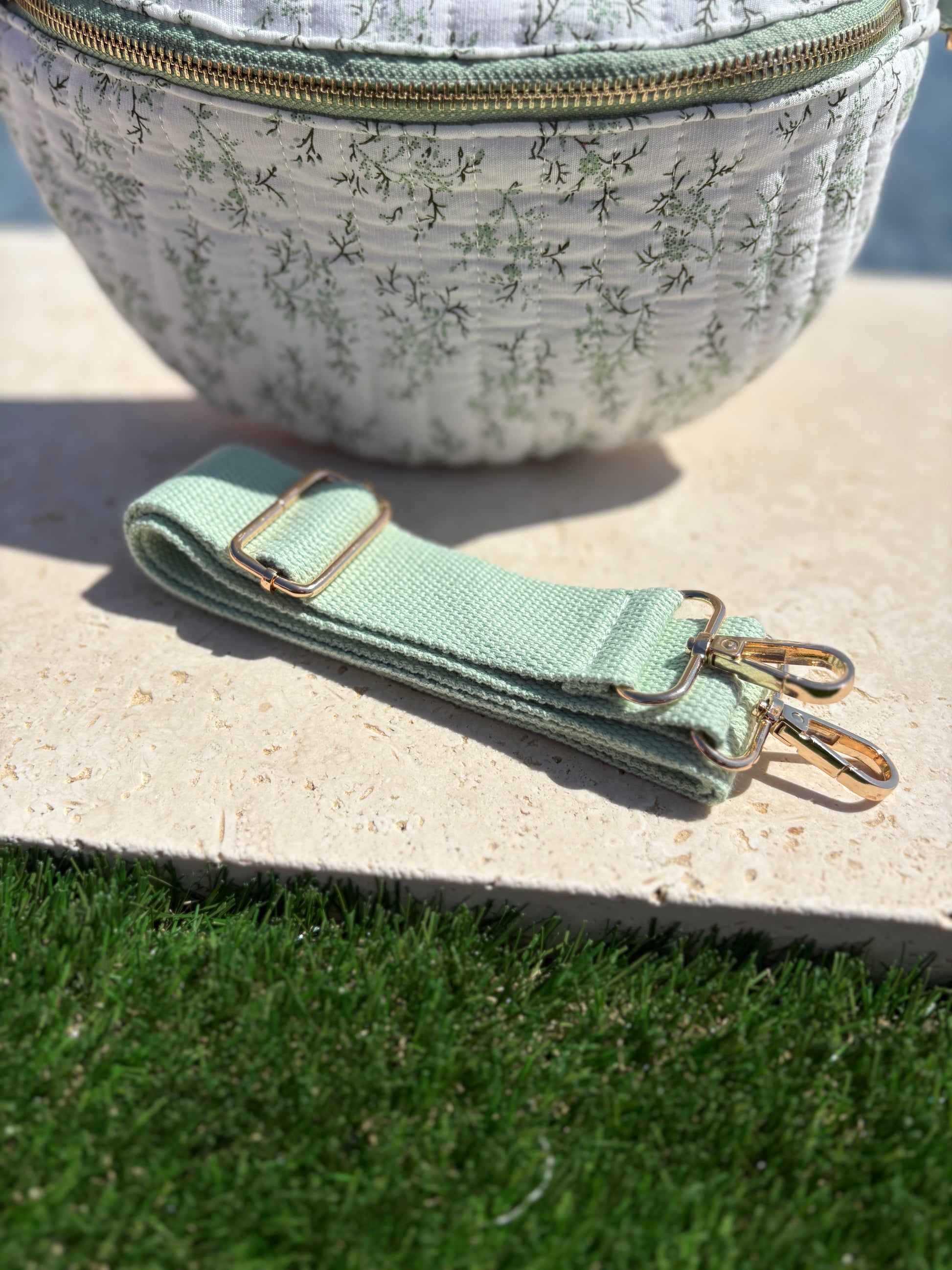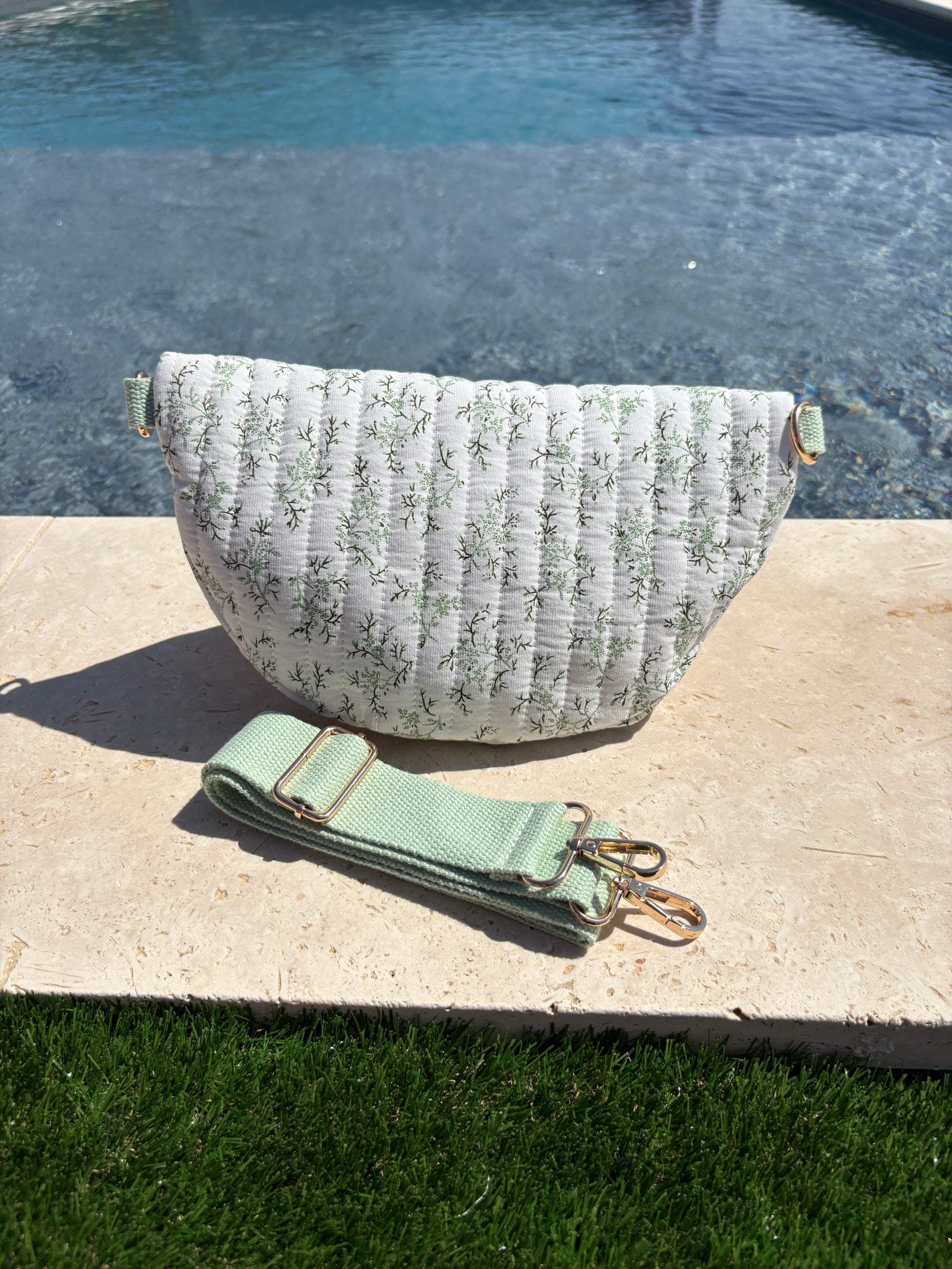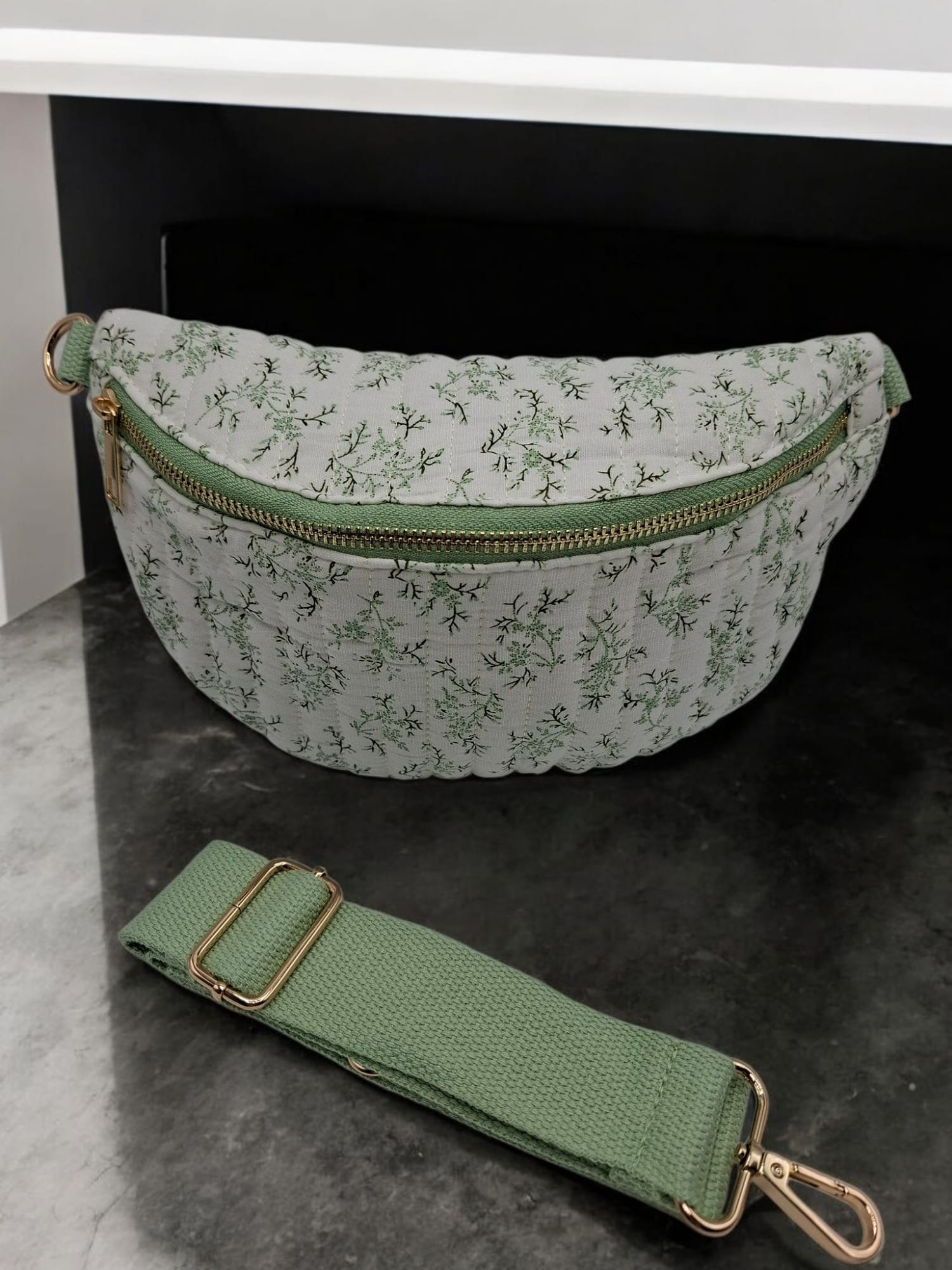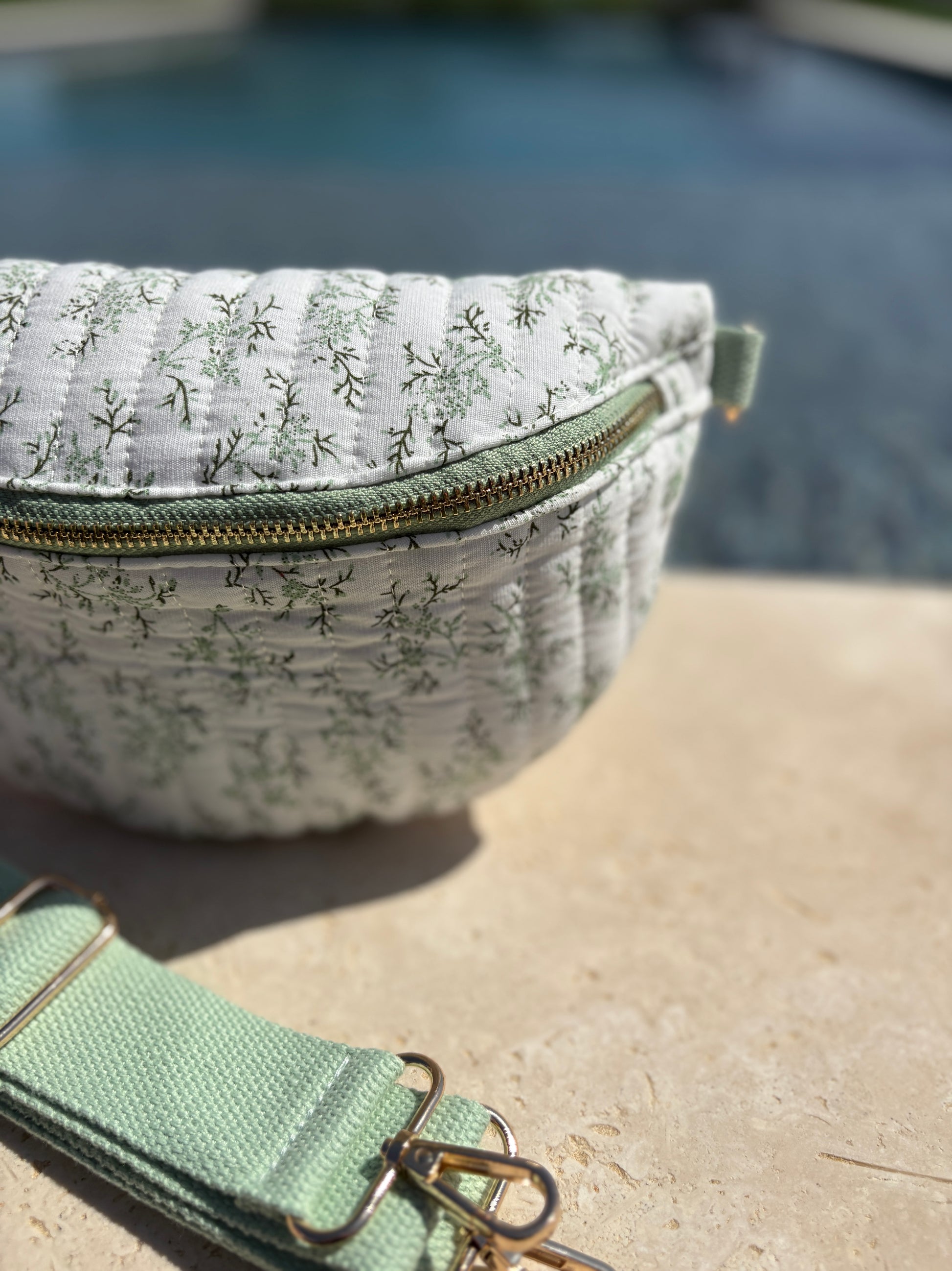Sac banane en coton matelassé liberty blanc motif floral vert olive