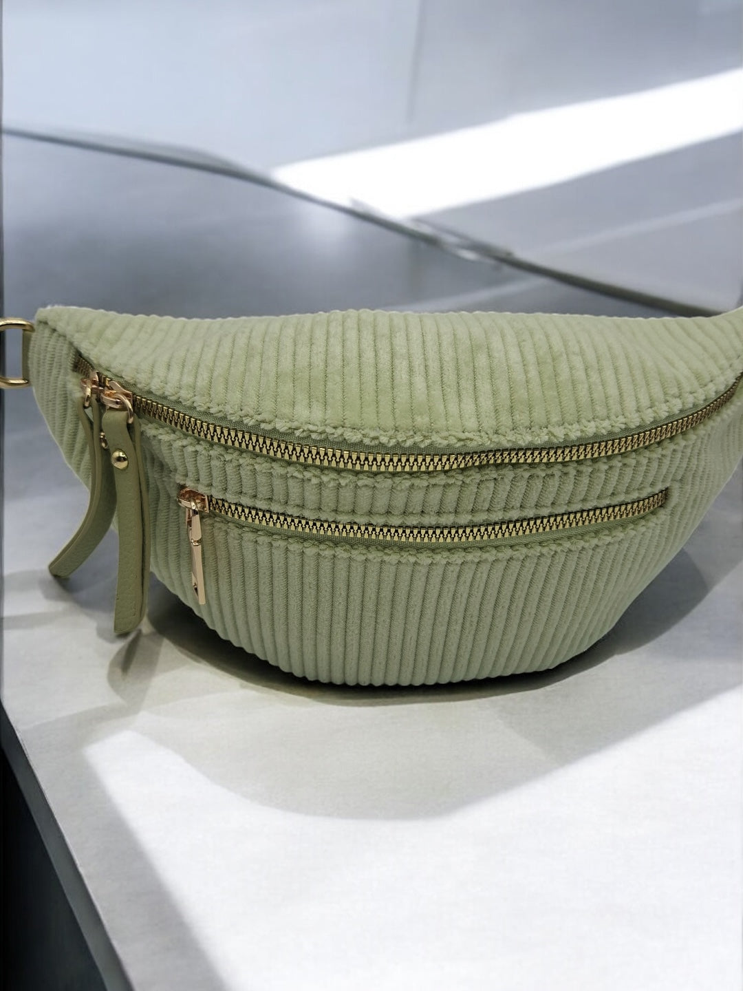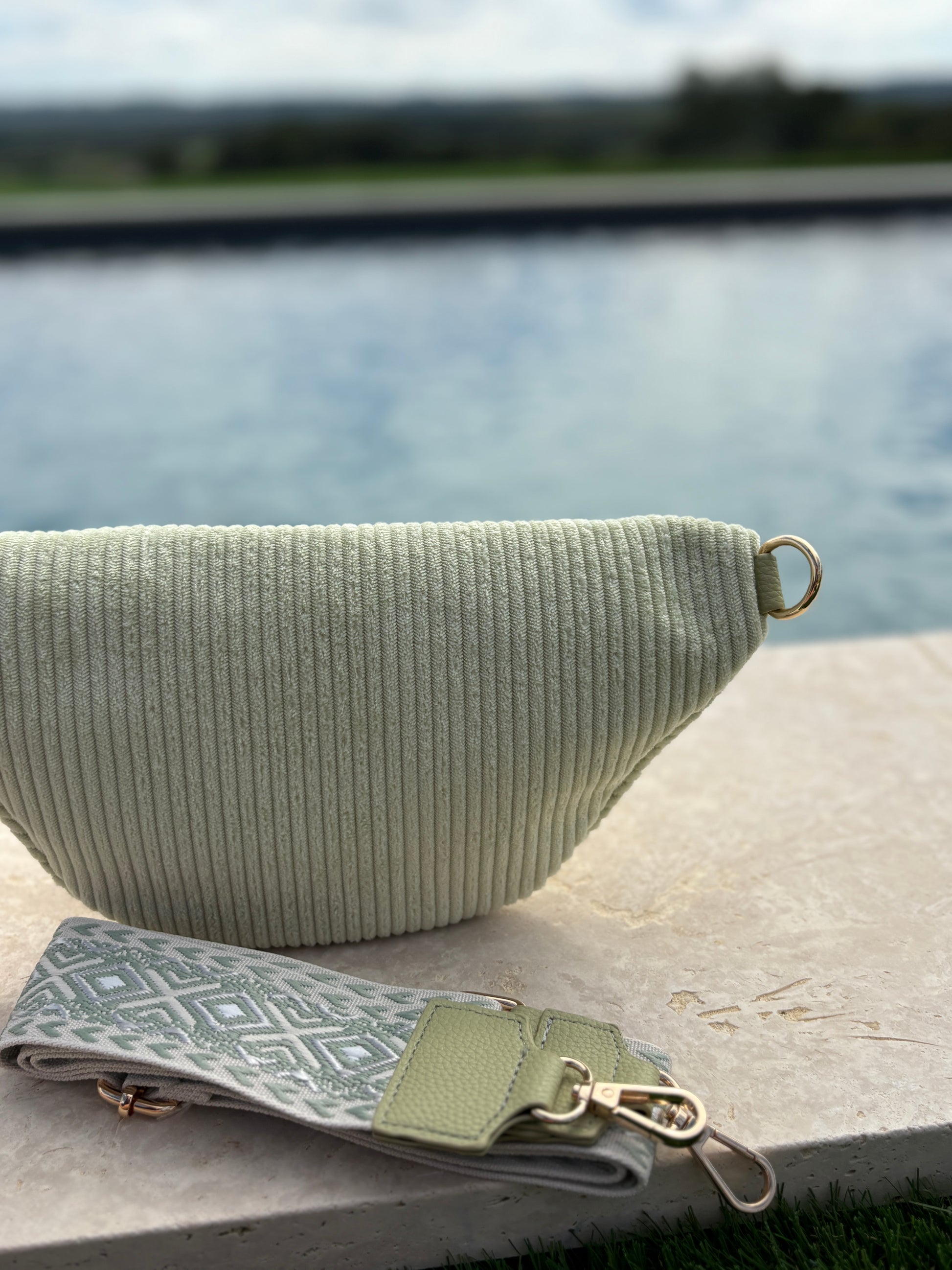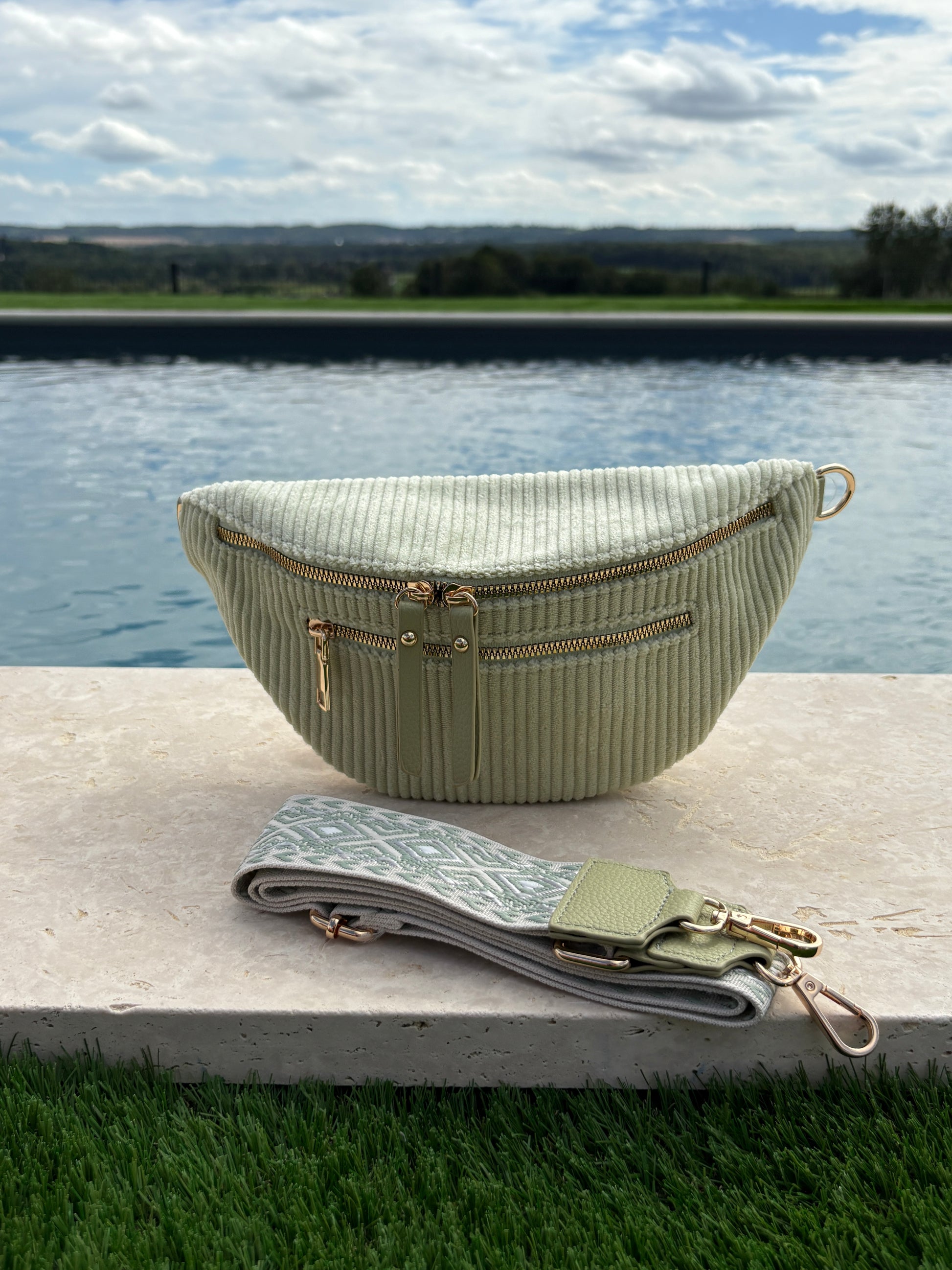 Sac banane velours côtelé 2 poches vert clair vert d'eau sangle fantaisie