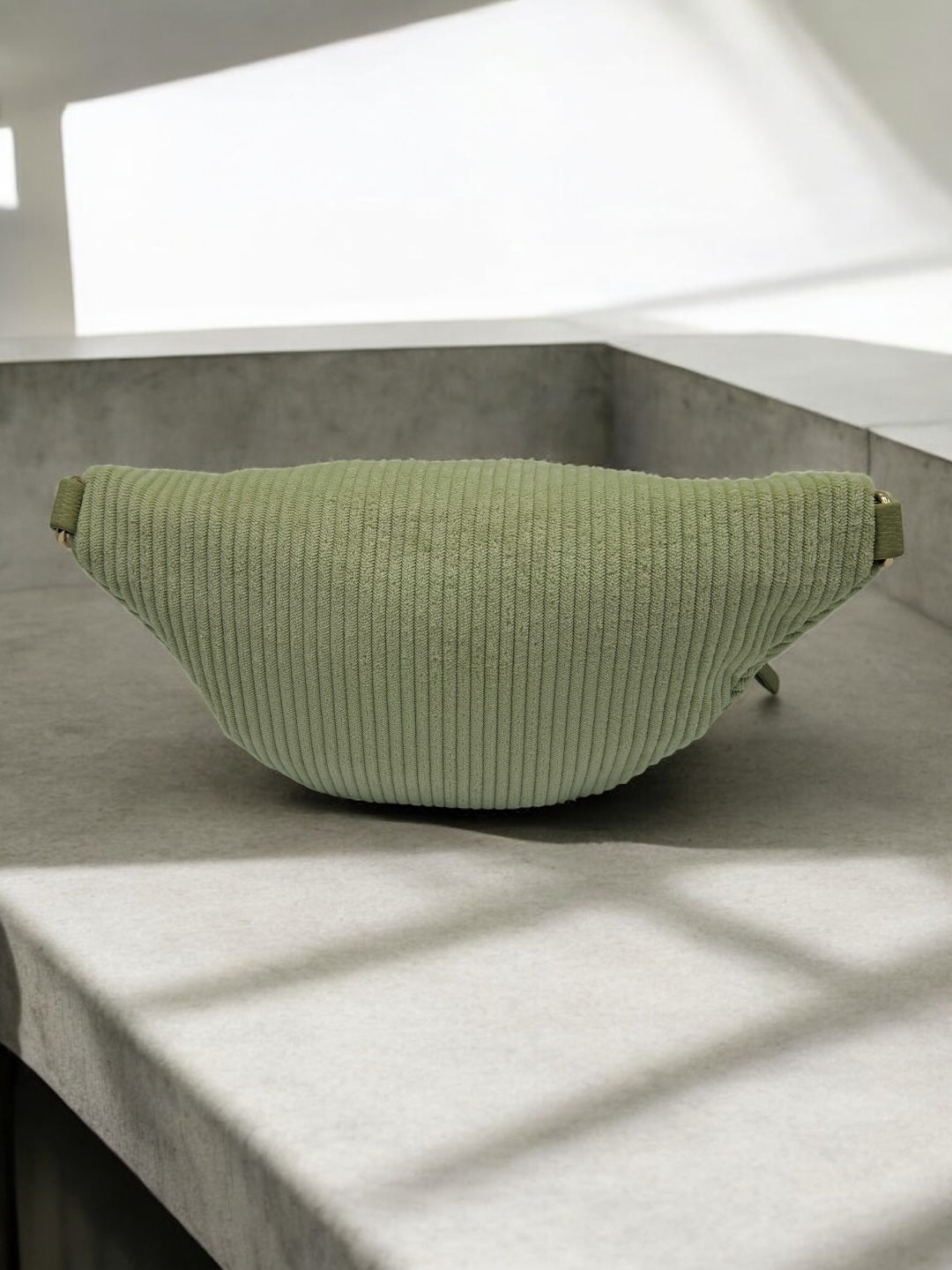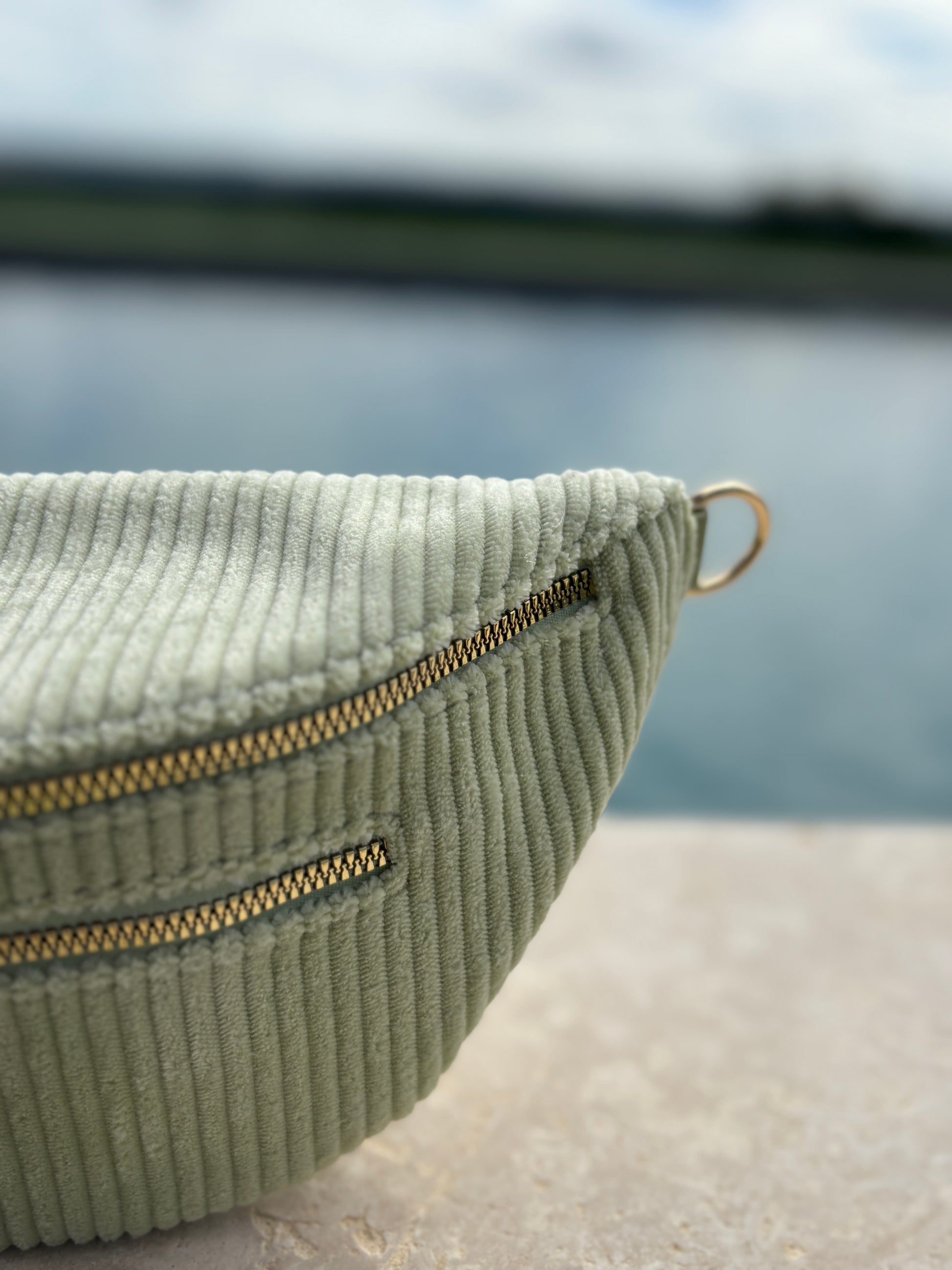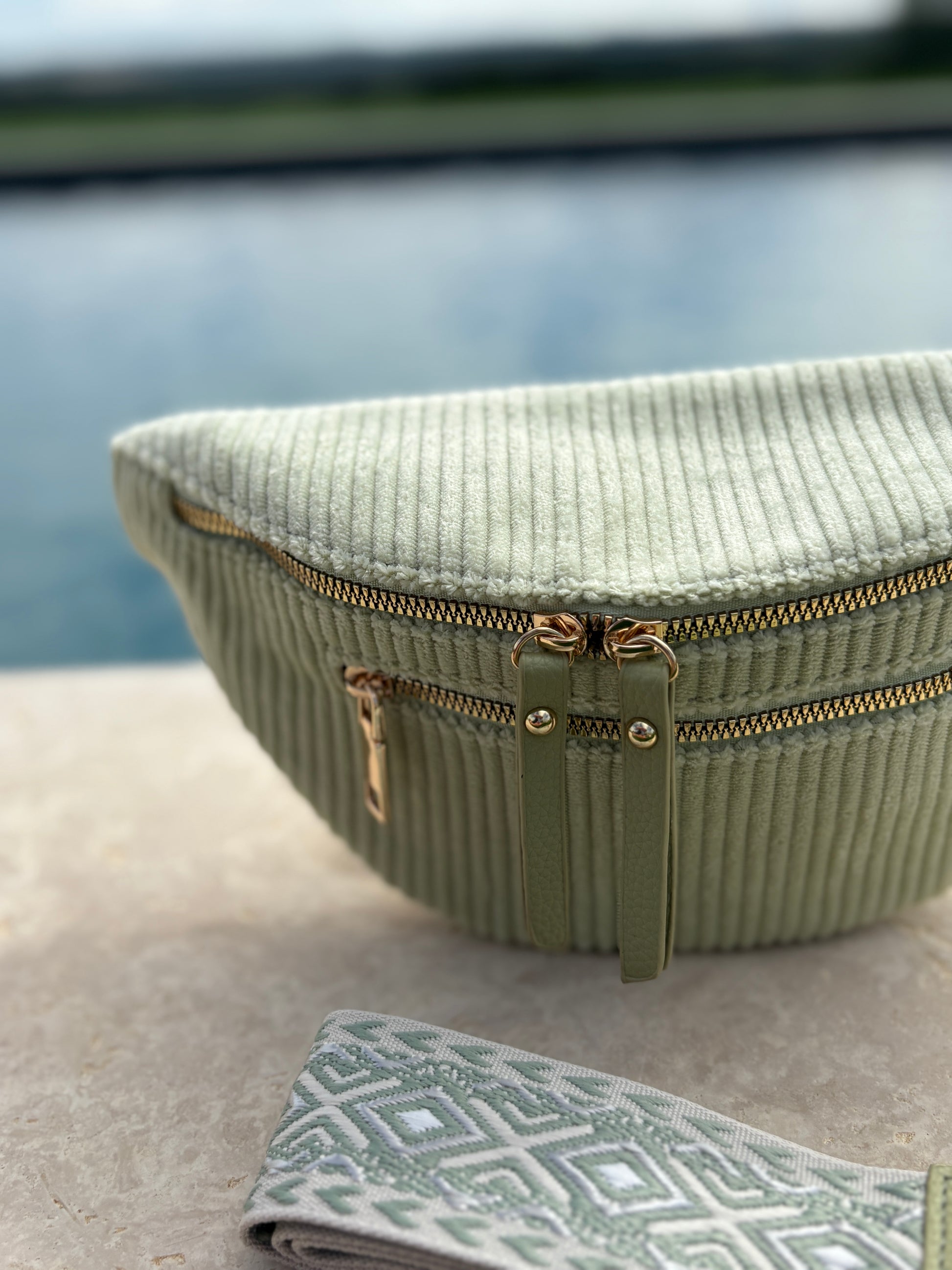 Sac banane velours côtelé 2 poches vert clair vert d'eau sangle fantaisie