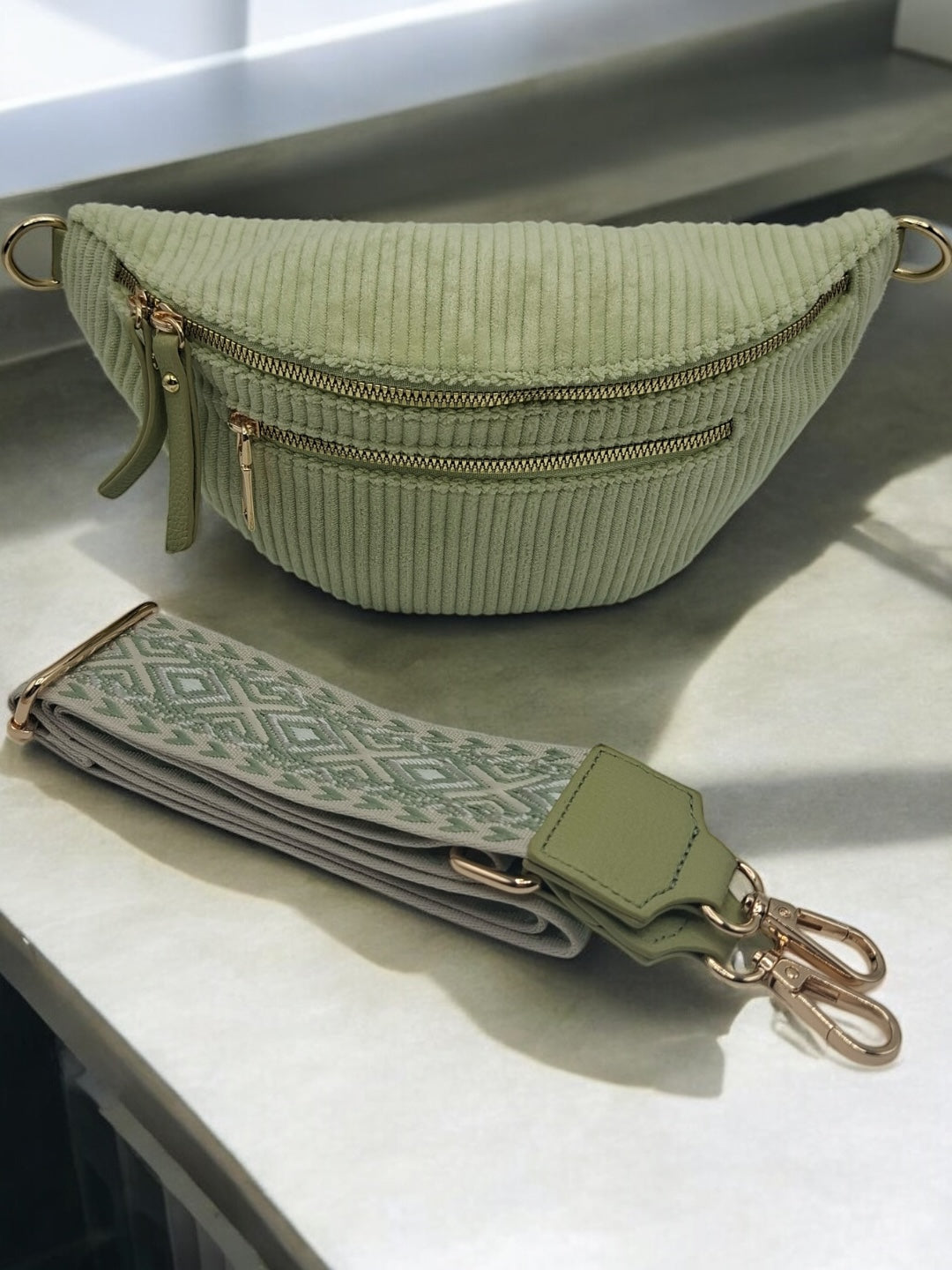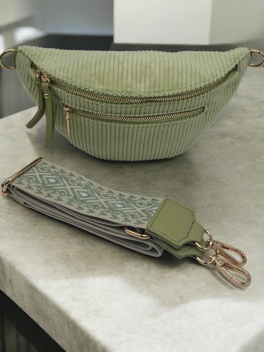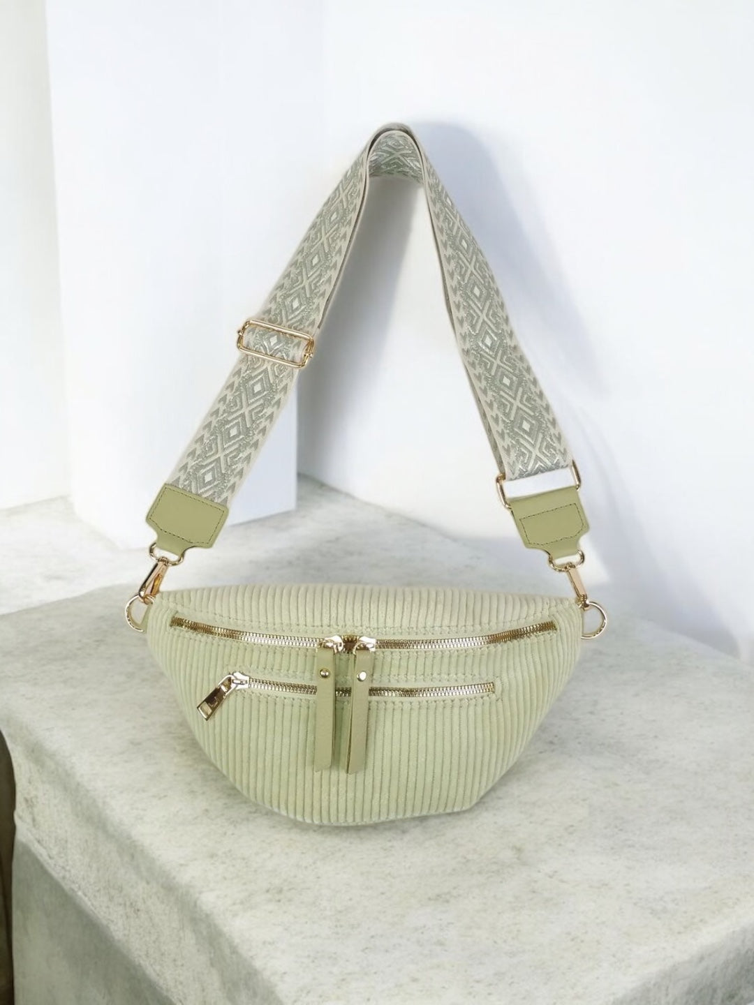 Le sac est en velours côtelé vert clair, offrant une texture douce et agréable au toucher. Il dispose de trois fermetures éclair dorées sur le devant : deux poches principales et une poche secondaire pour plus de fonctionnalité. La sangle est ajustable, large, et ornée d'un motif géométrique, ce qui améliore le confort de port et ajoute un détail visuel intéressant. Les attaches dorées apportent une finition élégante au sac.