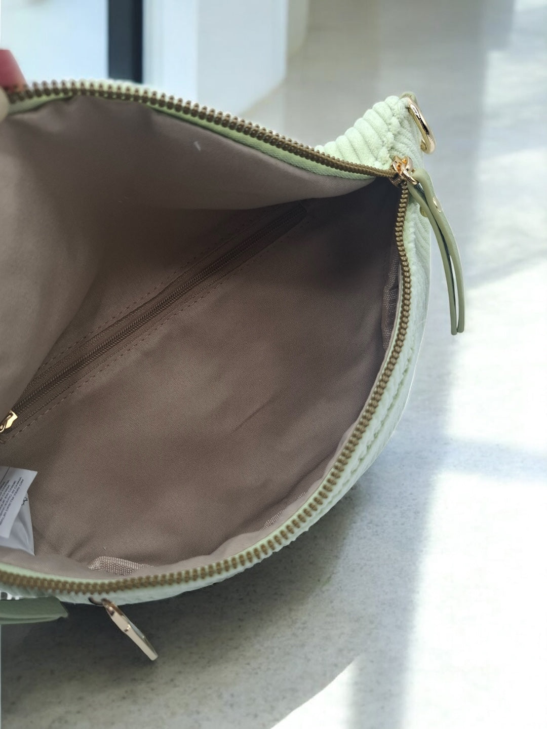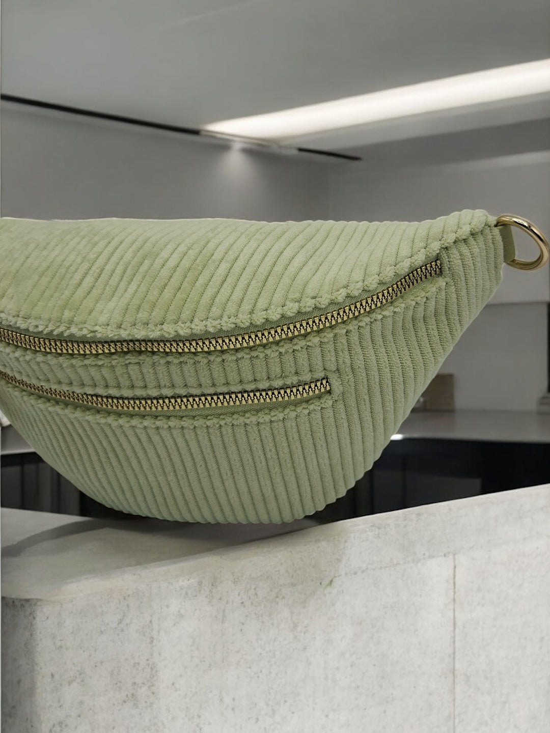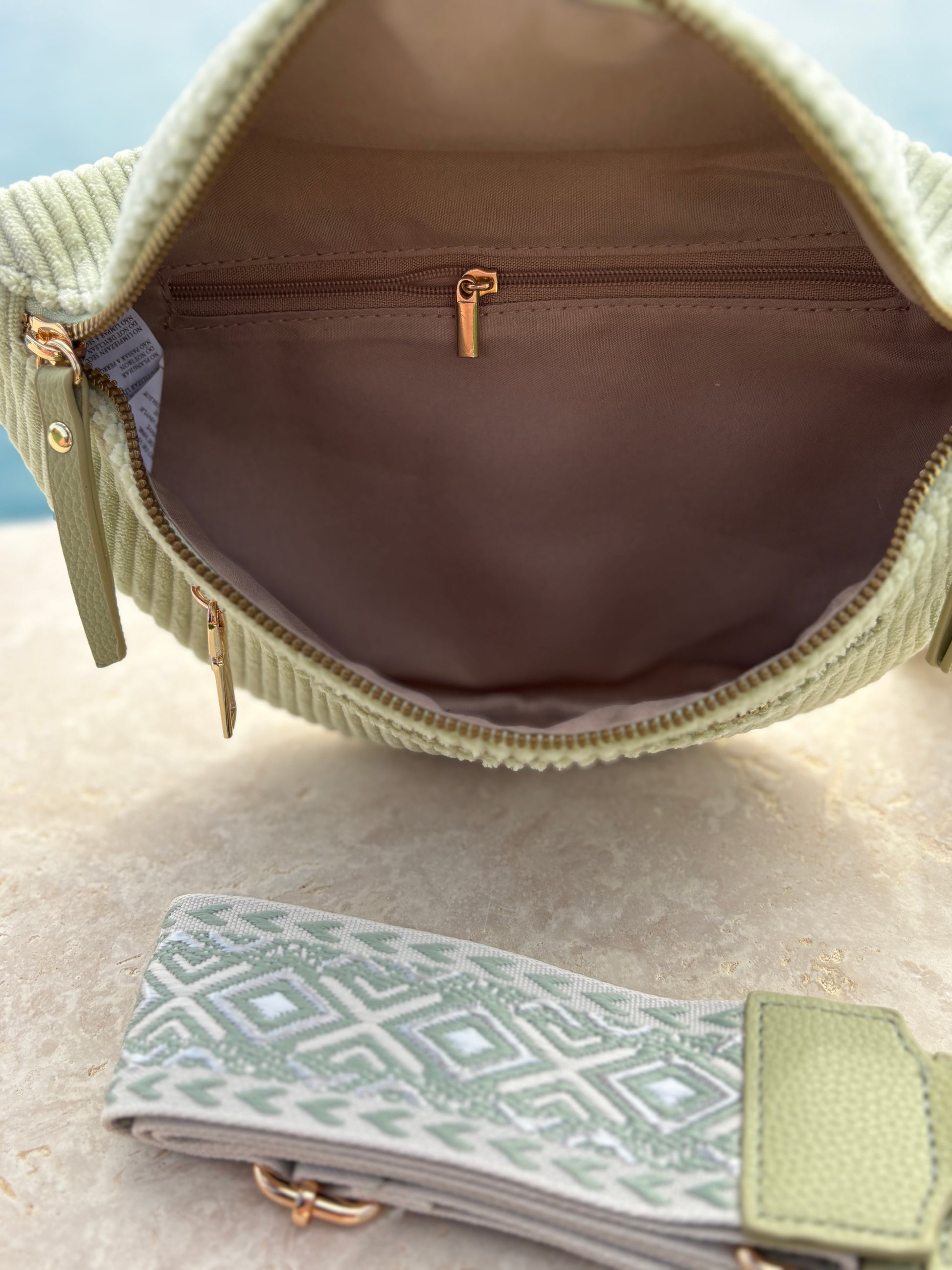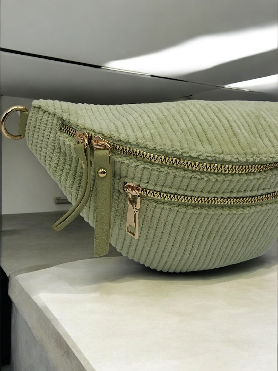 Le sac est en velours côtelé vert clair, offrant une texture douce et agréable au toucher. Il dispose de trois fermetures éclair dorées sur le devant : deux poches principales et une poche secondaire pour plus de fonctionnalité. La sangle est ajustable, large, et ornée d'un motif géométrique, ce qui améliore le confort de port et ajoute un détail visuel intéressant. Les attaches dorées apportent une finition élégante au sac.