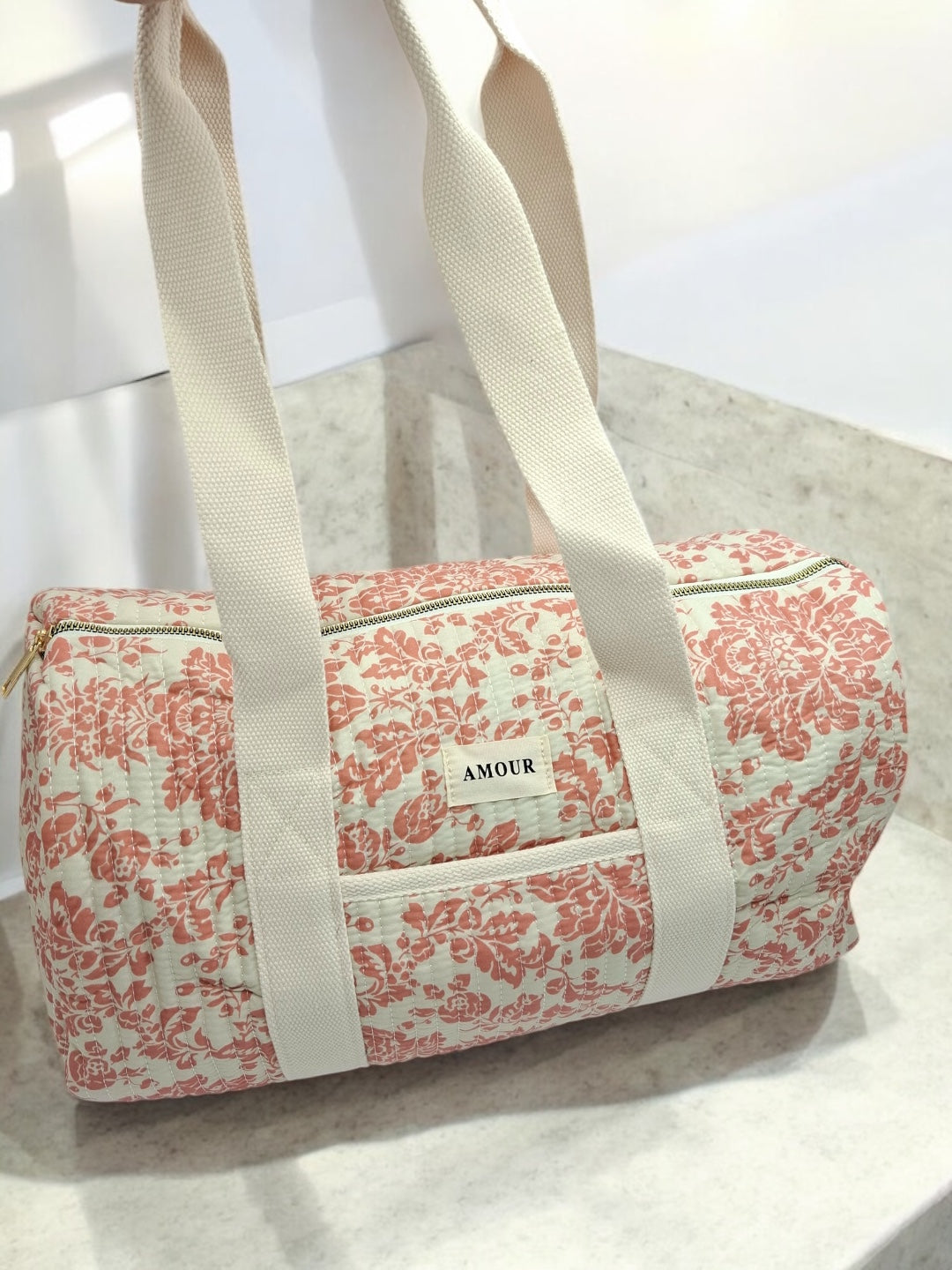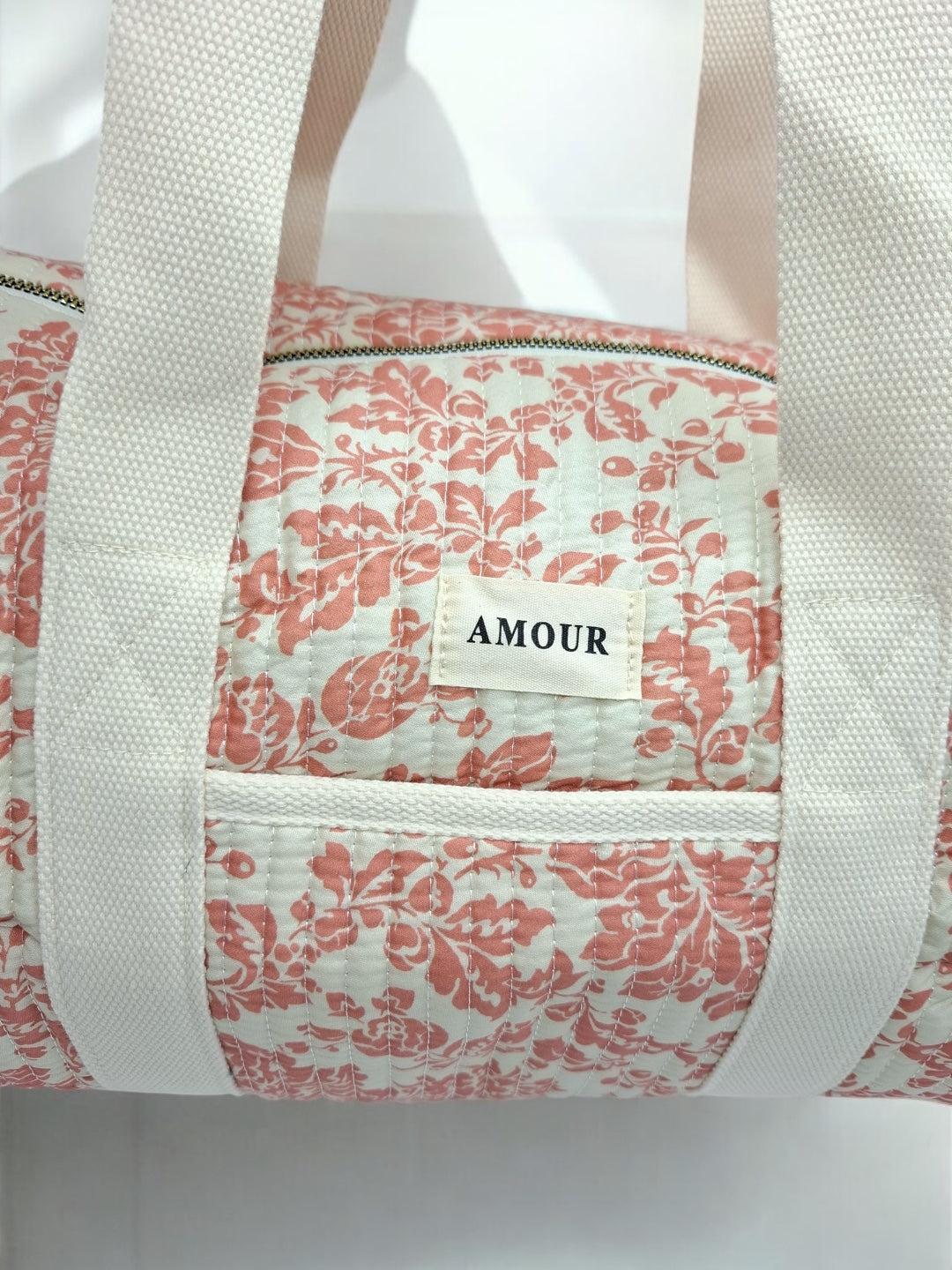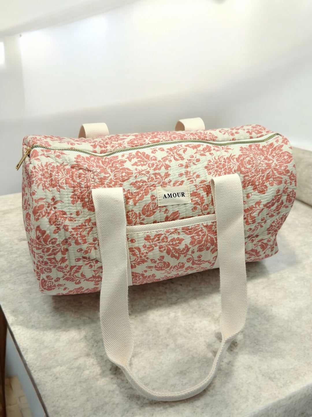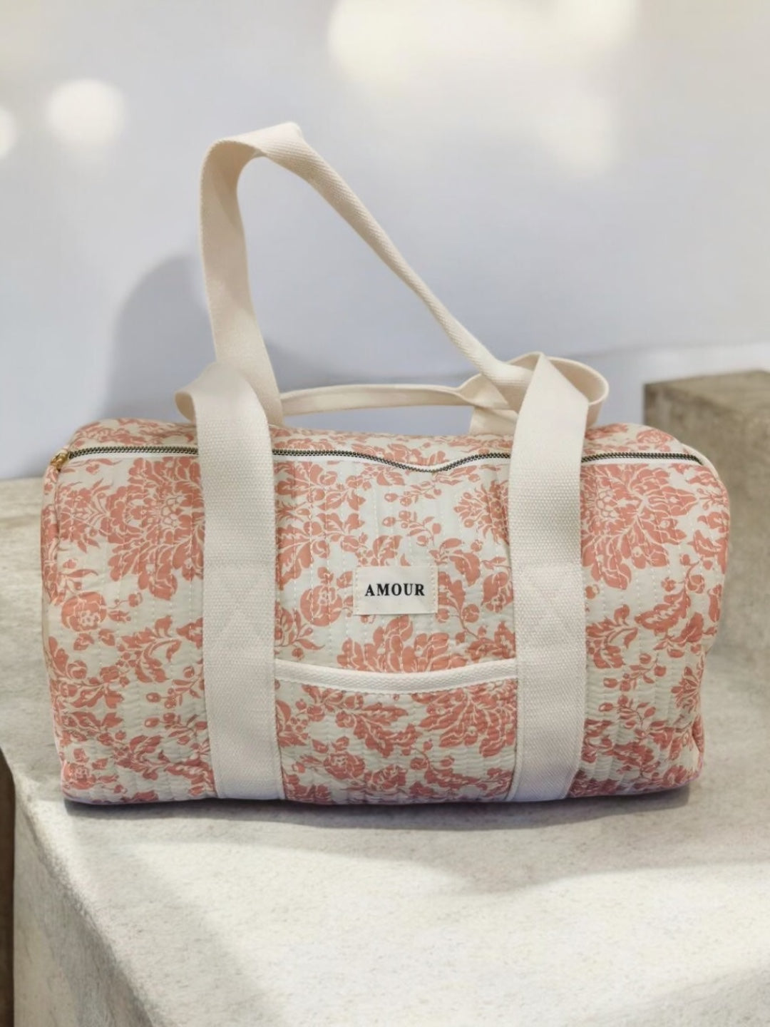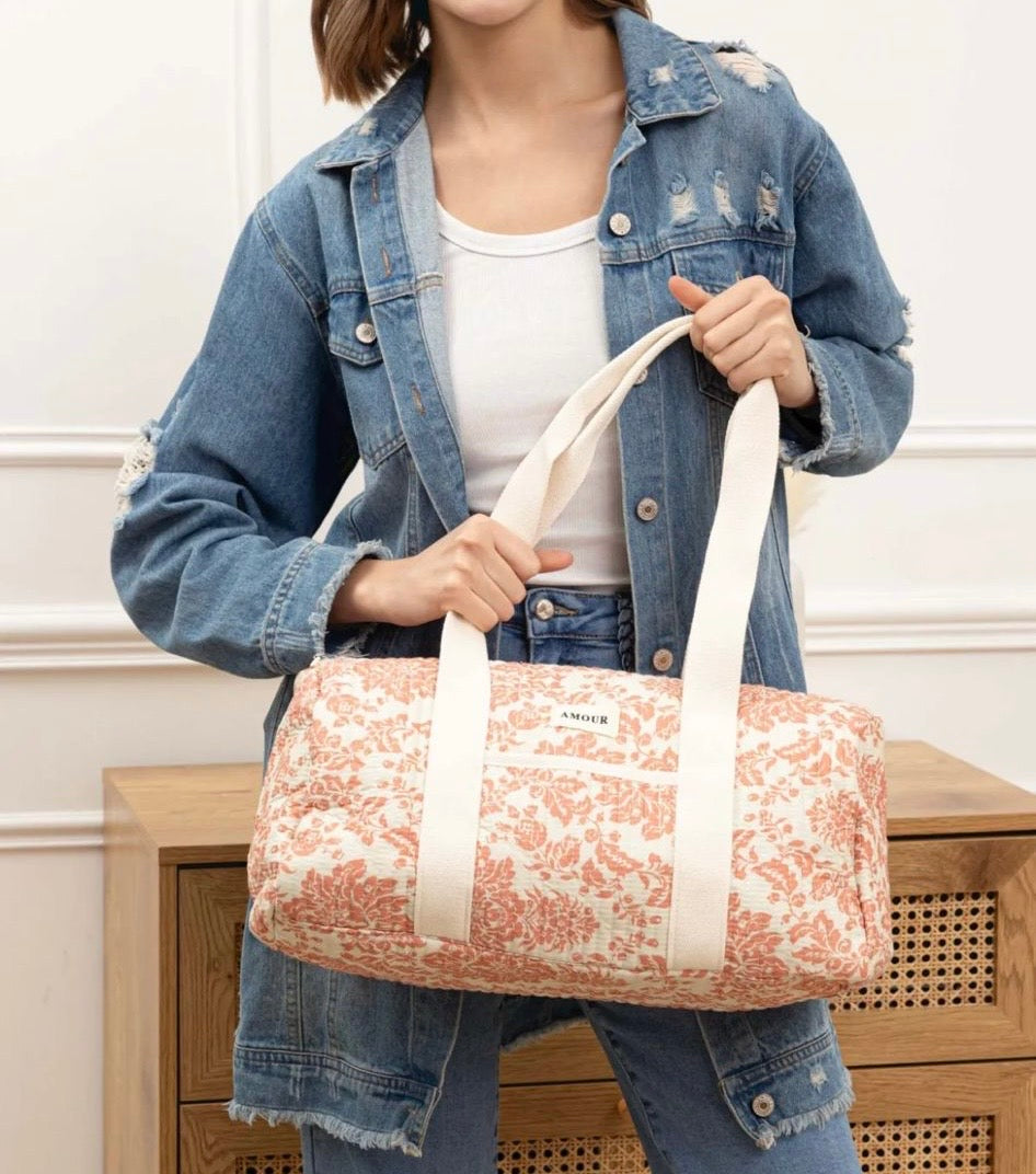 Ce sac de voyage présente un fond blanc orné d'un motif floral en corail. Une étiquette blanche avec le mot "Amour" est visible à l'avant du sac. Il possède des anses épaisses de couleur blanche pour un port à l'épaule ou à la main. Le sac se ferme à l'aide d'une fermeture éclair métallique dorée qui ajoute une touche d'élégance. Le design est à la fois pratique et esthétique, parfait pour transporter vos effets personnels lors de courts séjours.