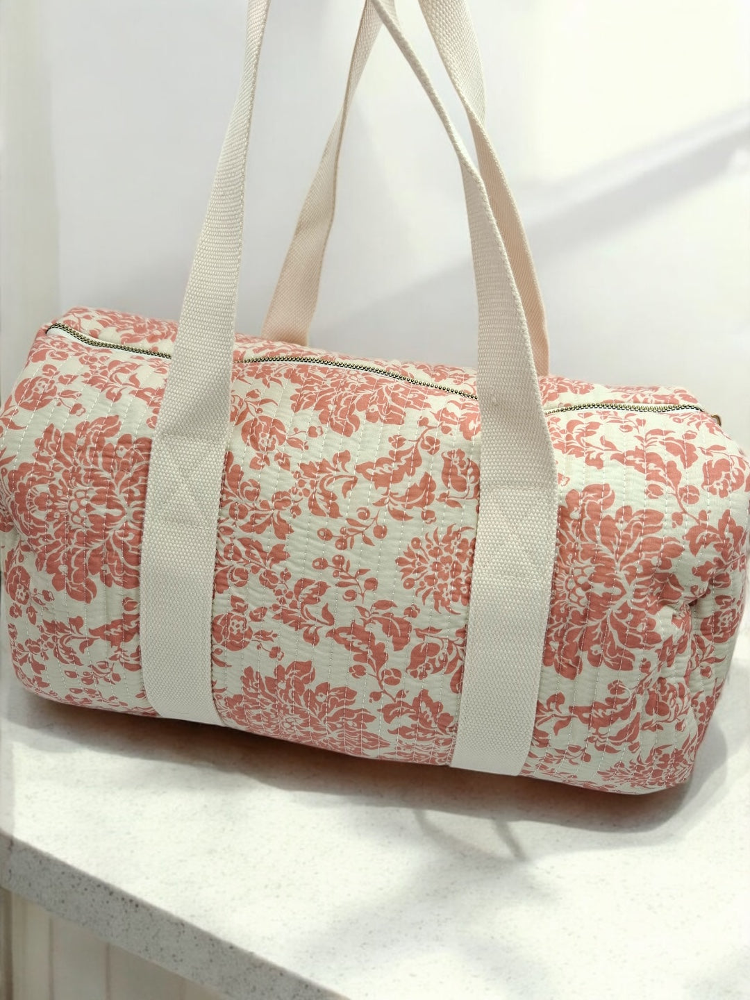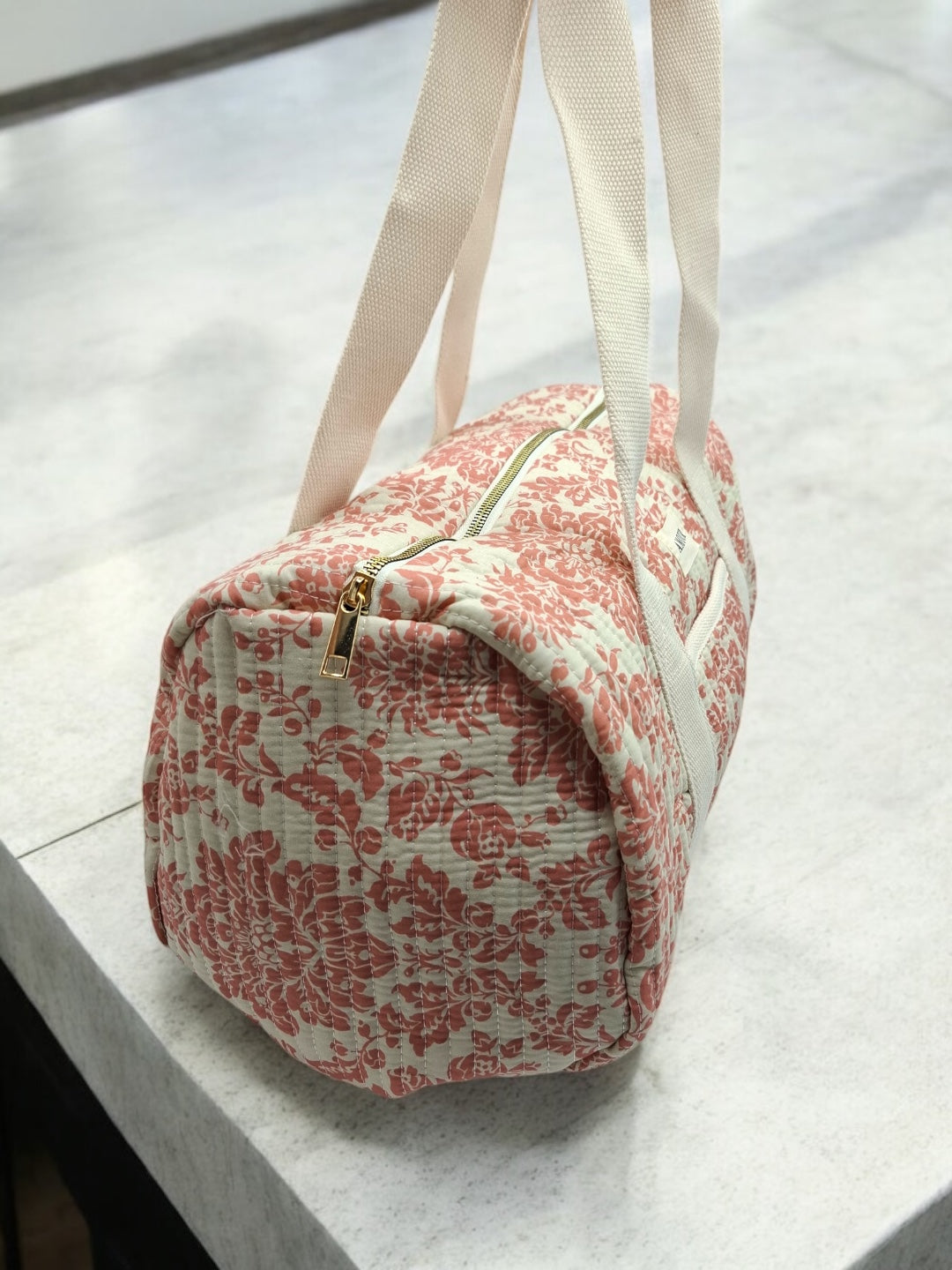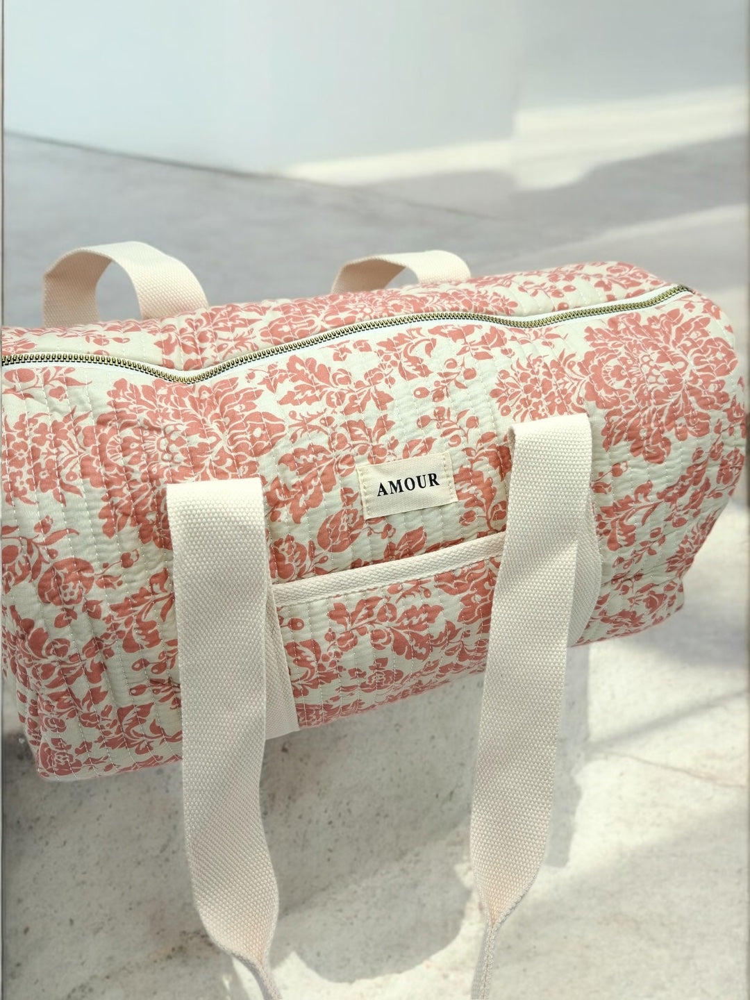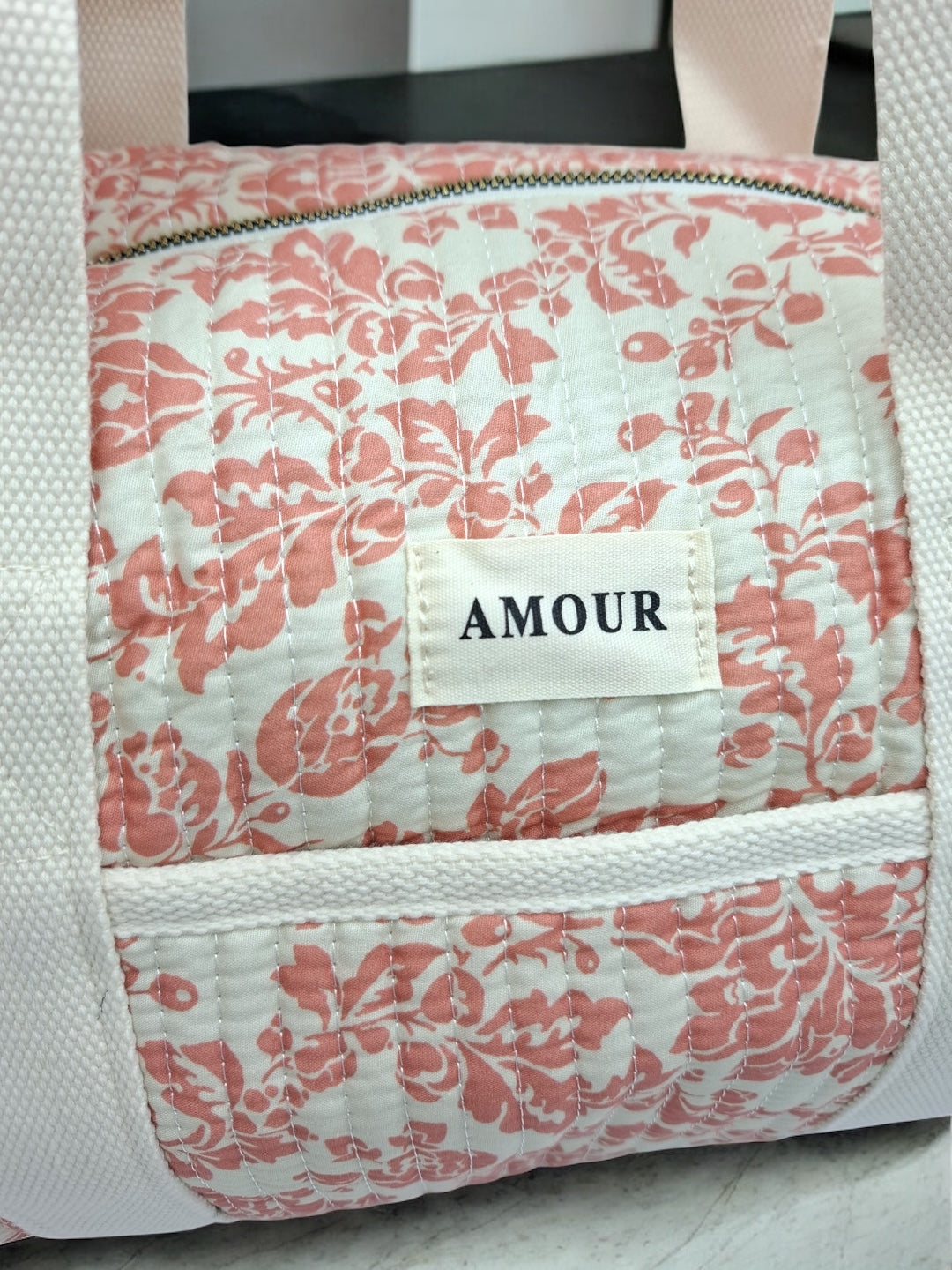 Ce sac de voyage présente un fond blanc orné d'un motif floral en corail. Une étiquette blanche avec le mot "Amour" est visible à l'avant du sac. Il possède des anses épaisses de couleur blanche pour un port à l'épaule ou à la main. Le sac se ferme à l'aide d'une fermeture éclair métallique dorée qui ajoute une touche d'élégance. Le design est à la fois pratique et esthétique, parfait pour transporter vos effets personnels lors de courts séjours.