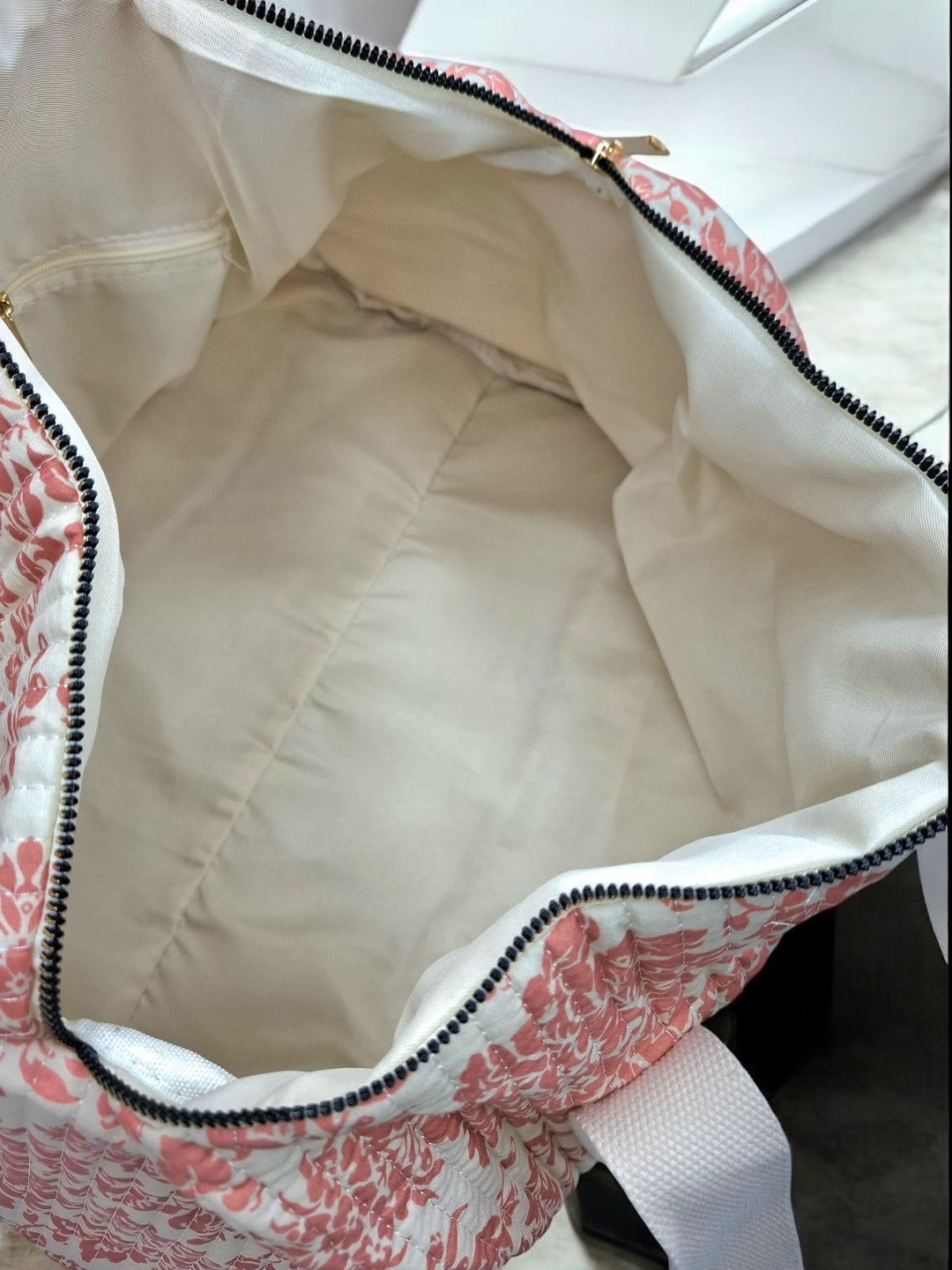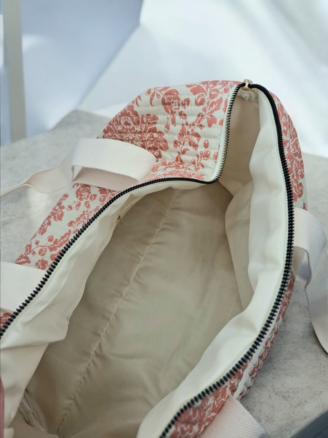 Sac polochon blanc en coton liberty fleuri corail