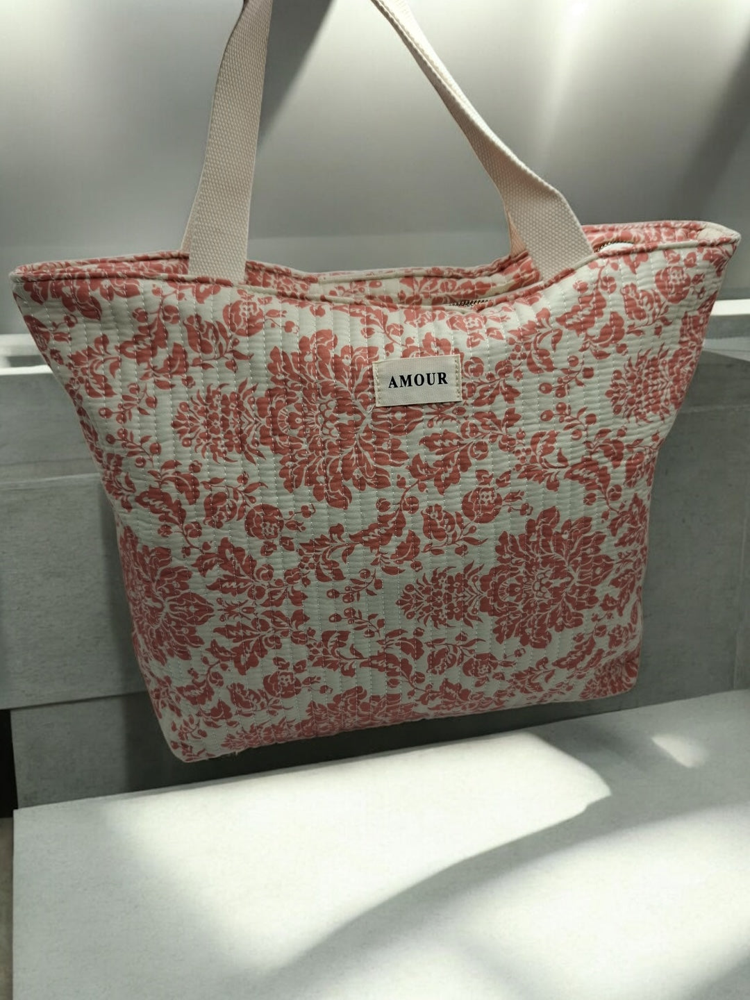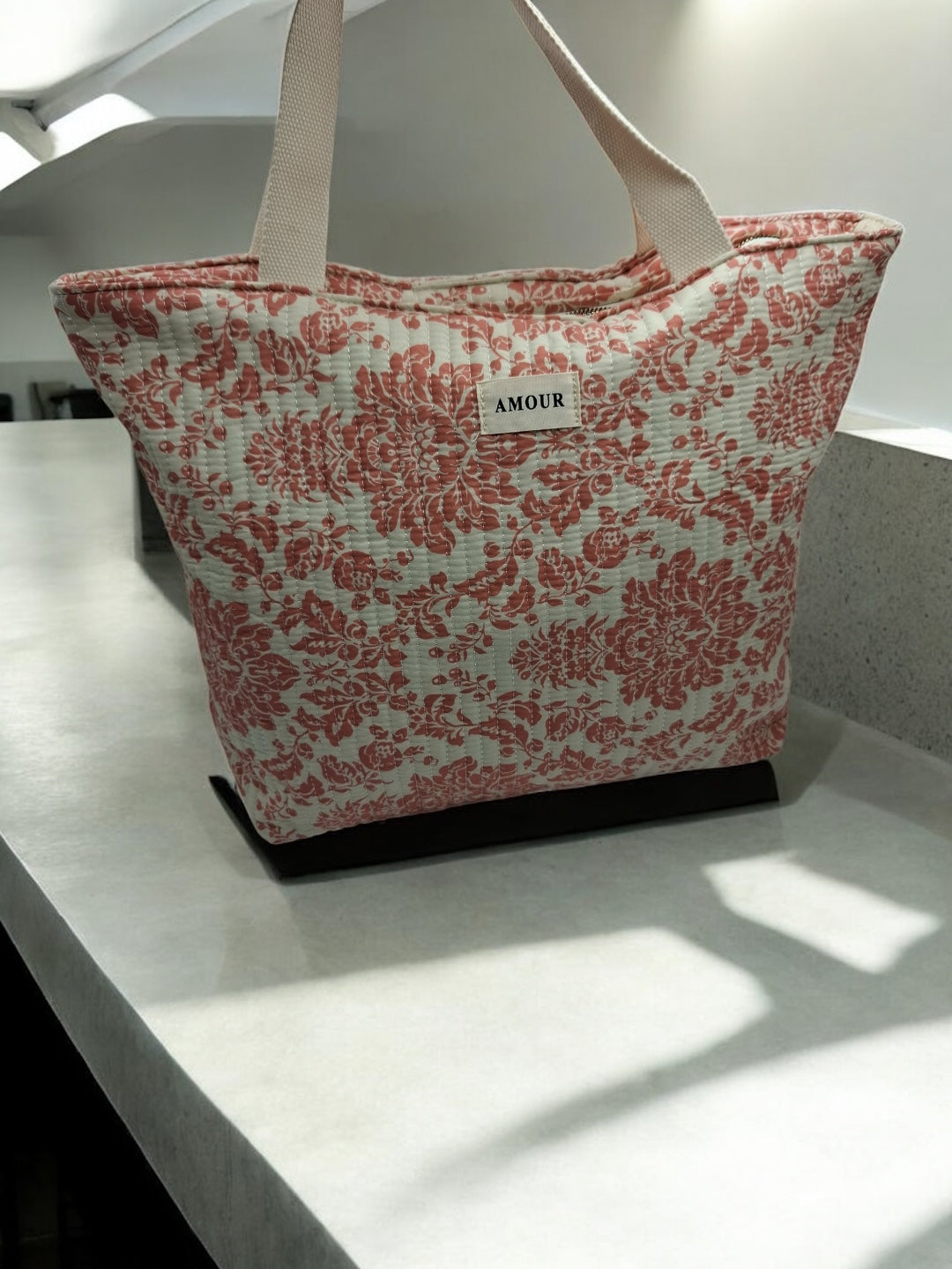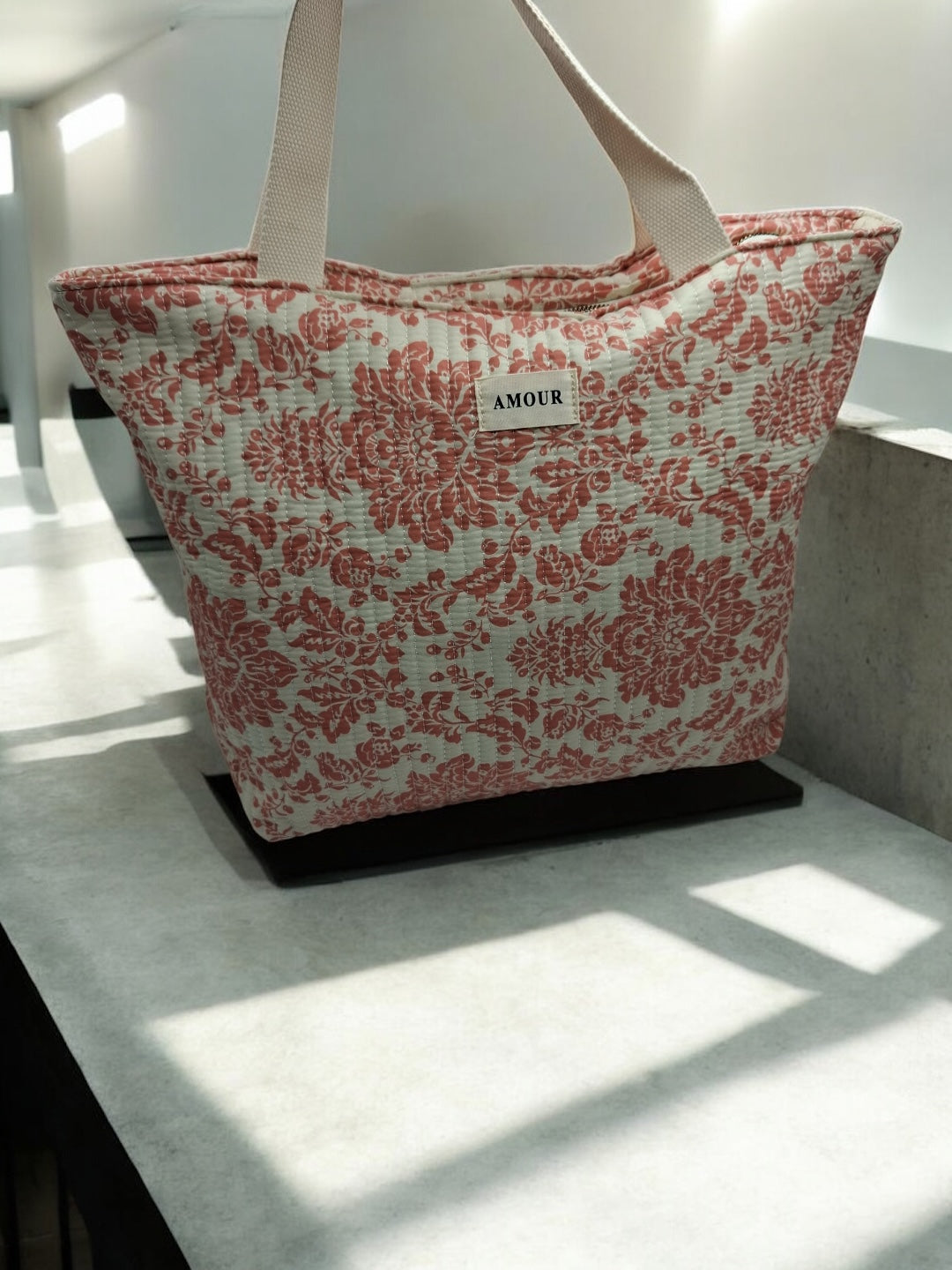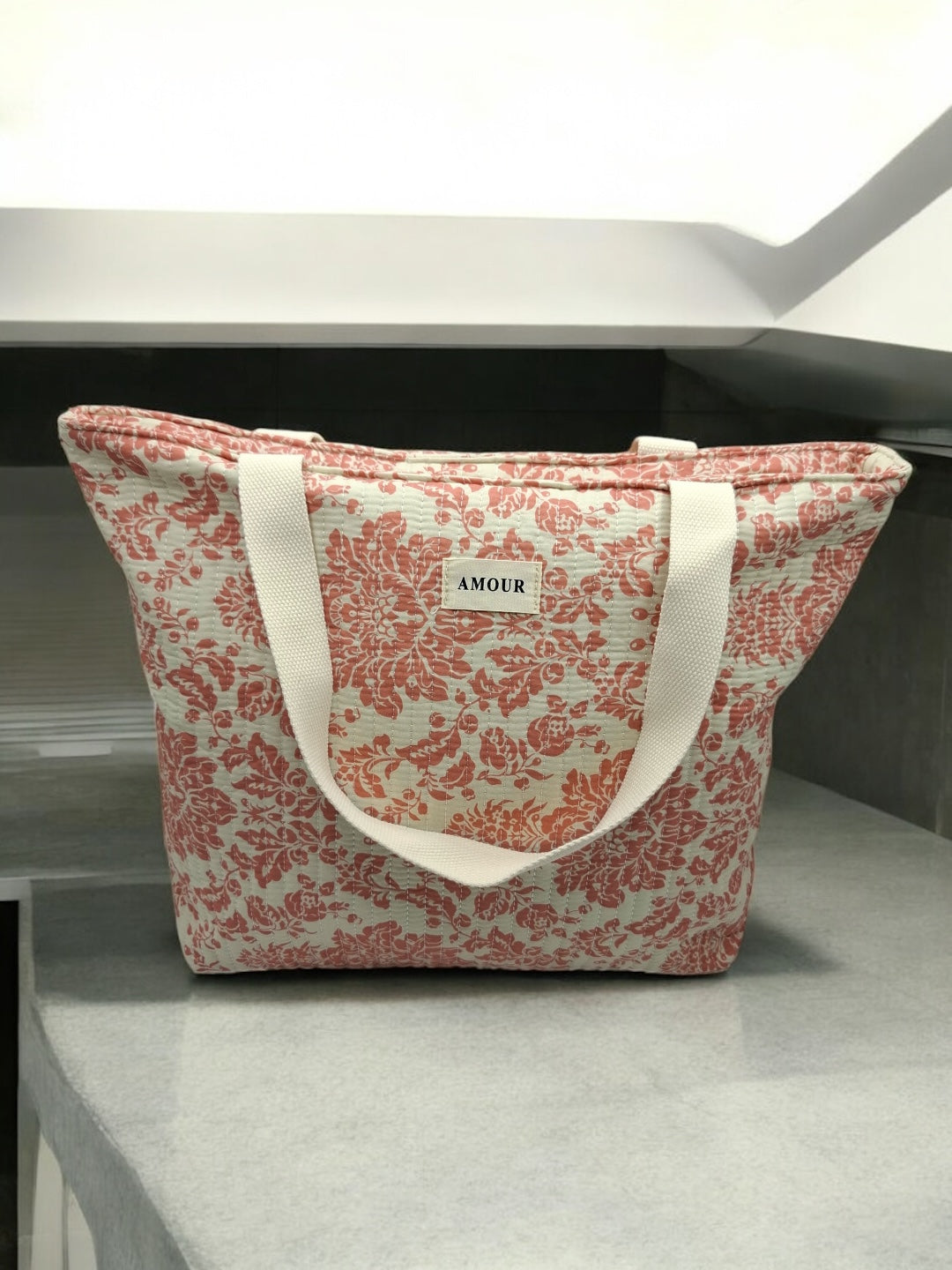 Ce sac cabas présente un imprimé floral en rose sur un fond beige qui lui confère une touche romantique. Il est doté de deux anses en tissu résistant pour un porté à l'épaule confortable. Le logo « Amour » est discrètement apposé à l'avant du sac, ajoutant une note de sophistication. La fermeture éclair sur le dessus assure la sécurité des objets transportés.