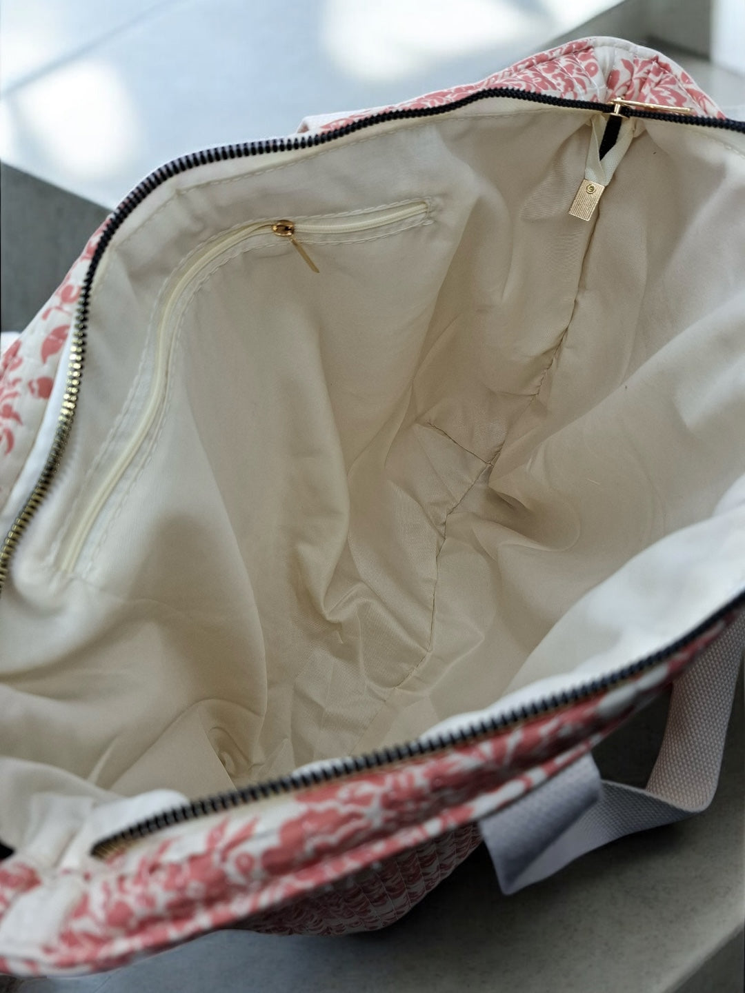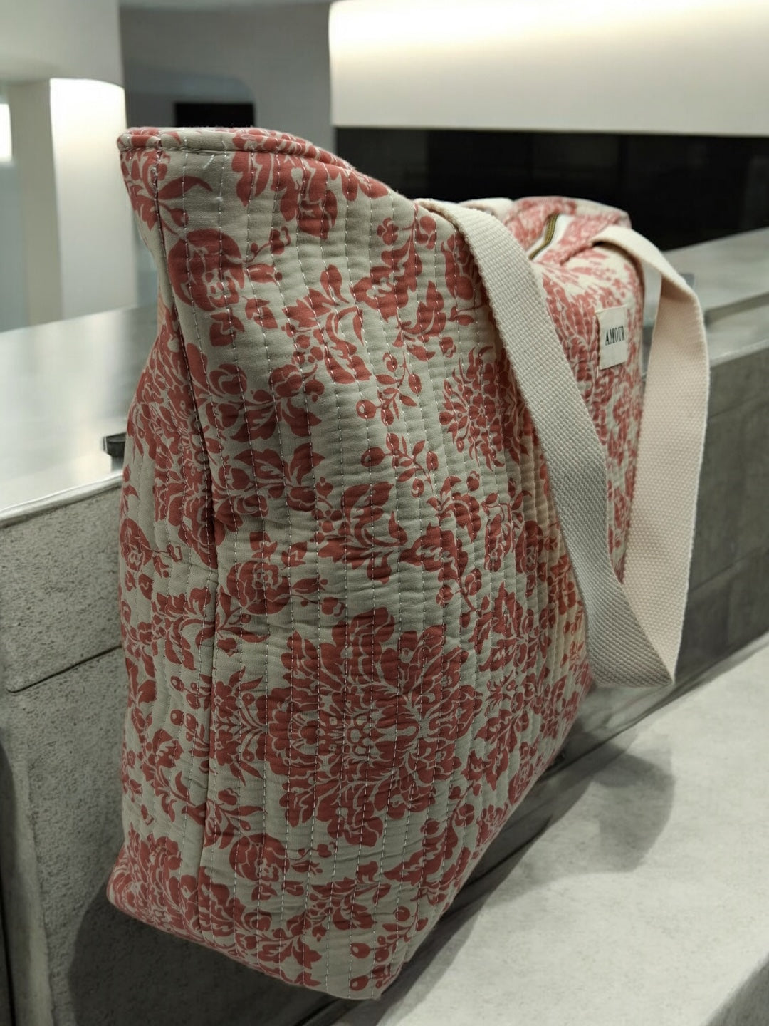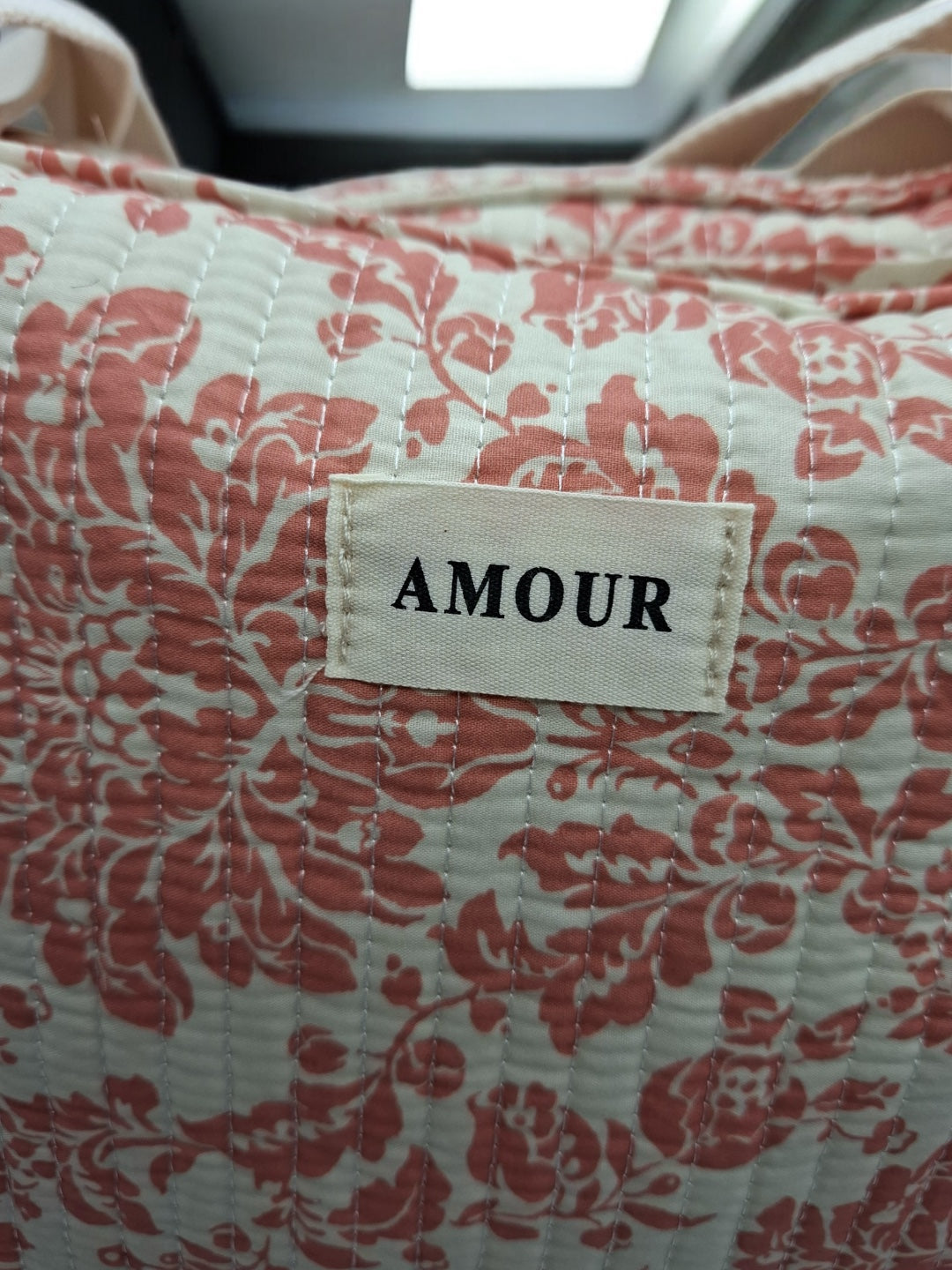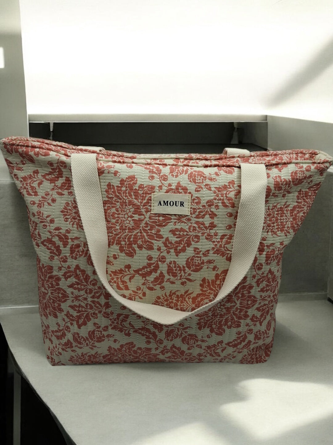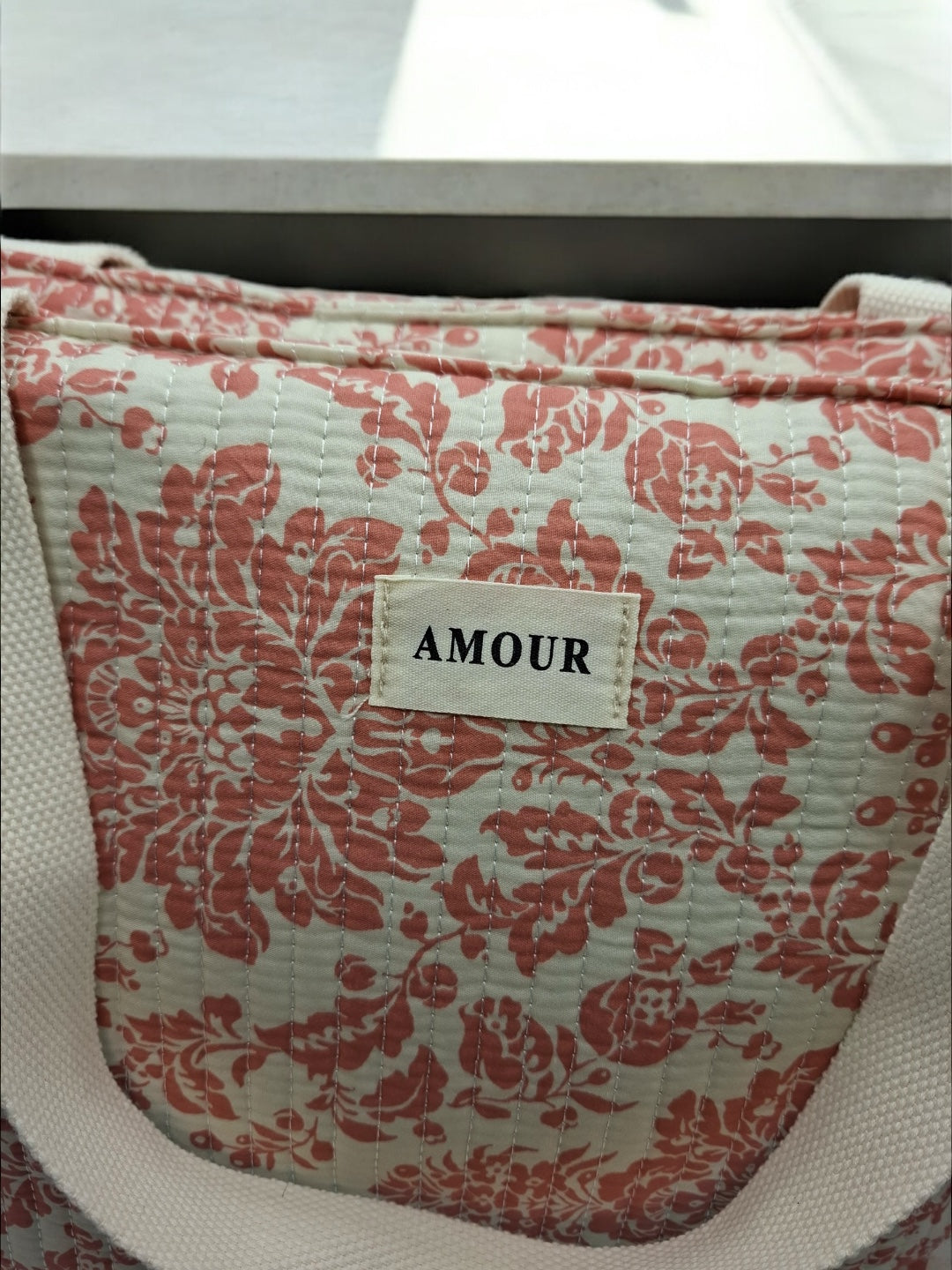 Ce sac cabas présente un imprimé floral en rose sur un fond beige qui lui confère une touche romantique. Il est doté de deux anses en tissu résistant pour un porté à l'épaule confortable. Le logo « Amour » est discrètement apposé à l'avant du sac, ajoutant une note de sophistication. La fermeture éclair sur le dessus assure la sécurité des objets transportés.