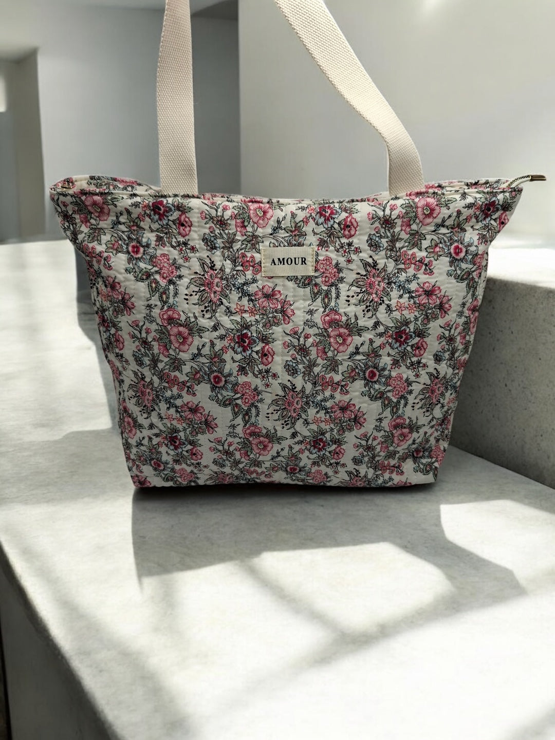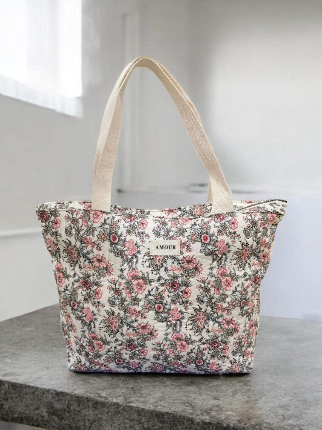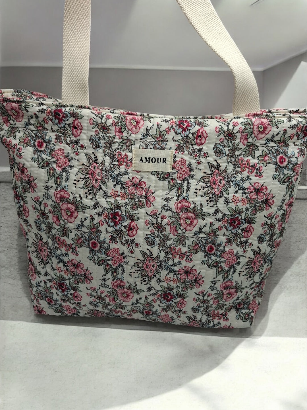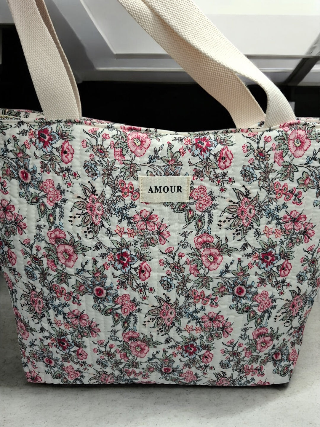 Le sac est de grande taille, idéal pour transporter de nombreux objets. Le design est orné de motifs floraux roses et noirs sur un fond beige, offrant une allure douce et romantique. Les poignées sont de couleur beige, assorties au fond du sac, et semblent robustes pour un port confortable. Une étiquette blanche avec le mot "AMOUR" est cousue au centre de la face avant, ajoutant une touche distinctive à l'ensemble.