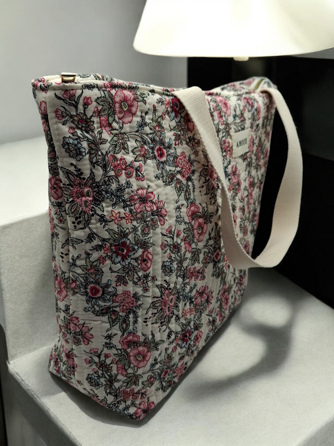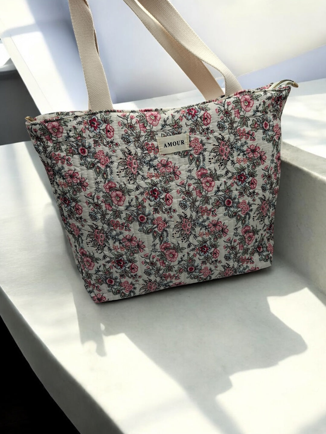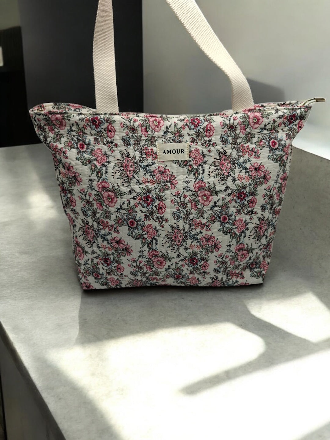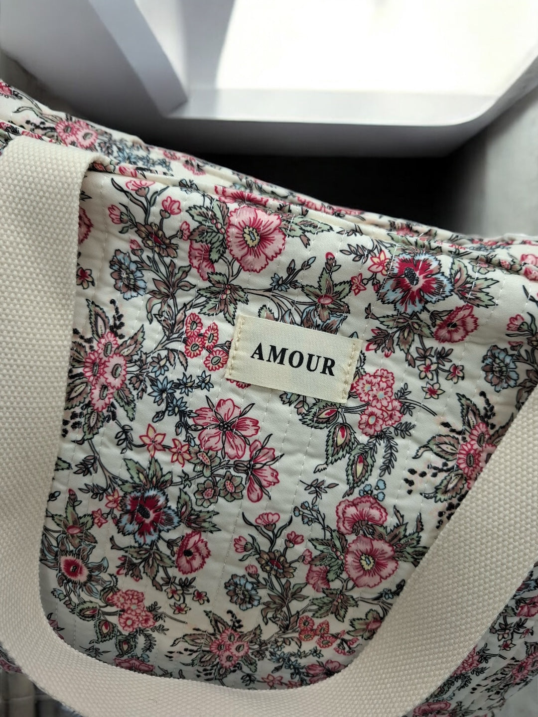 Le sac est de grande taille, idéal pour transporter de nombreux objets. Le design est orné de motifs floraux roses et noirs sur un fond beige, offrant une allure douce et romantique. Les poignées sont de couleur beige, assorties au fond du sac, et semblent robustes pour un port confortable. Une étiquette blanche avec le mot "AMOUR" est cousue au centre de la face avant, ajoutant une touche distinctive à l'ensemble.