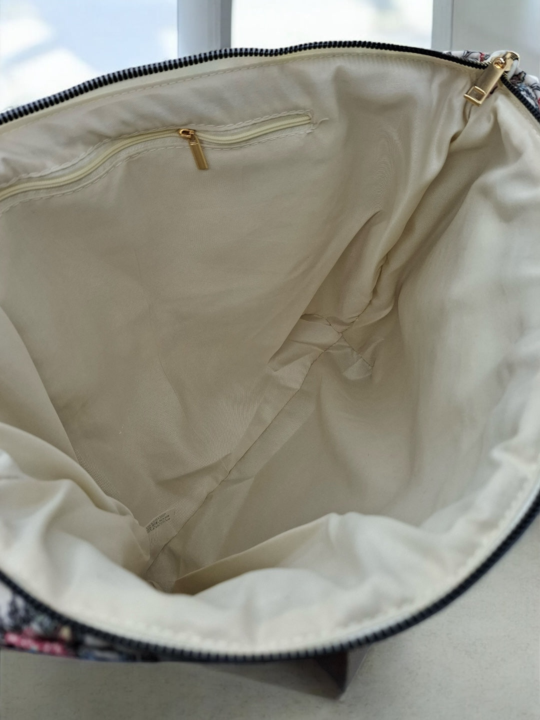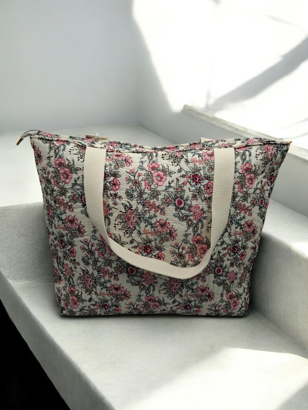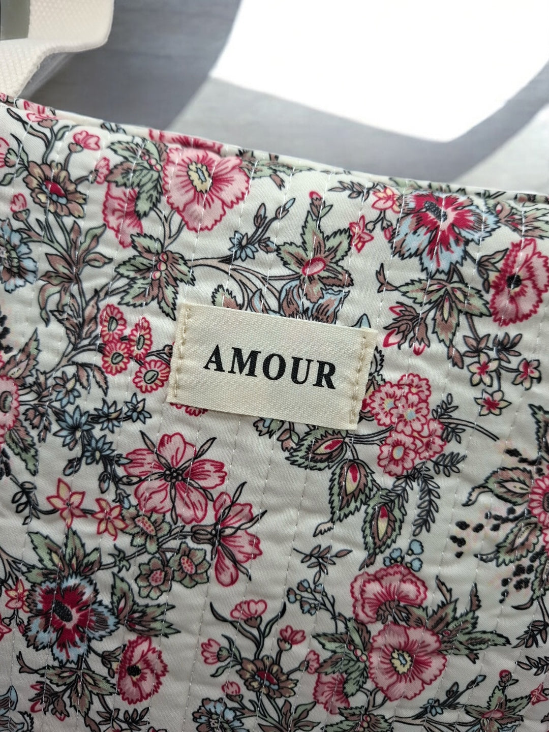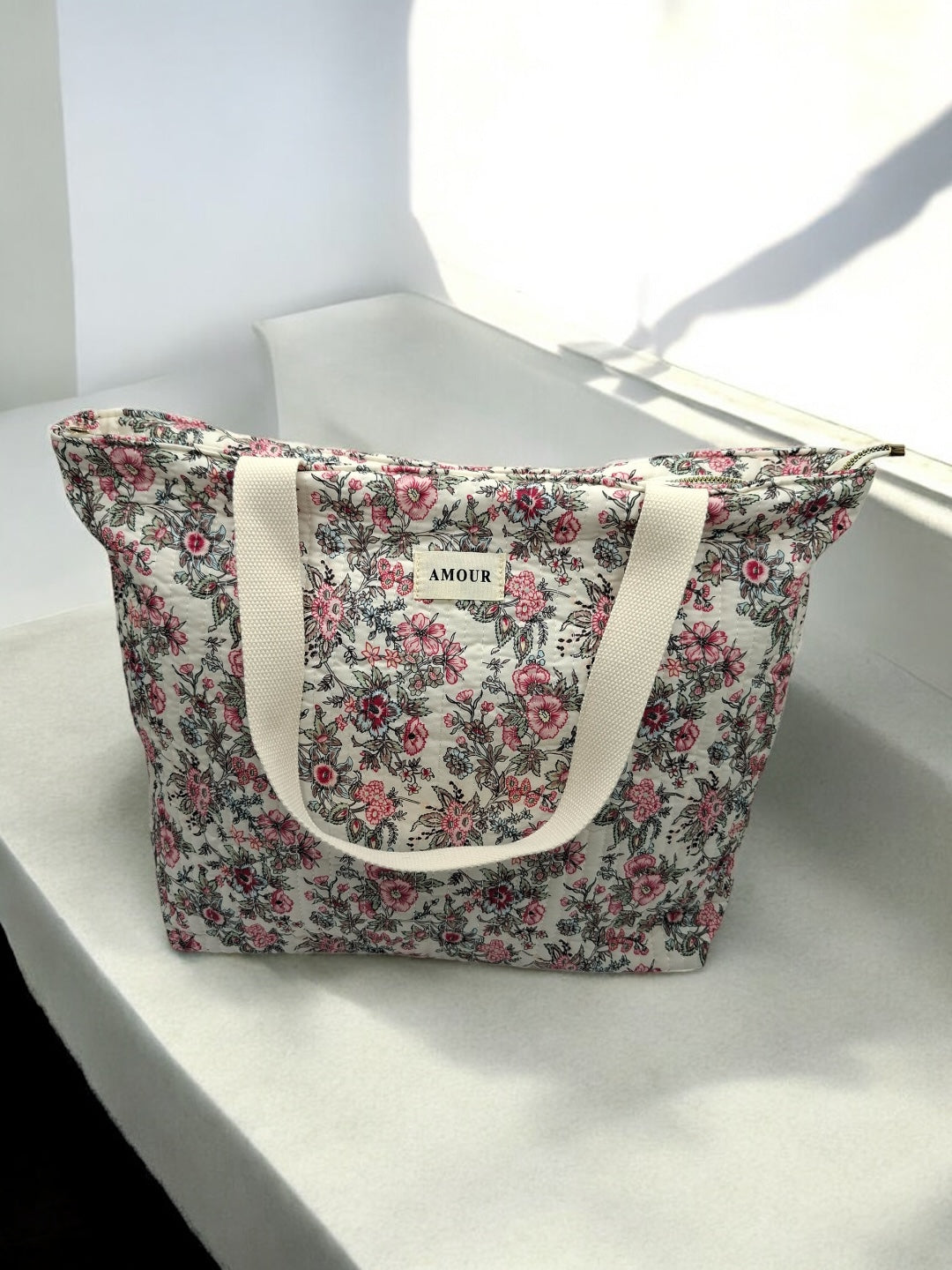 Le sac est de grande taille, idéal pour transporter de nombreux objets. Le design est orné de motifs floraux roses et noirs sur un fond beige, offrant une allure douce et romantique. Les poignées sont de couleur beige, assorties au fond du sac, et semblent robustes pour un port confortable. Une étiquette blanche avec le mot "AMOUR" est cousue au centre de la face avant, ajoutant une touche distinctive à l'ensemble.