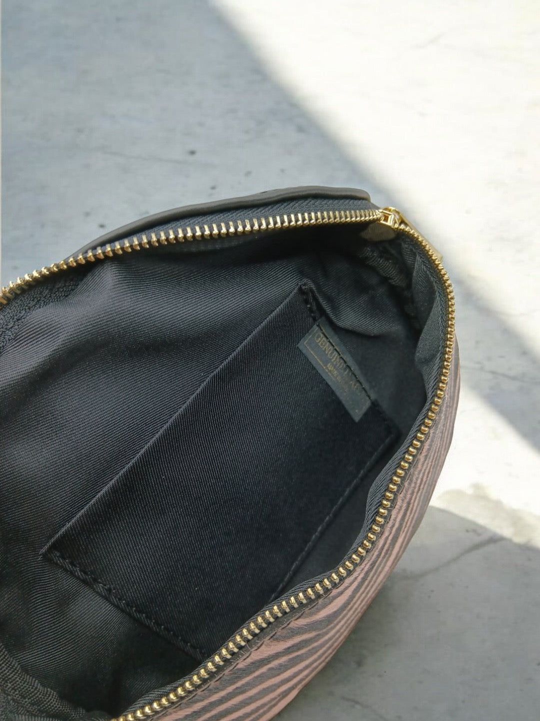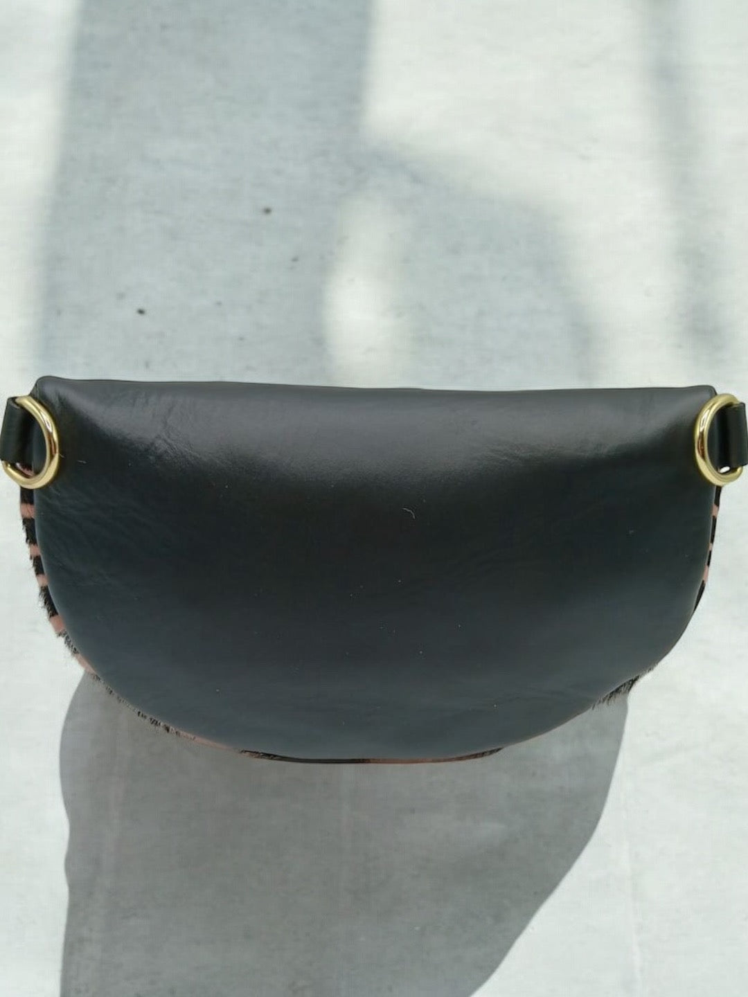 Le sac banane présente un motif zébré audacieux en alternance de couleur sur la face avant. Une fermeture éclair dorée traverse le dessus, ajoutant une touche d'élégance. La partie arrière est noire, simple et lisse. Le sac inclut une bandoulière amovible noire avec des crochets dorés aux extrémités, permettant un ajustement facile et une portabilité personnalisée.