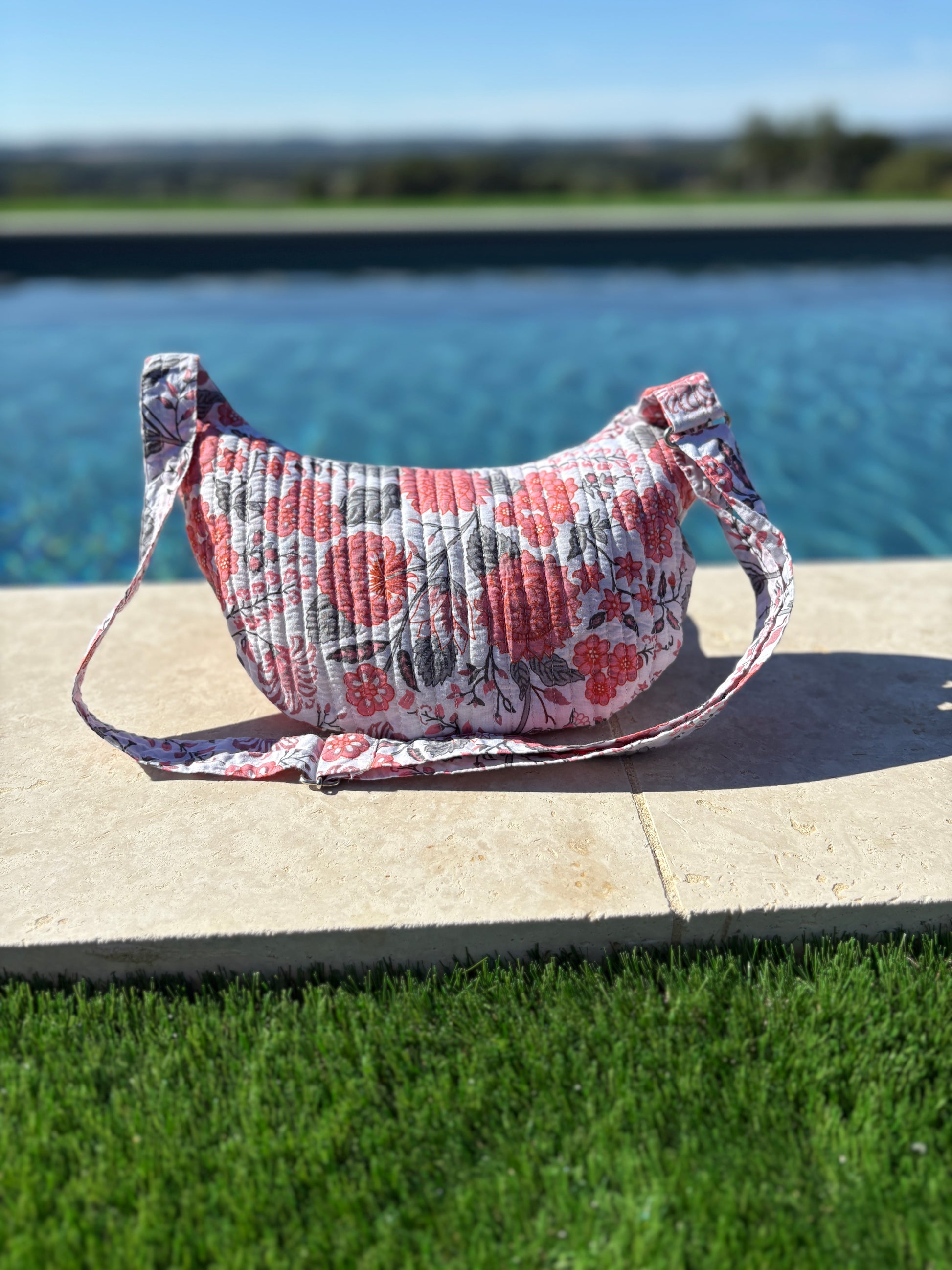 Portez ce sac banane en coton fin sans doublure, orné de blockprint fleuri rose et gris, pour donner à votre look une touche d'aventure et de style !
