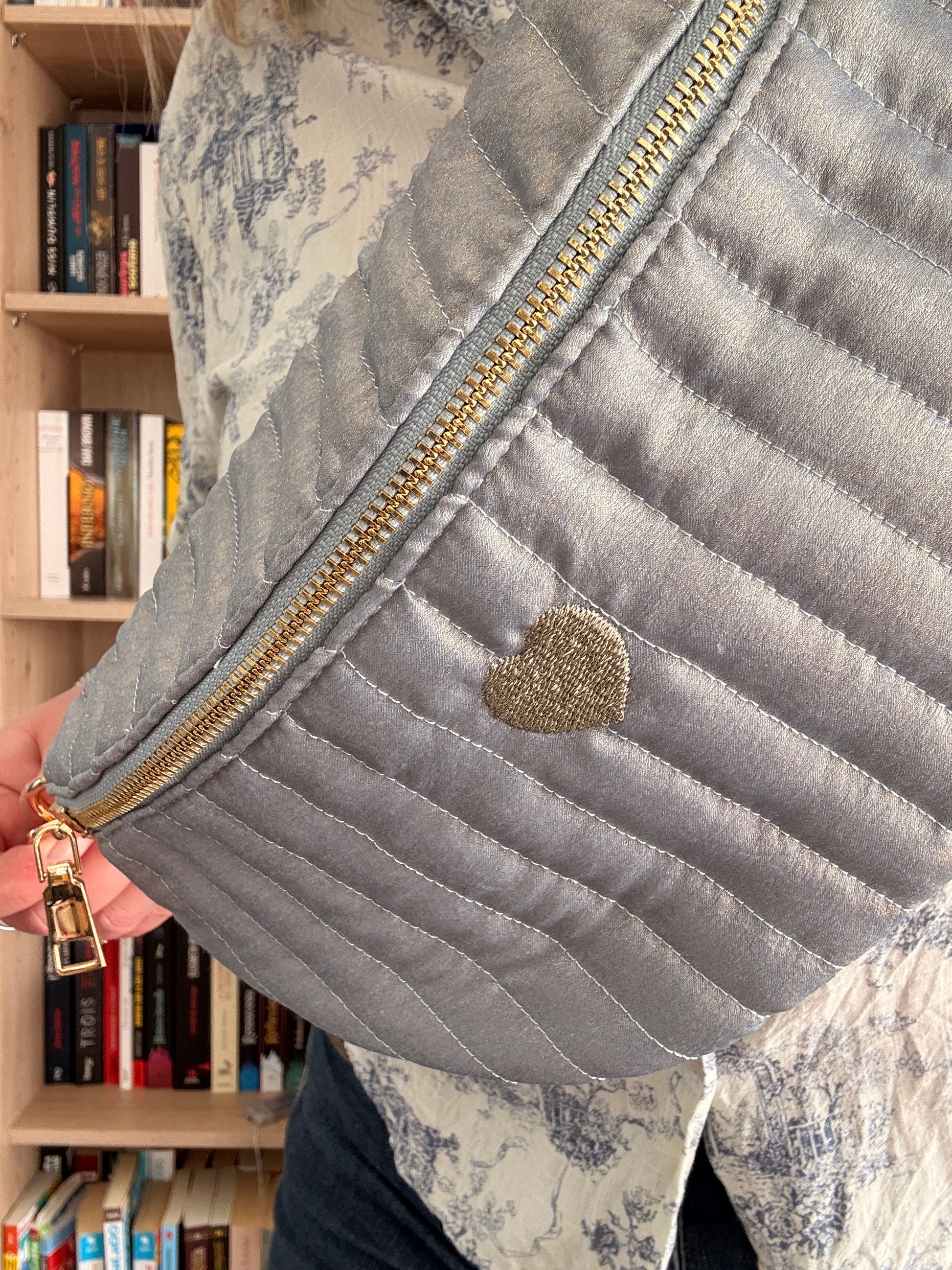 Le délicat motif en forme de cœur apposé sur le devant apporte une touche romantique et distinctive, tandis que la fermeture éclair dorée et les finitions métalliques premium soulignent son caractère chic et soigné.
