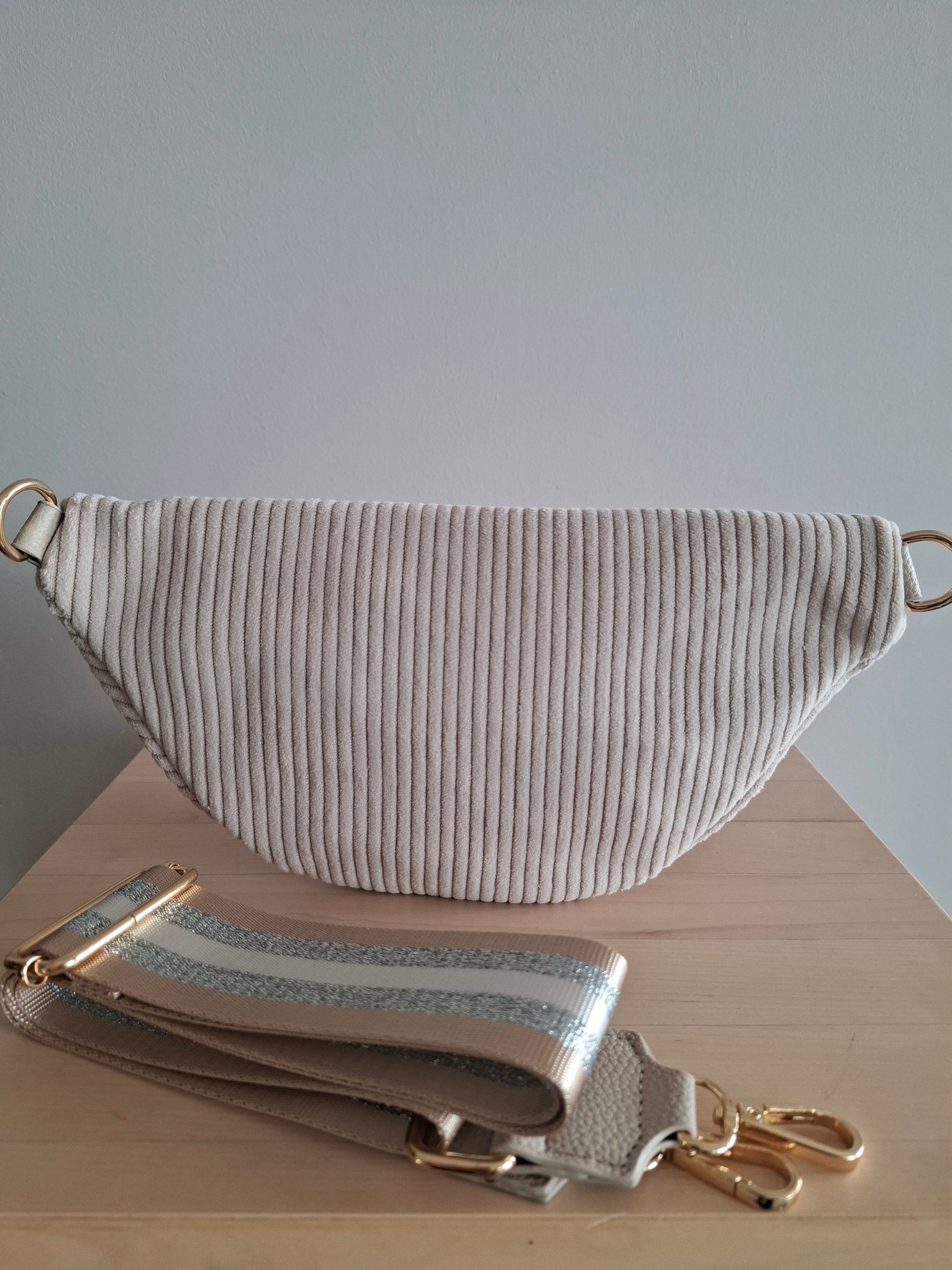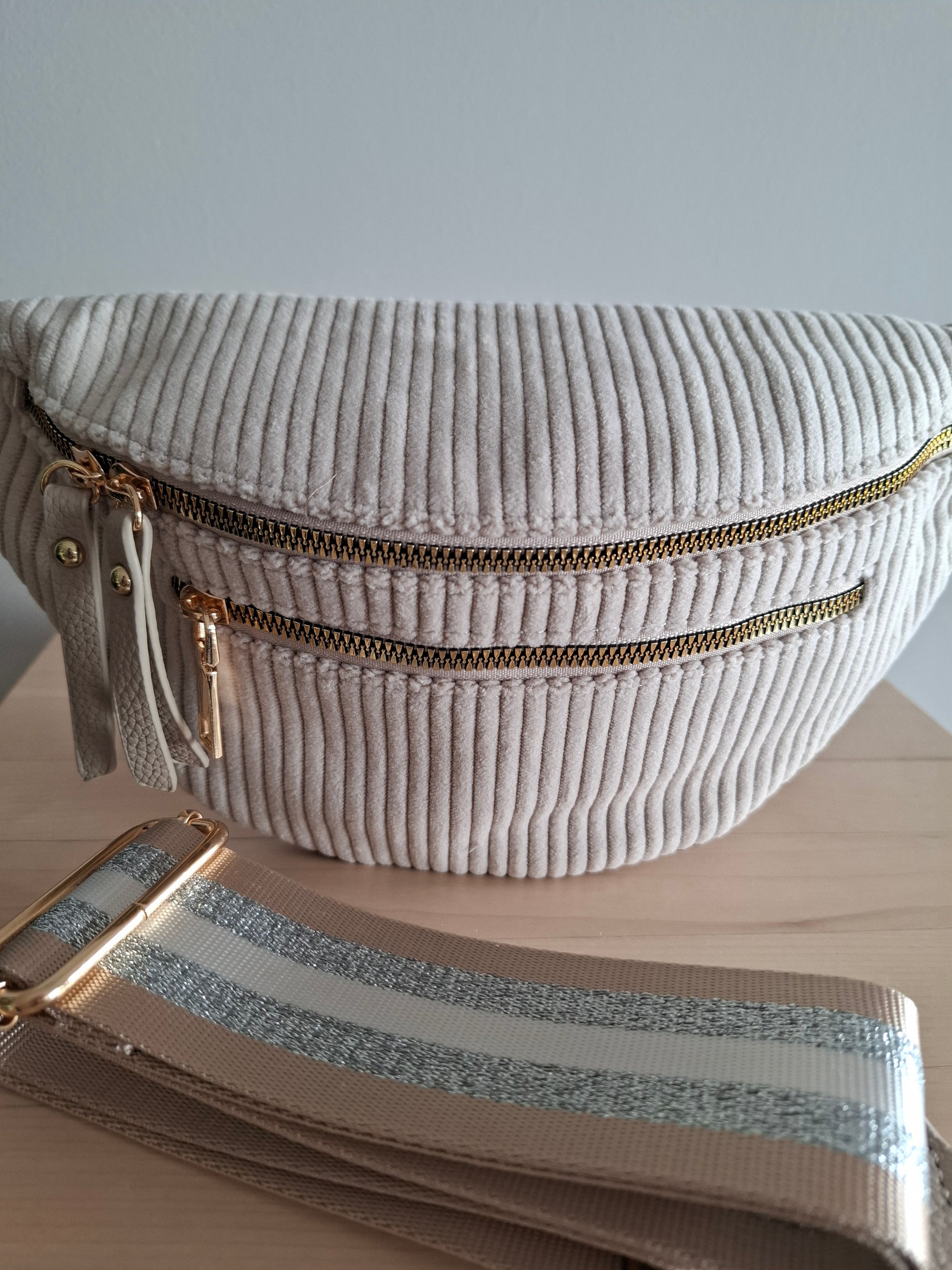 Sac banane velours côtelé 2 poches beige sangle fantaisie
