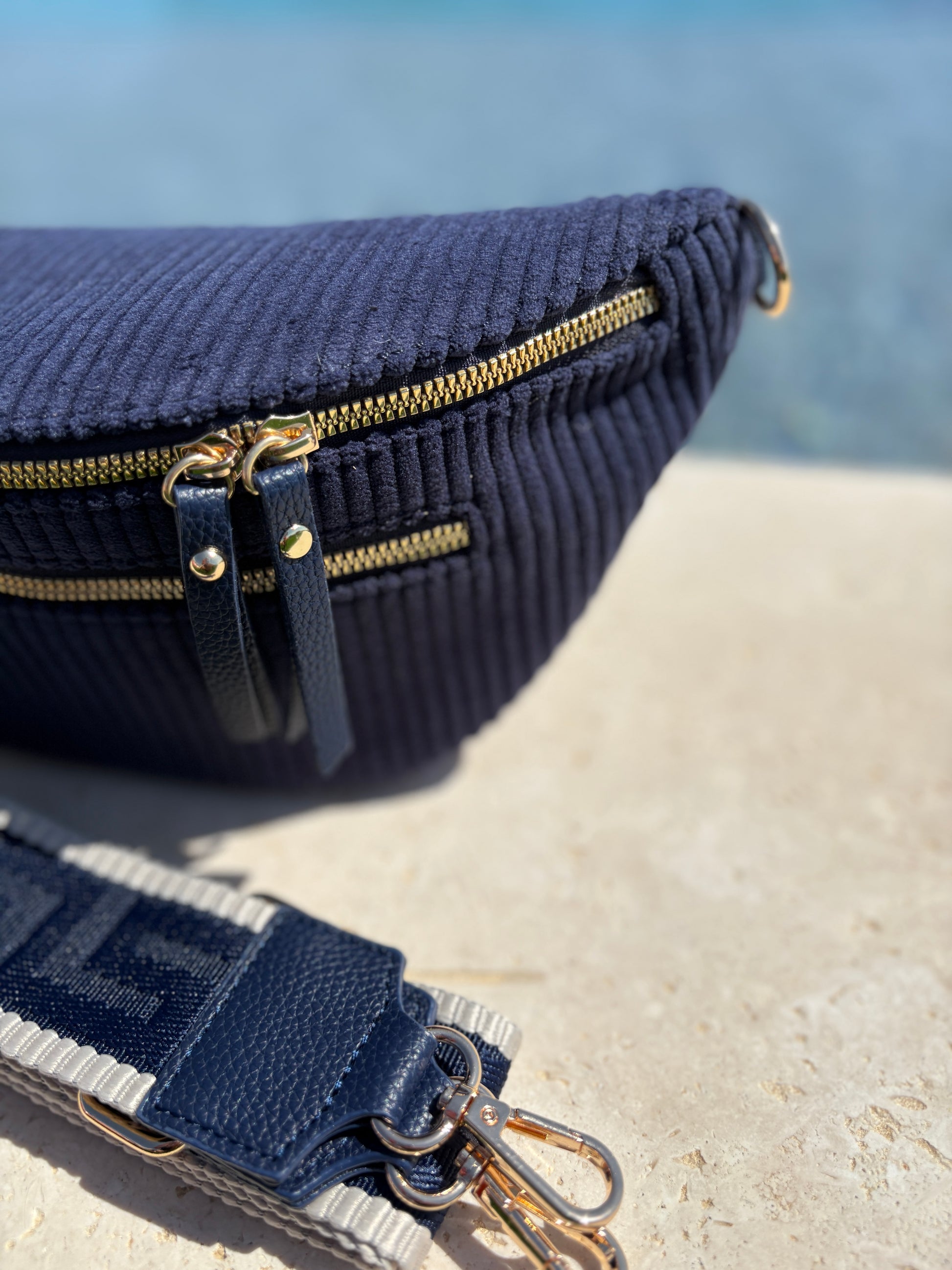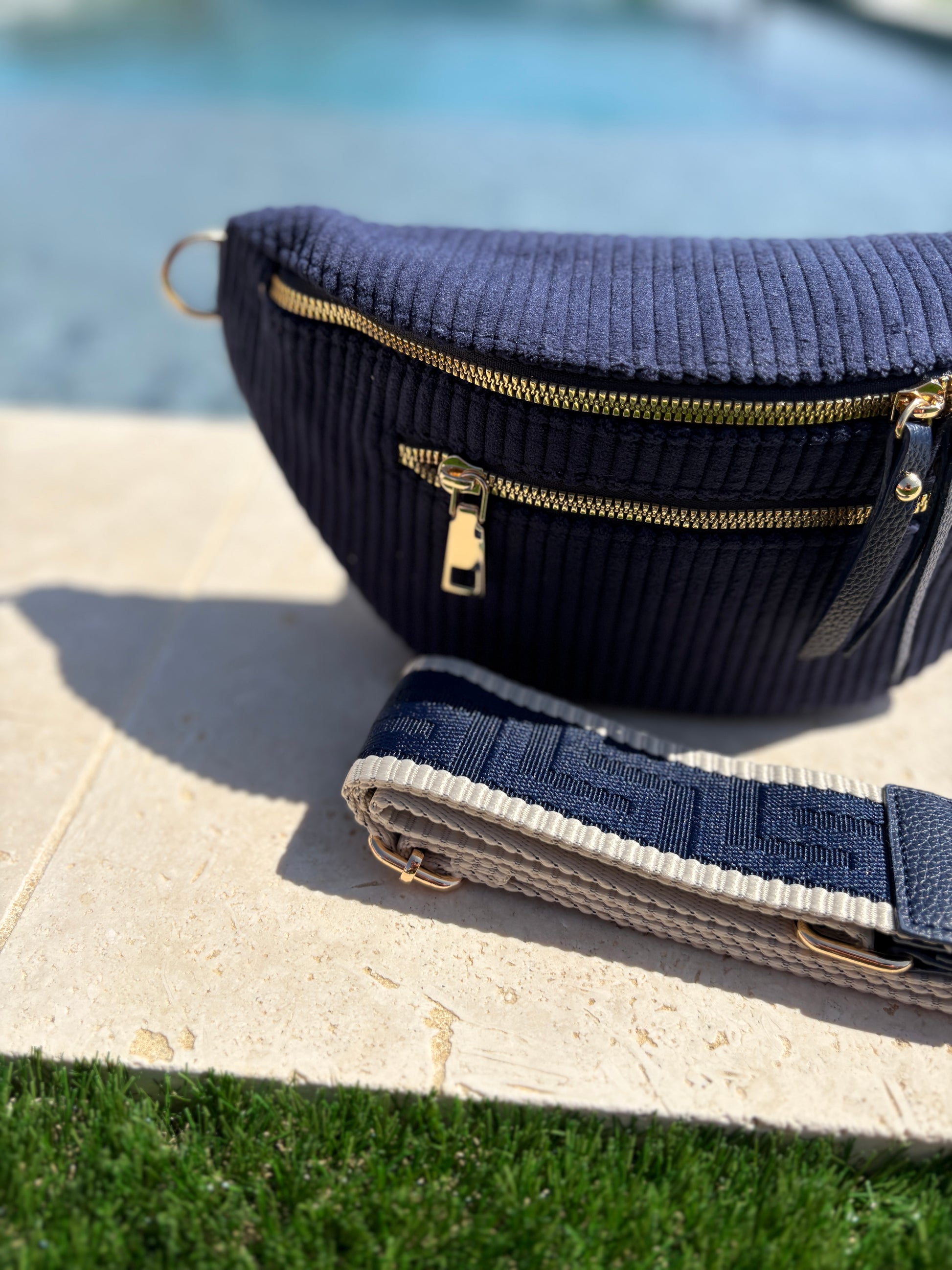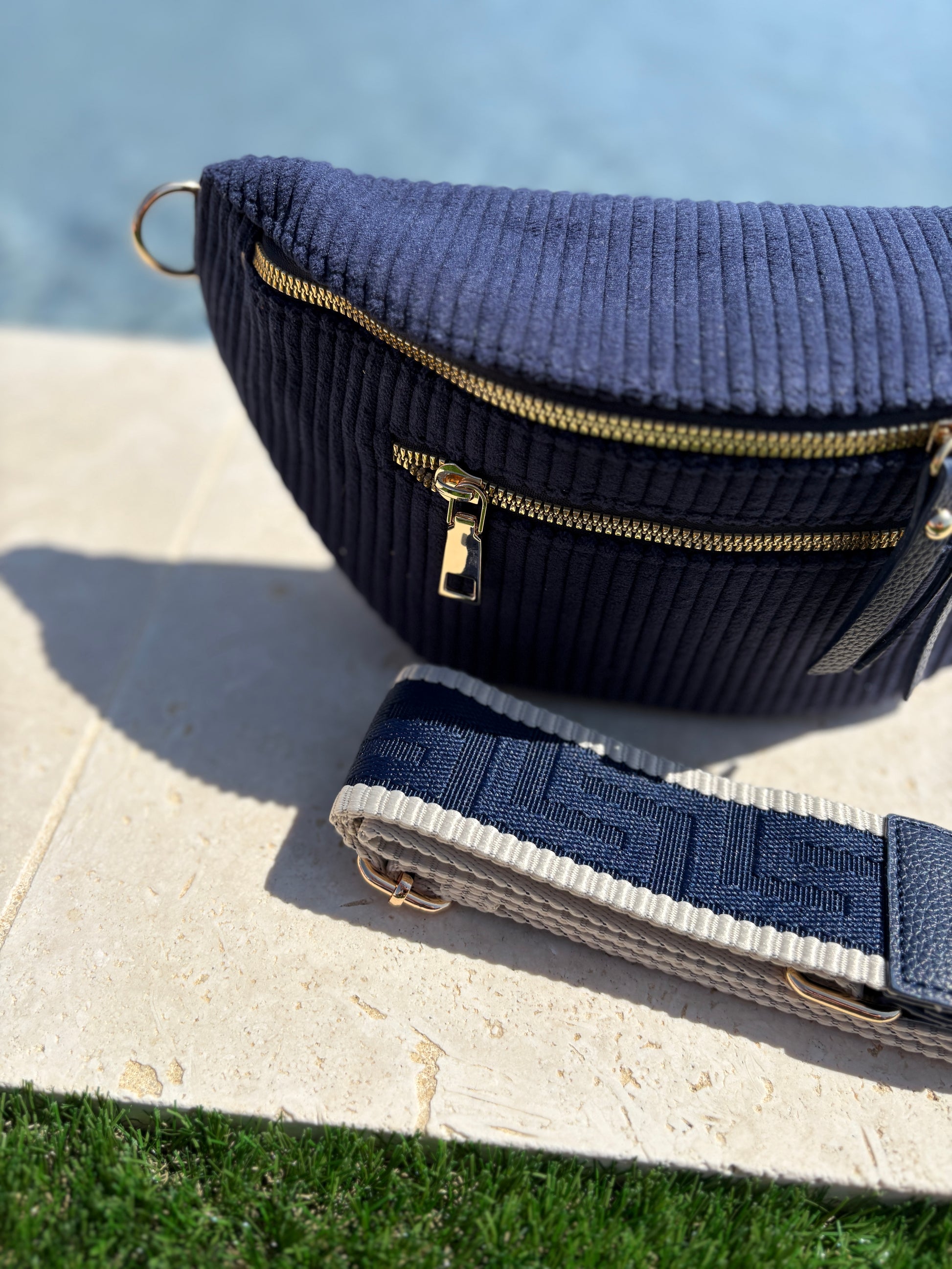 Sac banane velours côtelé 2 poches bleu marine sangle fantaisie