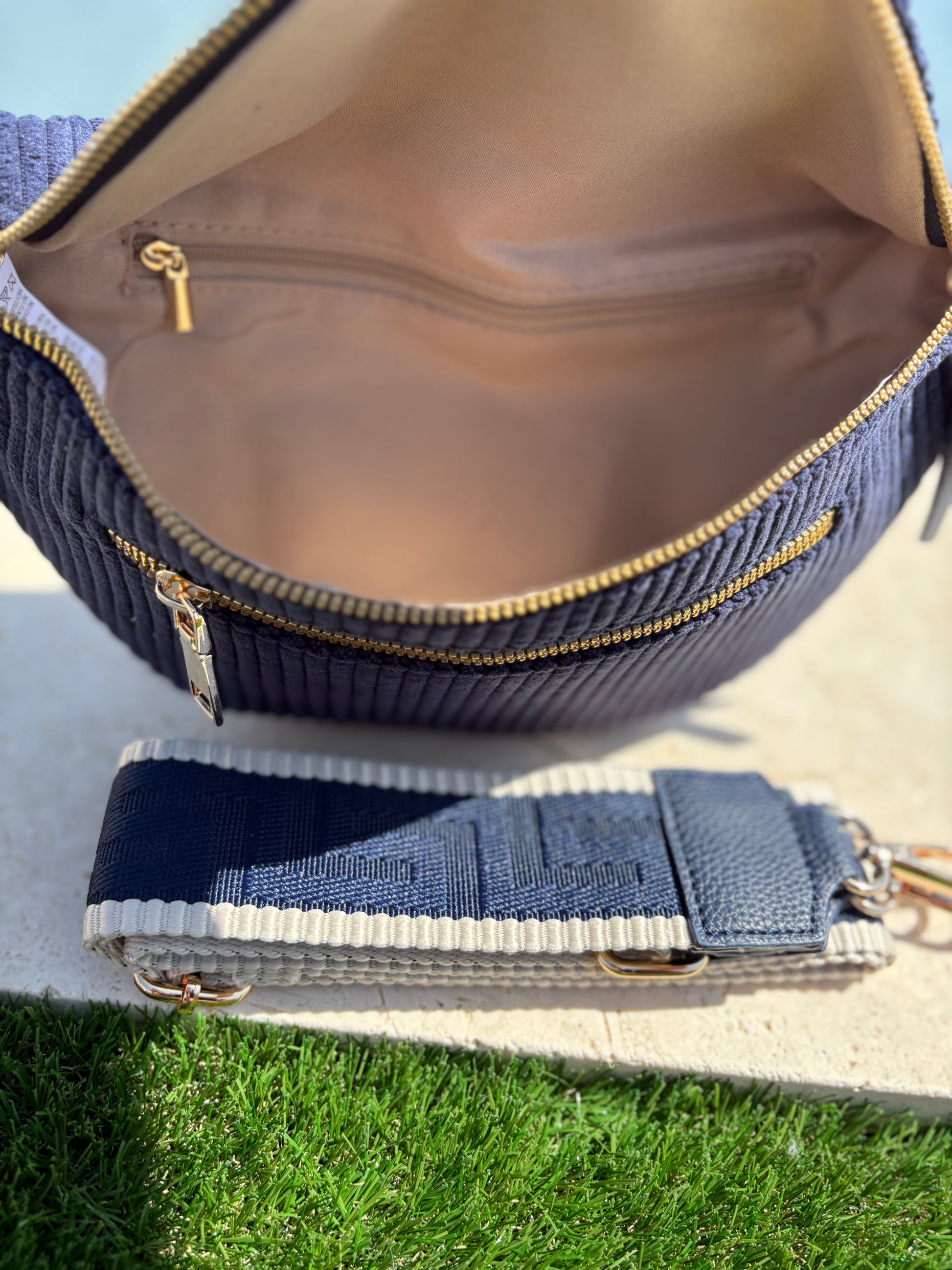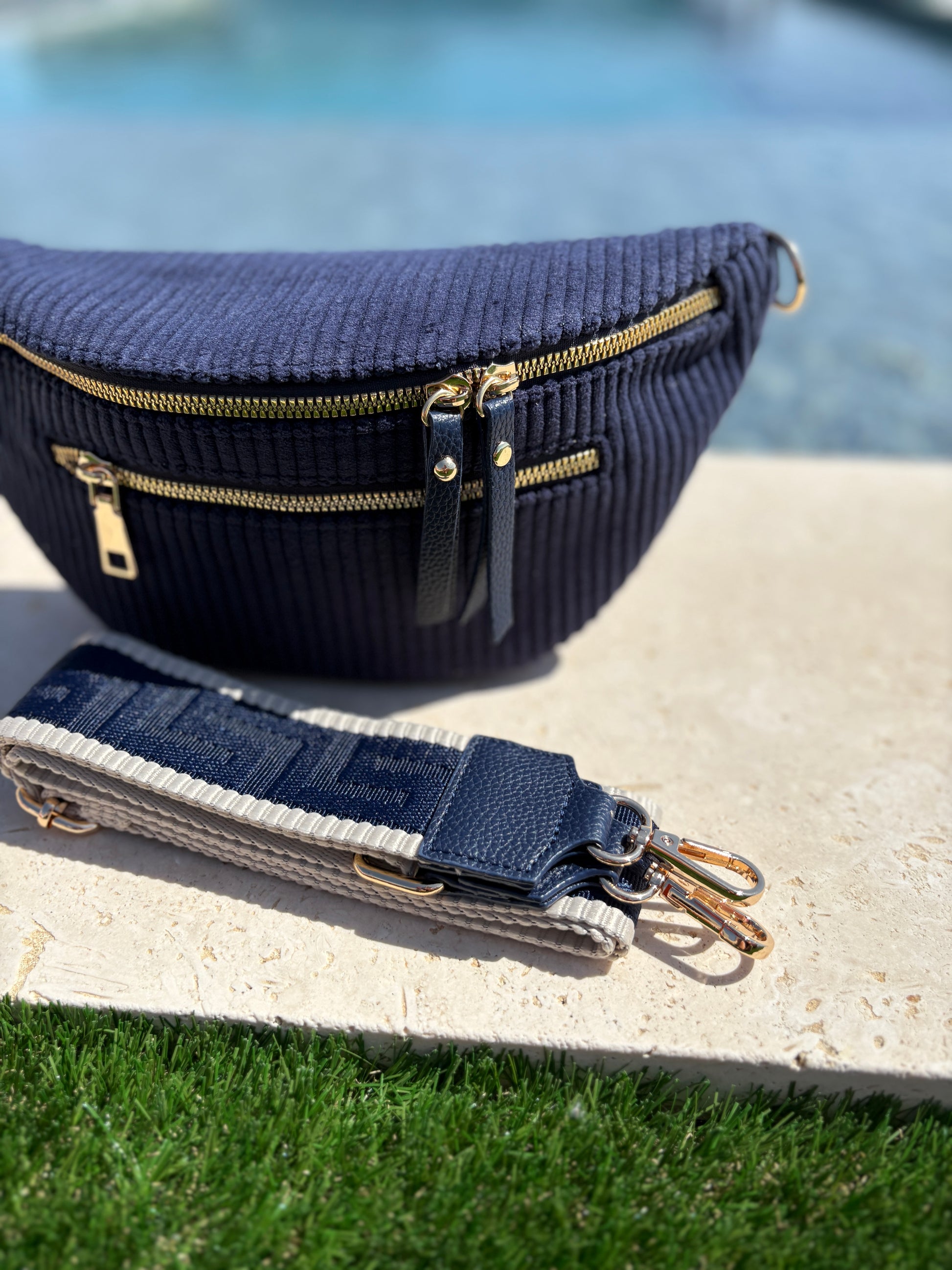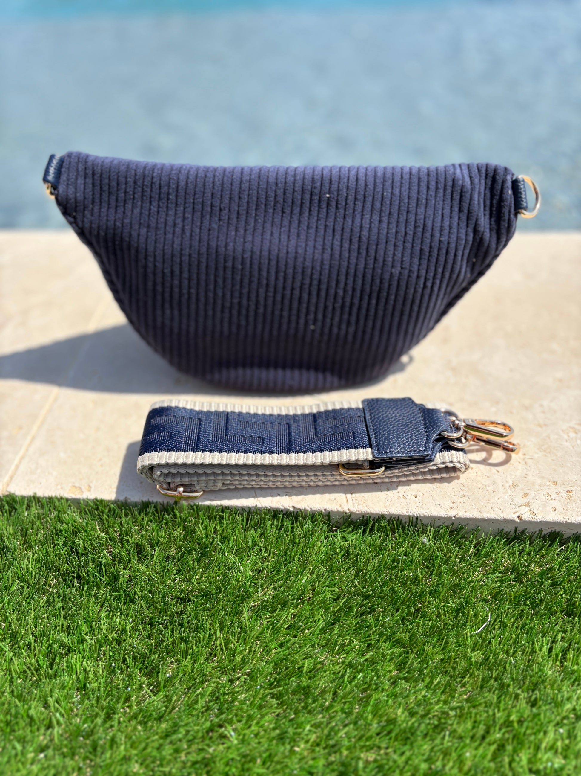 Sac banane velours côtelé 2 poches bleu marine sangle fantaisie