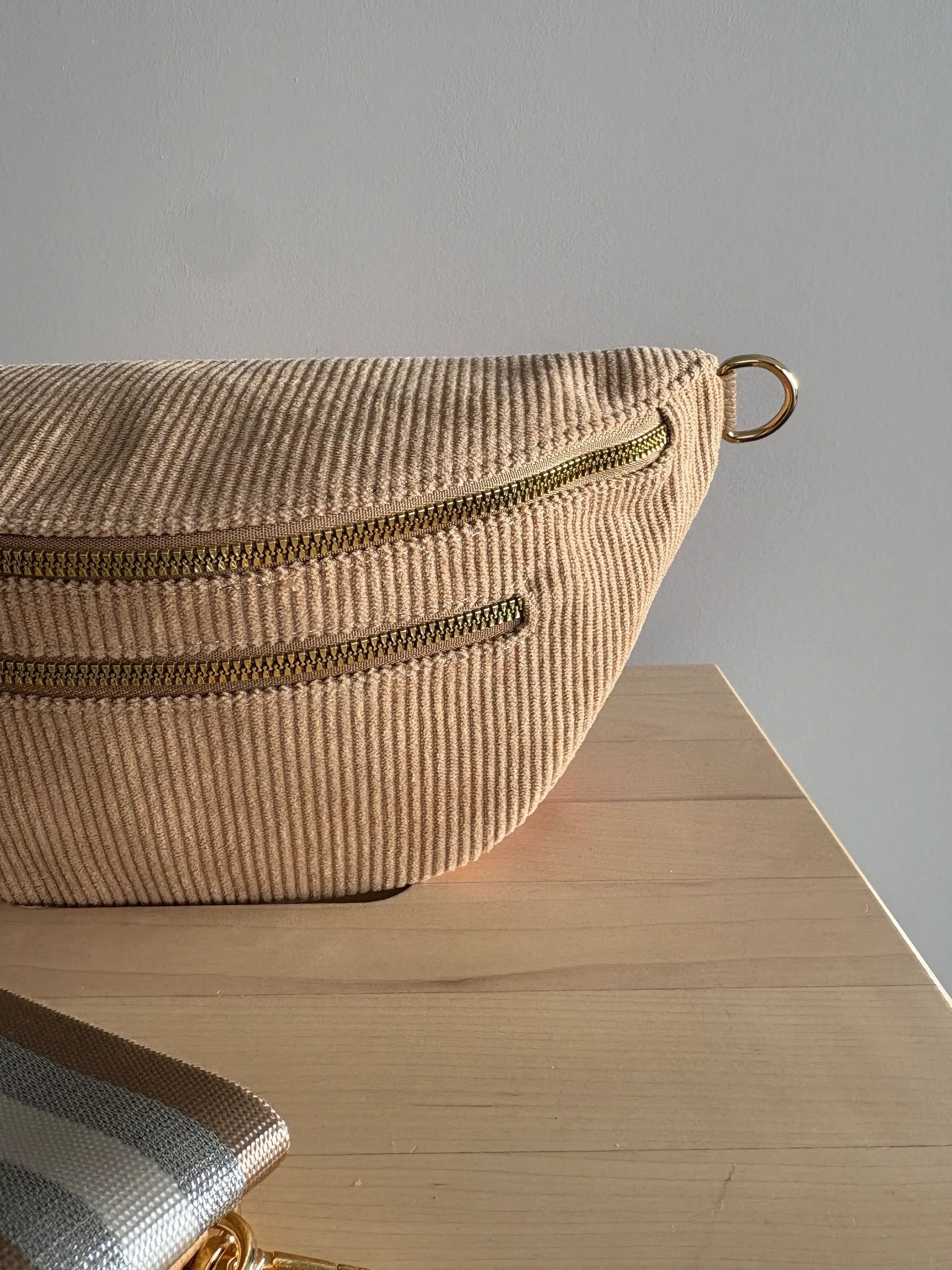 Sac banane velours côtelé 2 poches taupe sangle fantaisie couleur Marron beige foncé