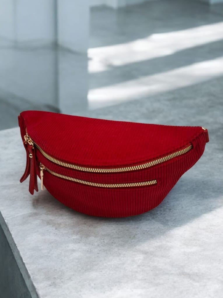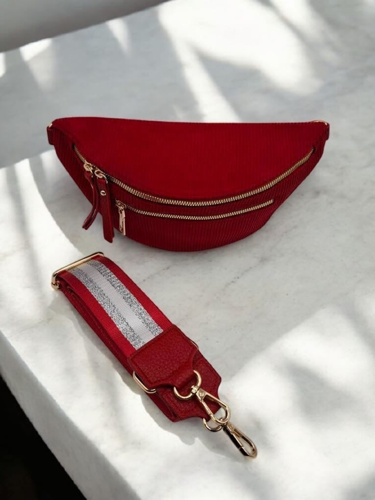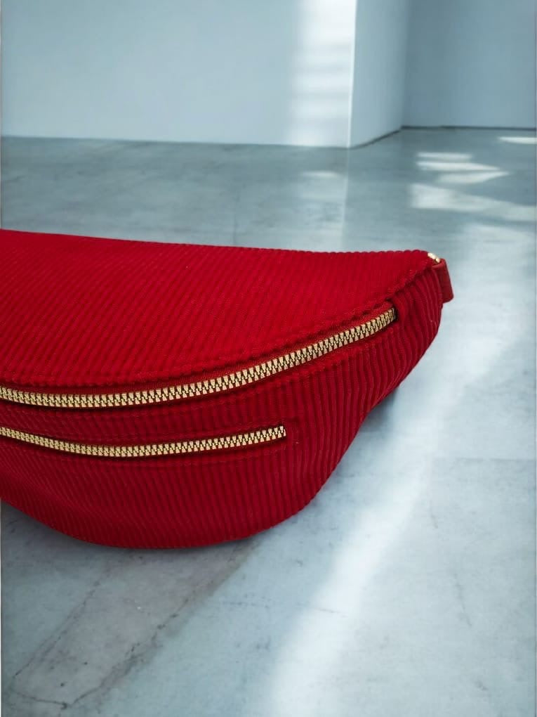 Sac banane velours côtelé 2 poches rouge sangle fantaisie