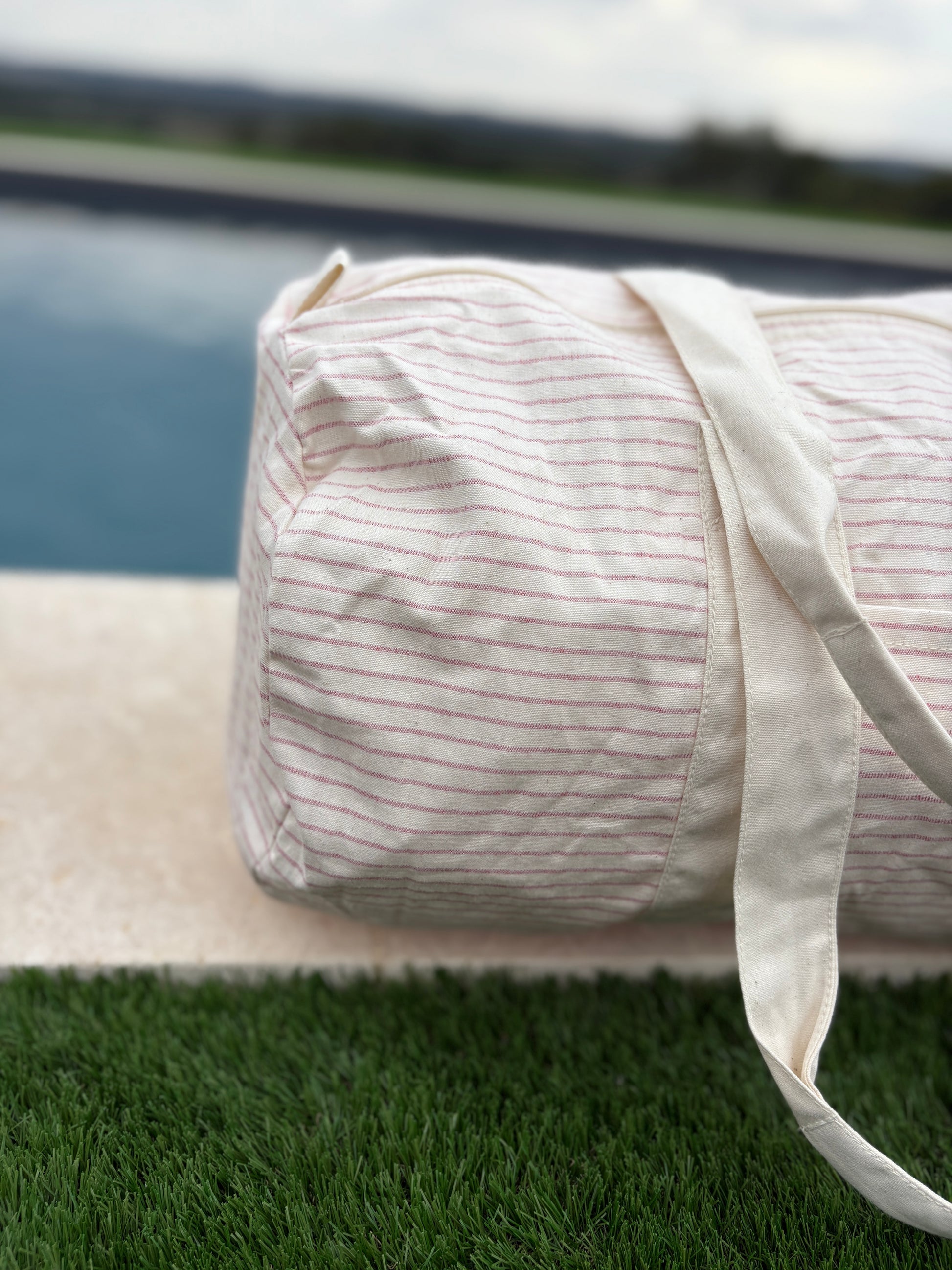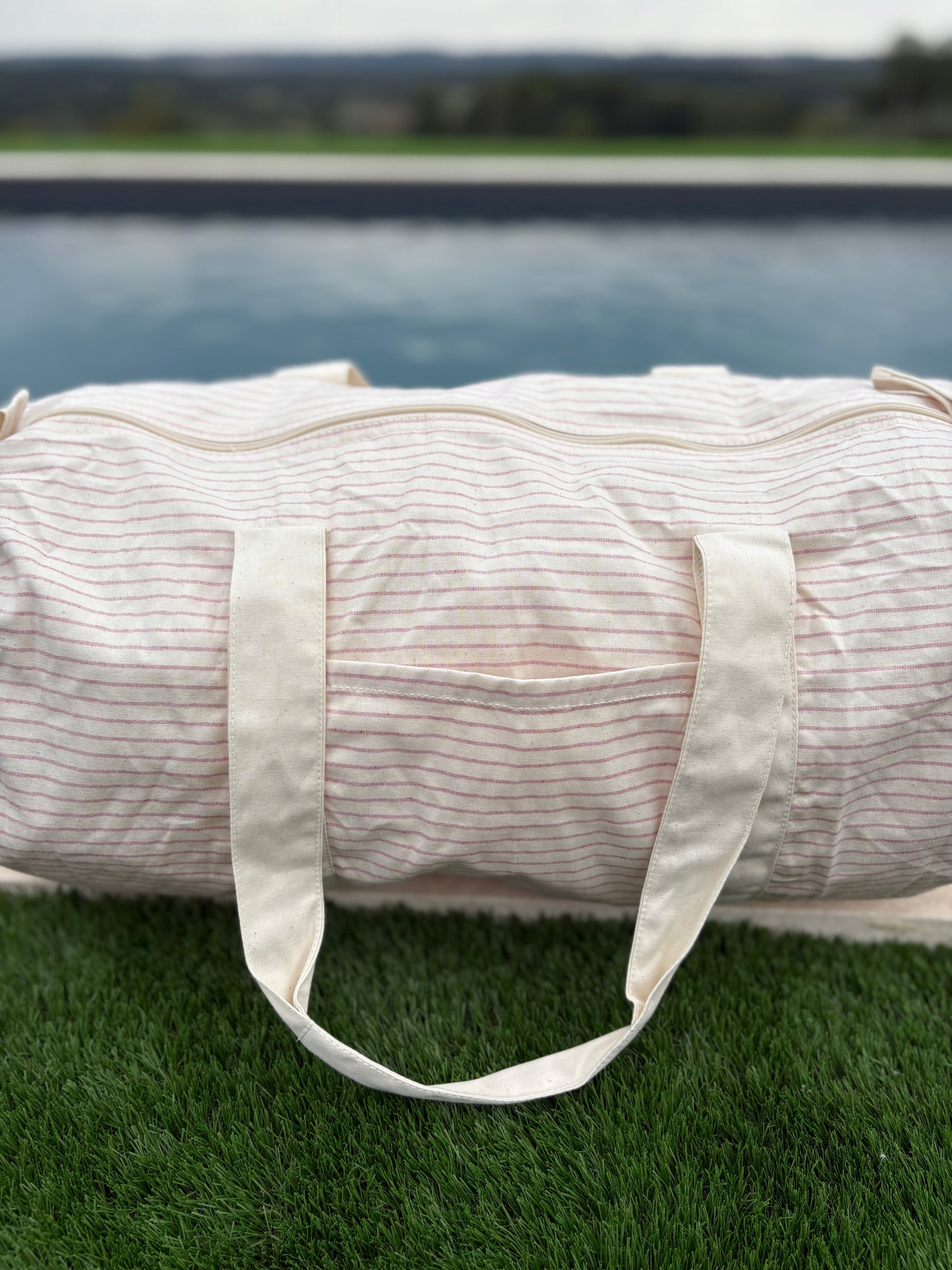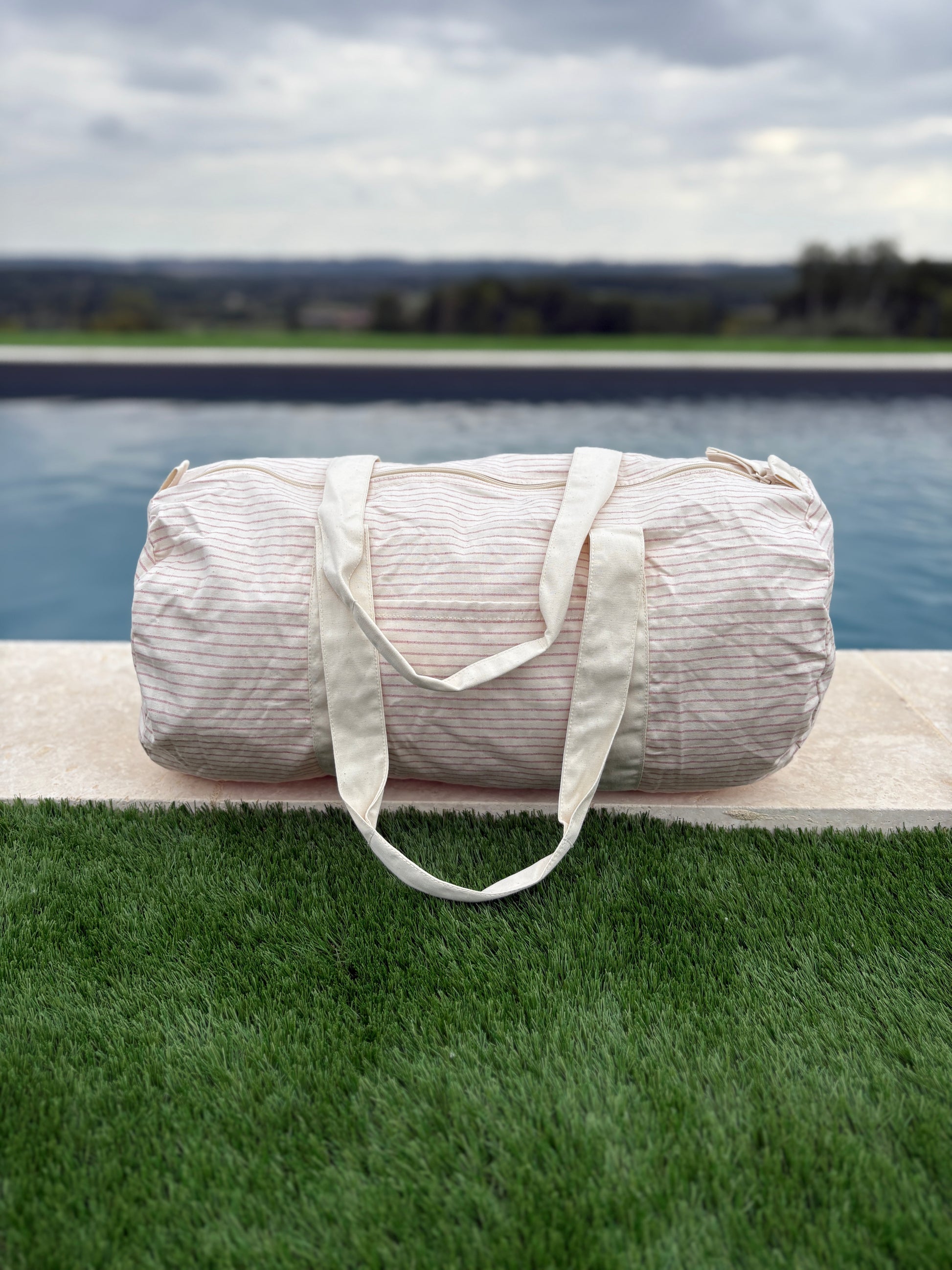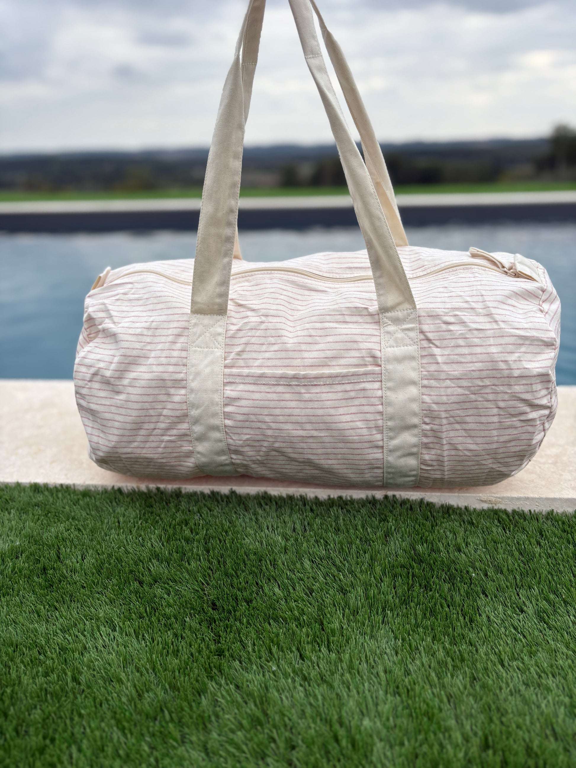 Sac polochon week end de voyage en coton léger rayé beige rouge rose