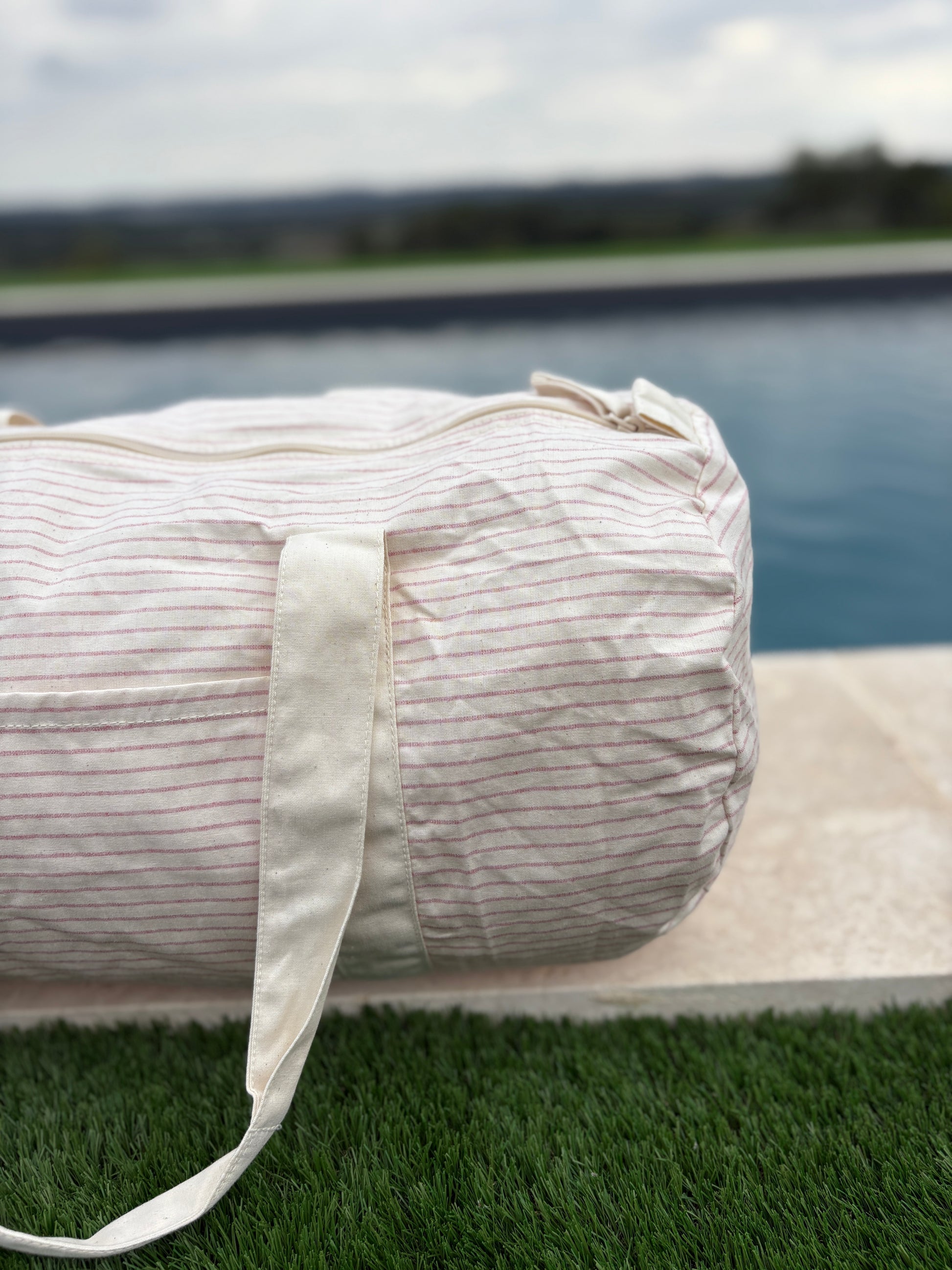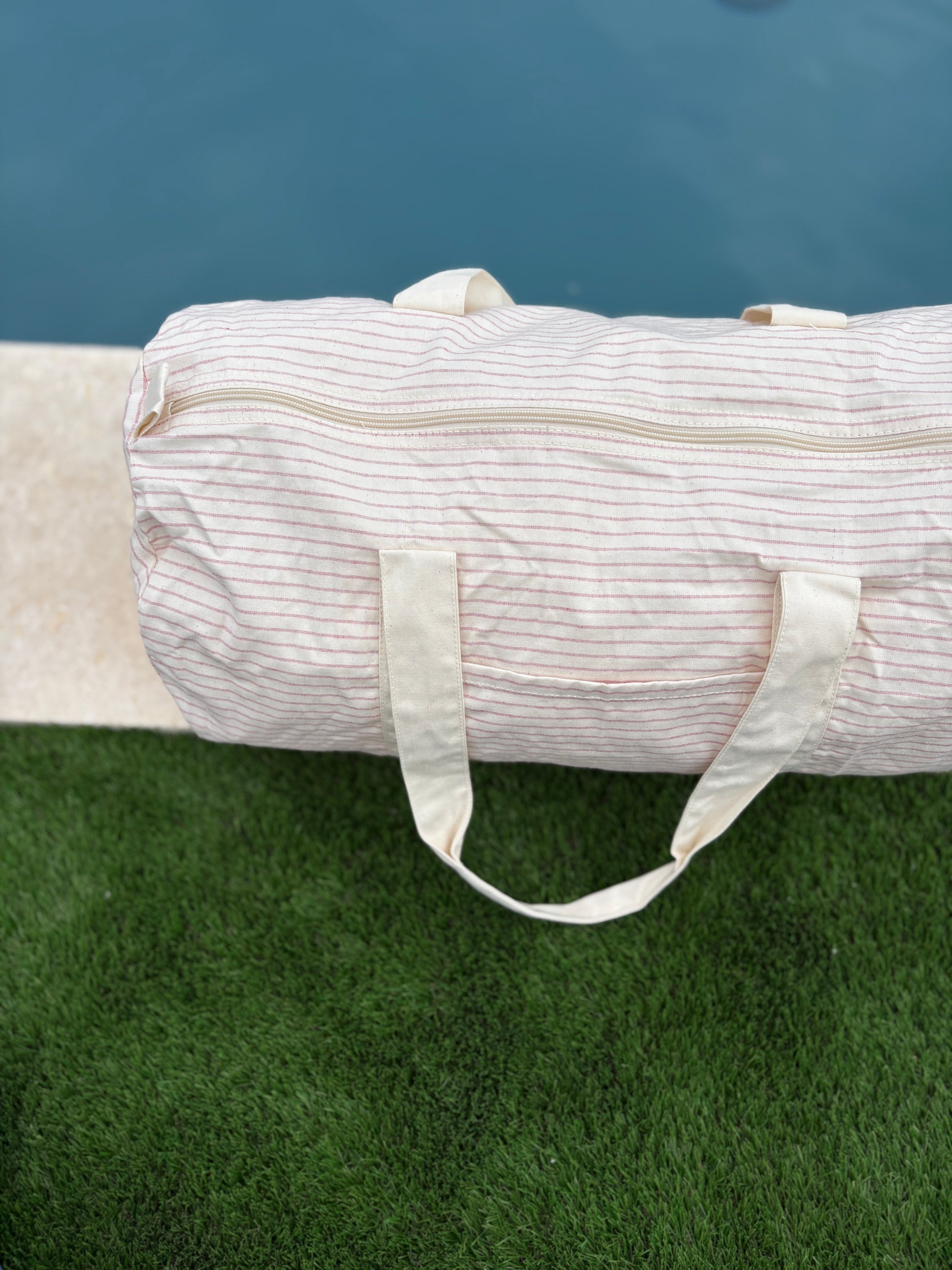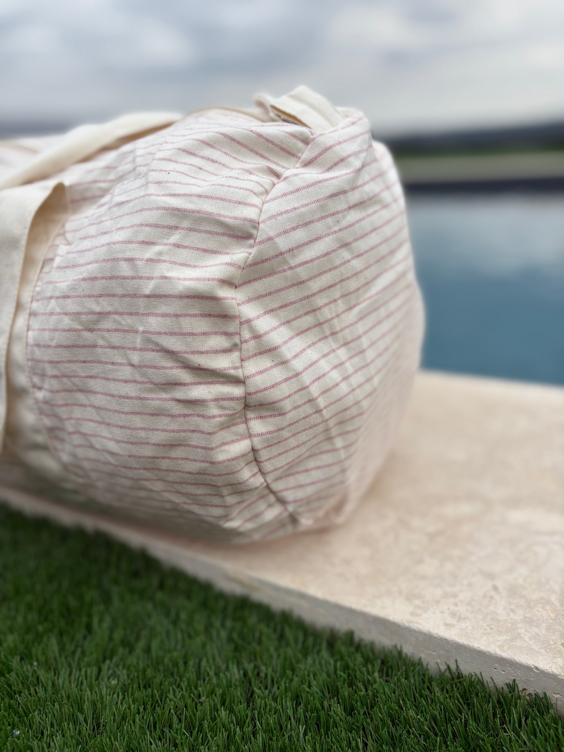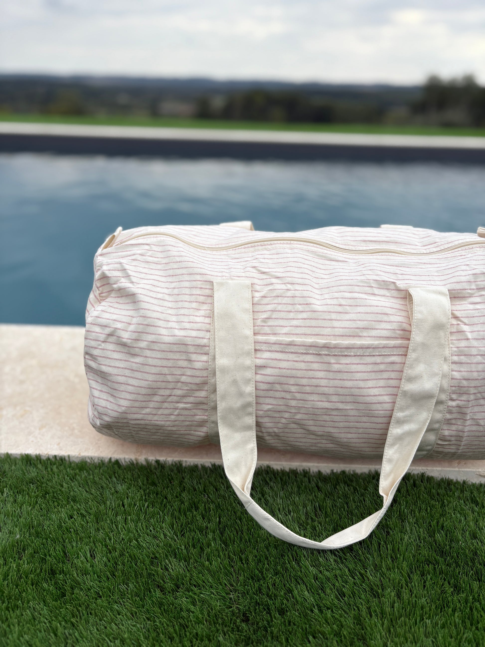 Sac polochon week end de voyage en coton léger rayé beige rouge rose