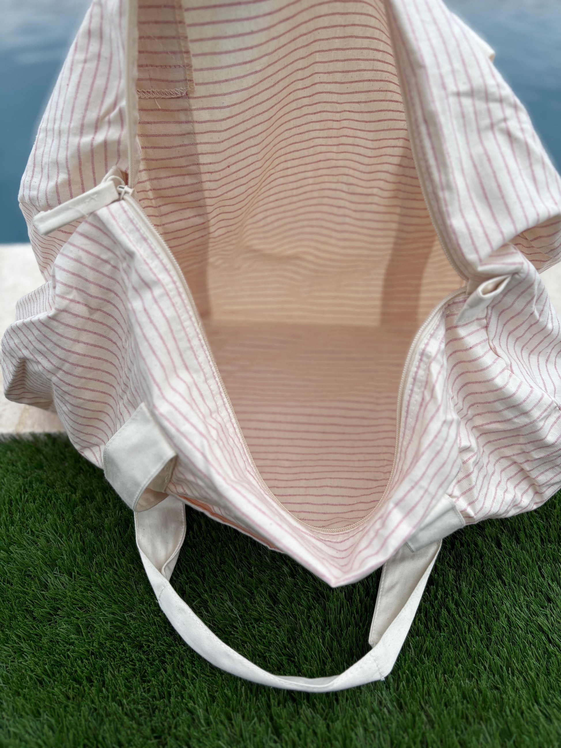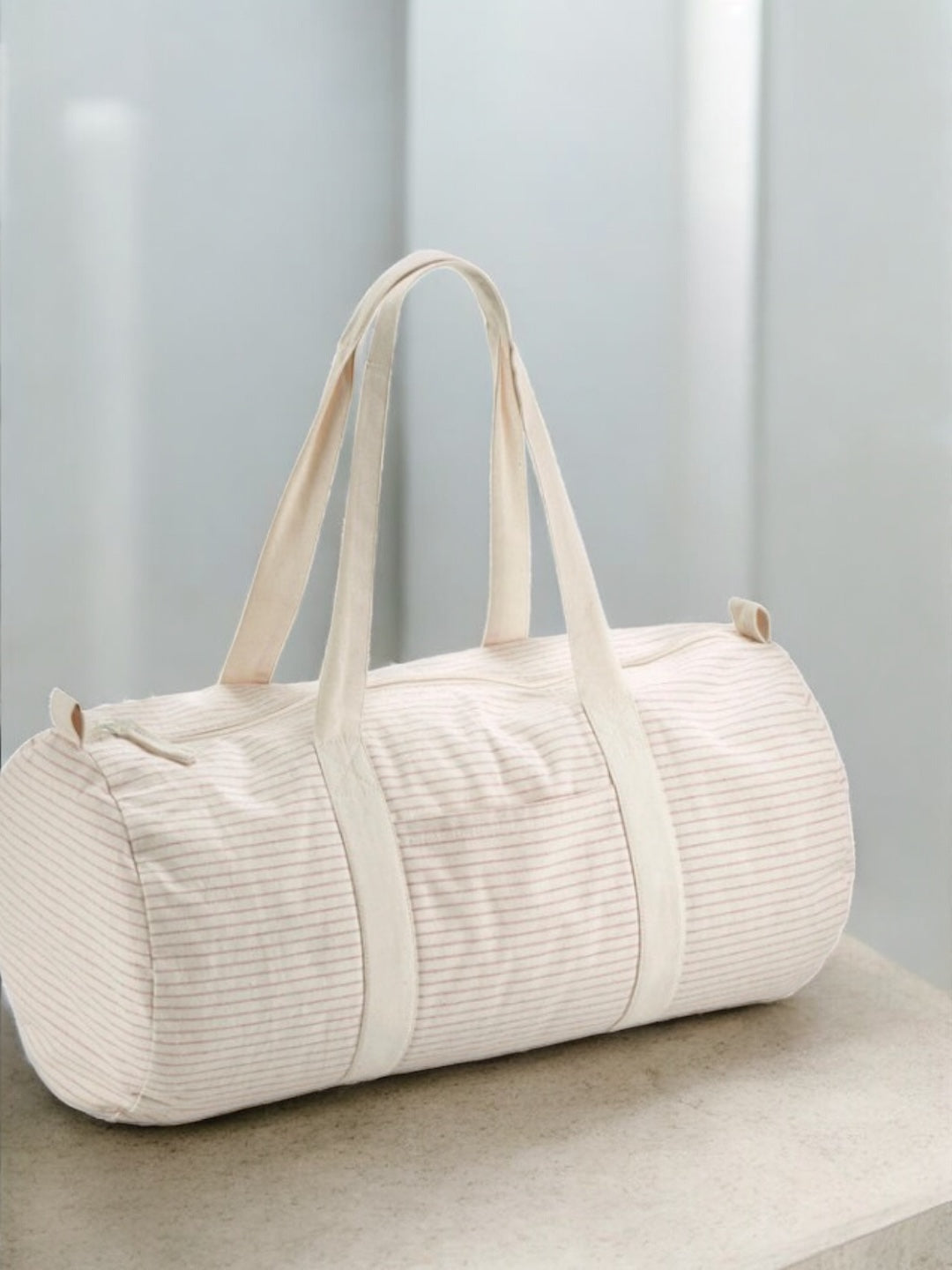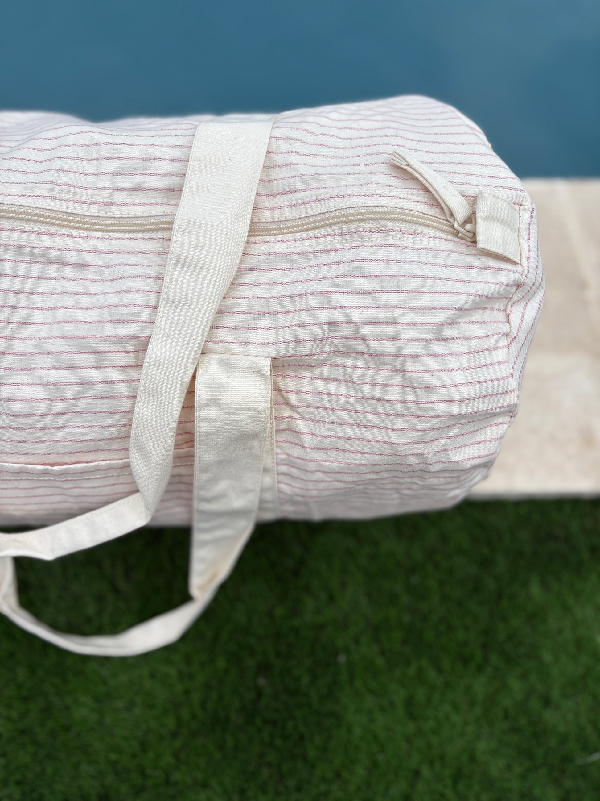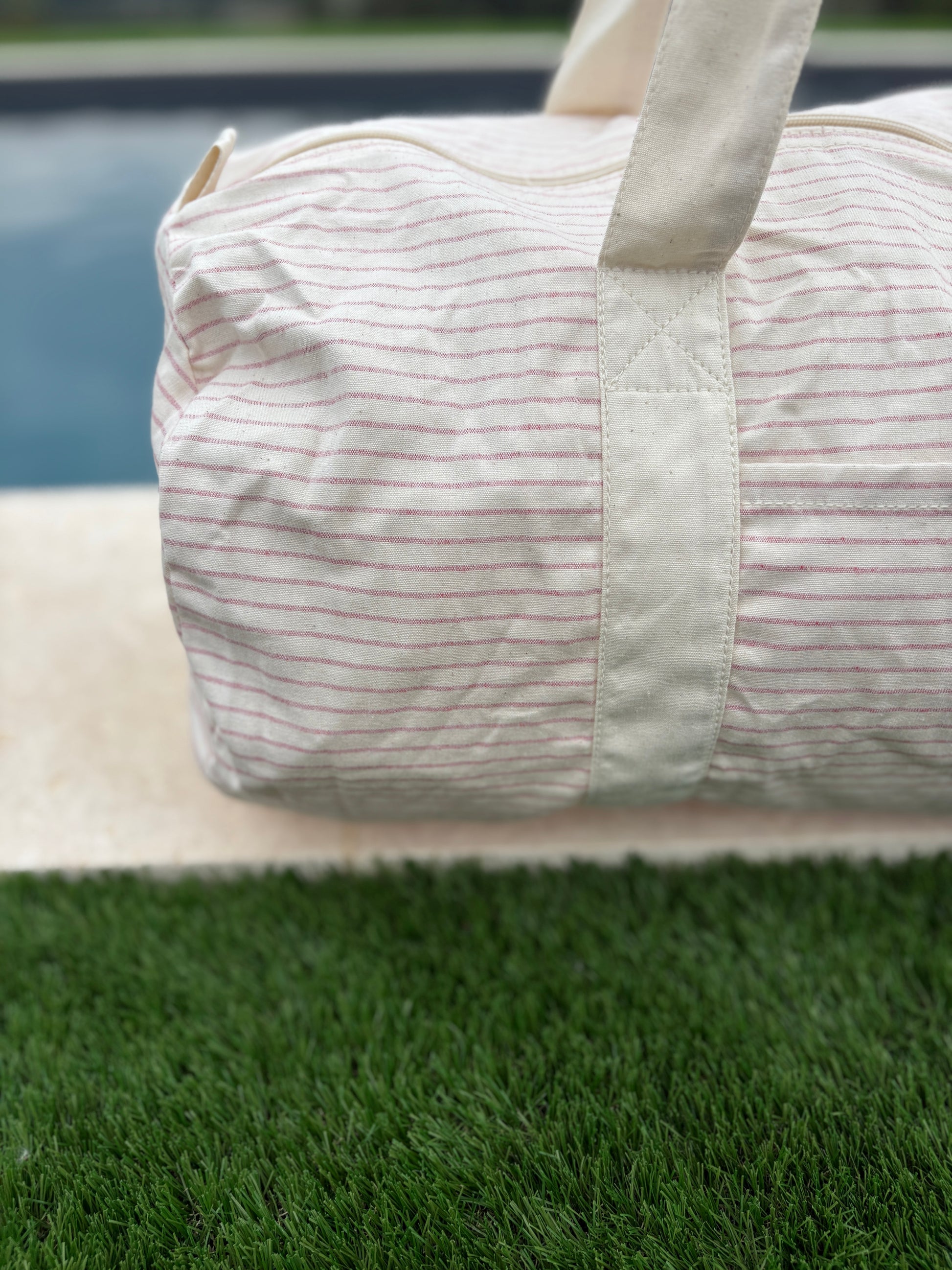 Sac polochon week end de voyage en coton léger rayé beige rouge rose