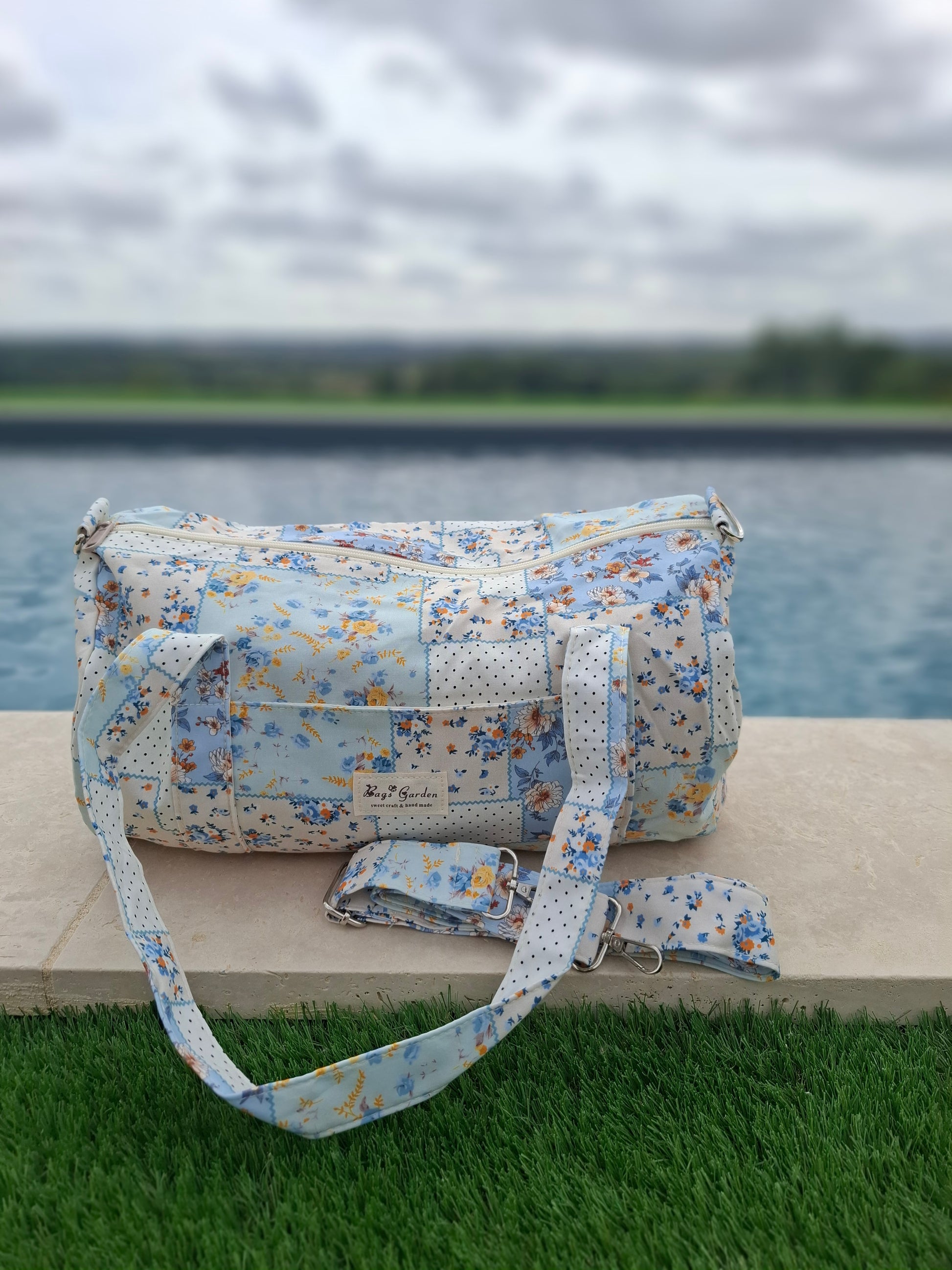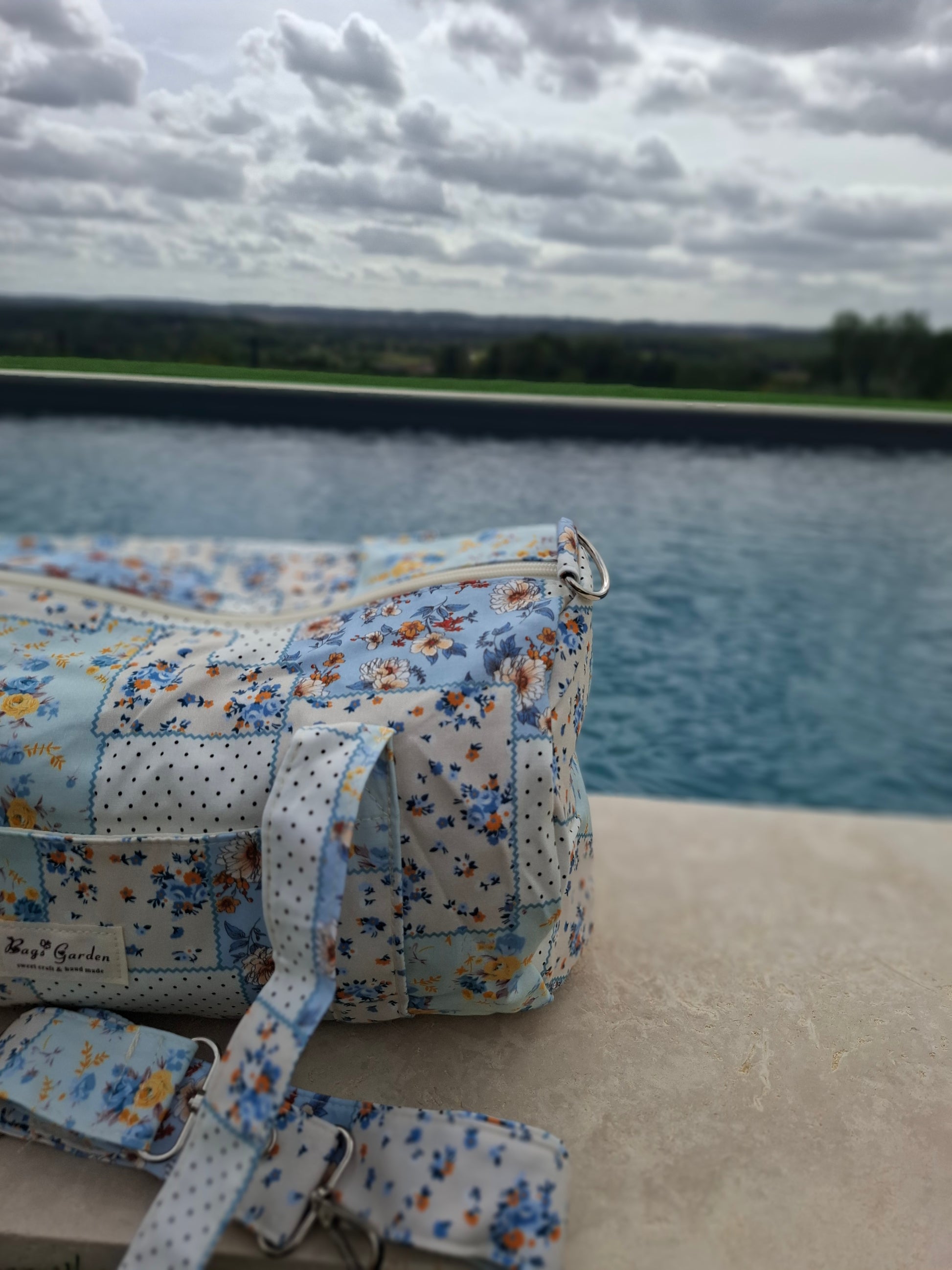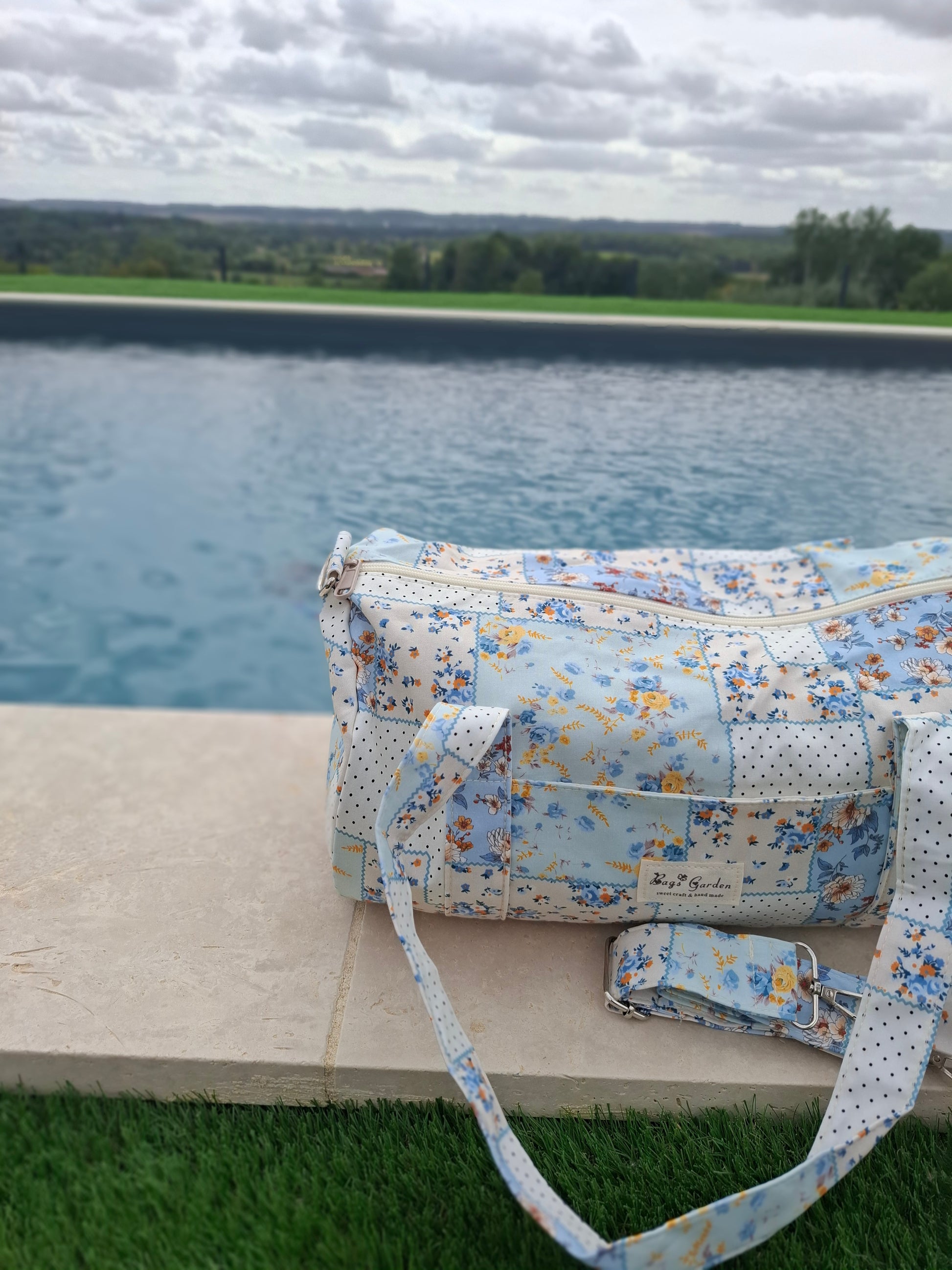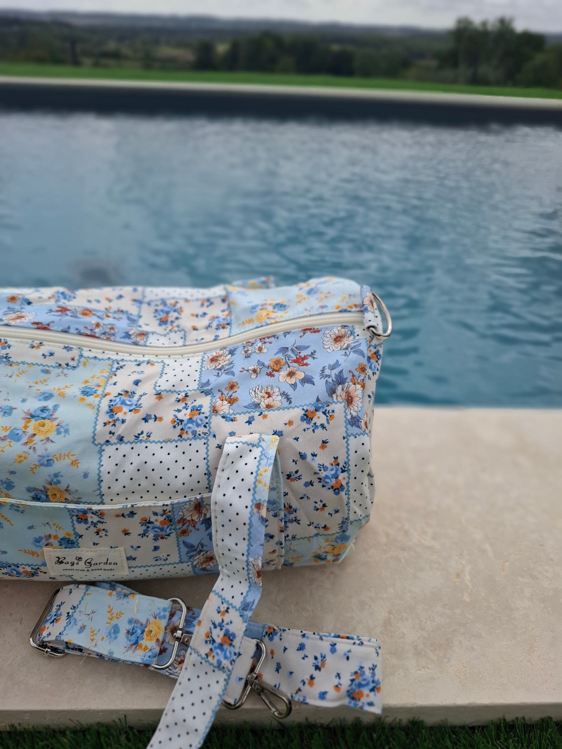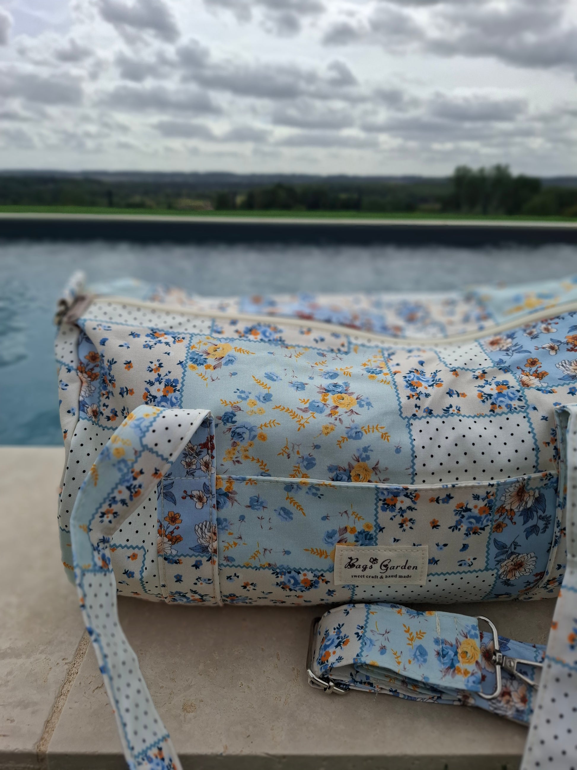 Sac polochon week end de voyage en tissu coton patchwork motifs floraux bleu clair et jaune
