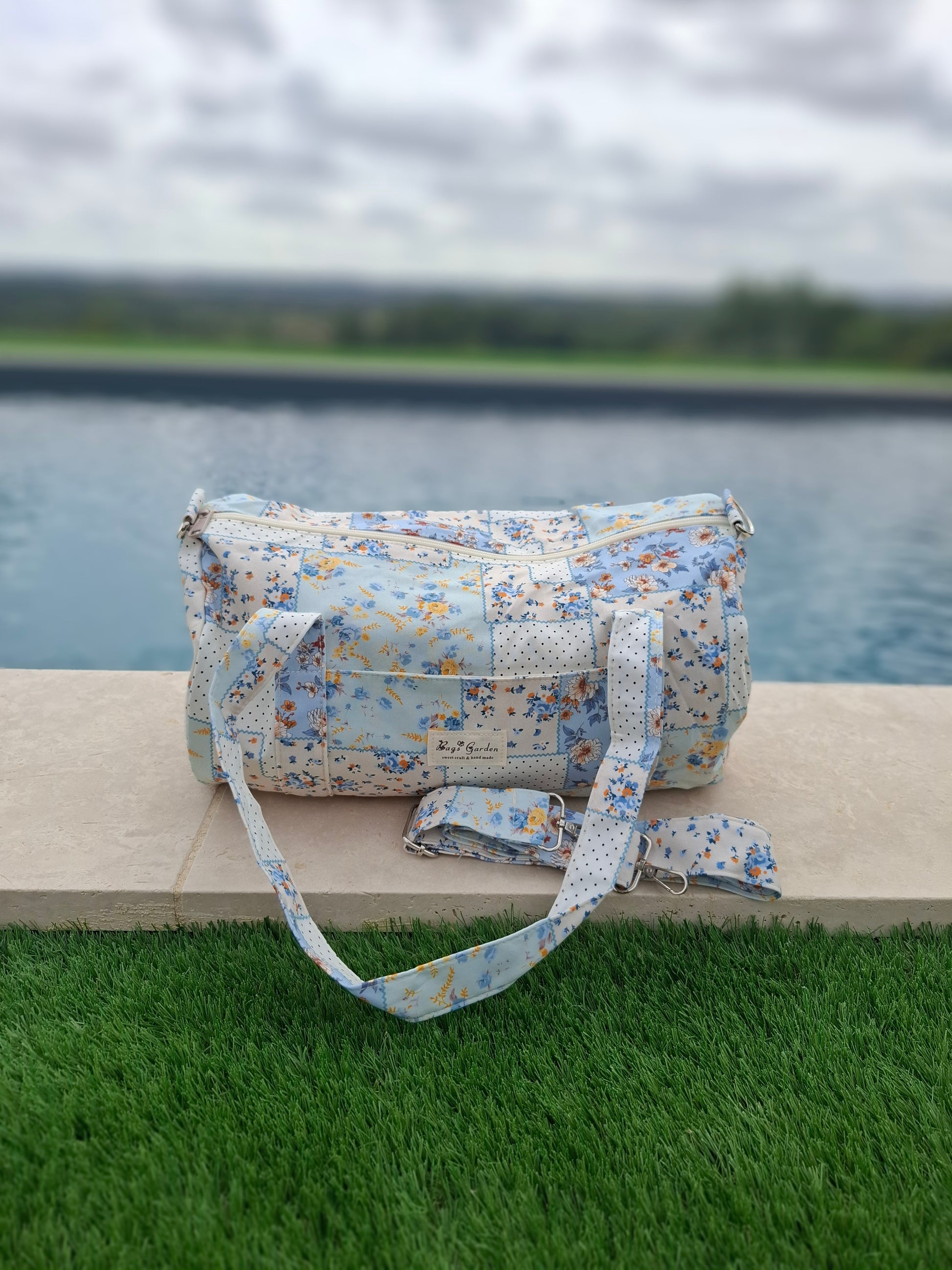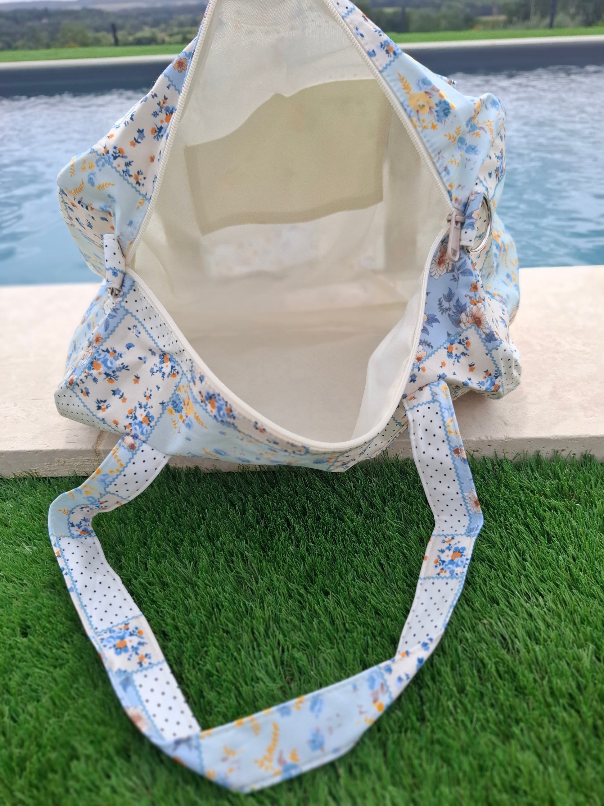Le sac polochon présente un design patchwork avec des motifs floraux dans des tons bleus et jaunes.