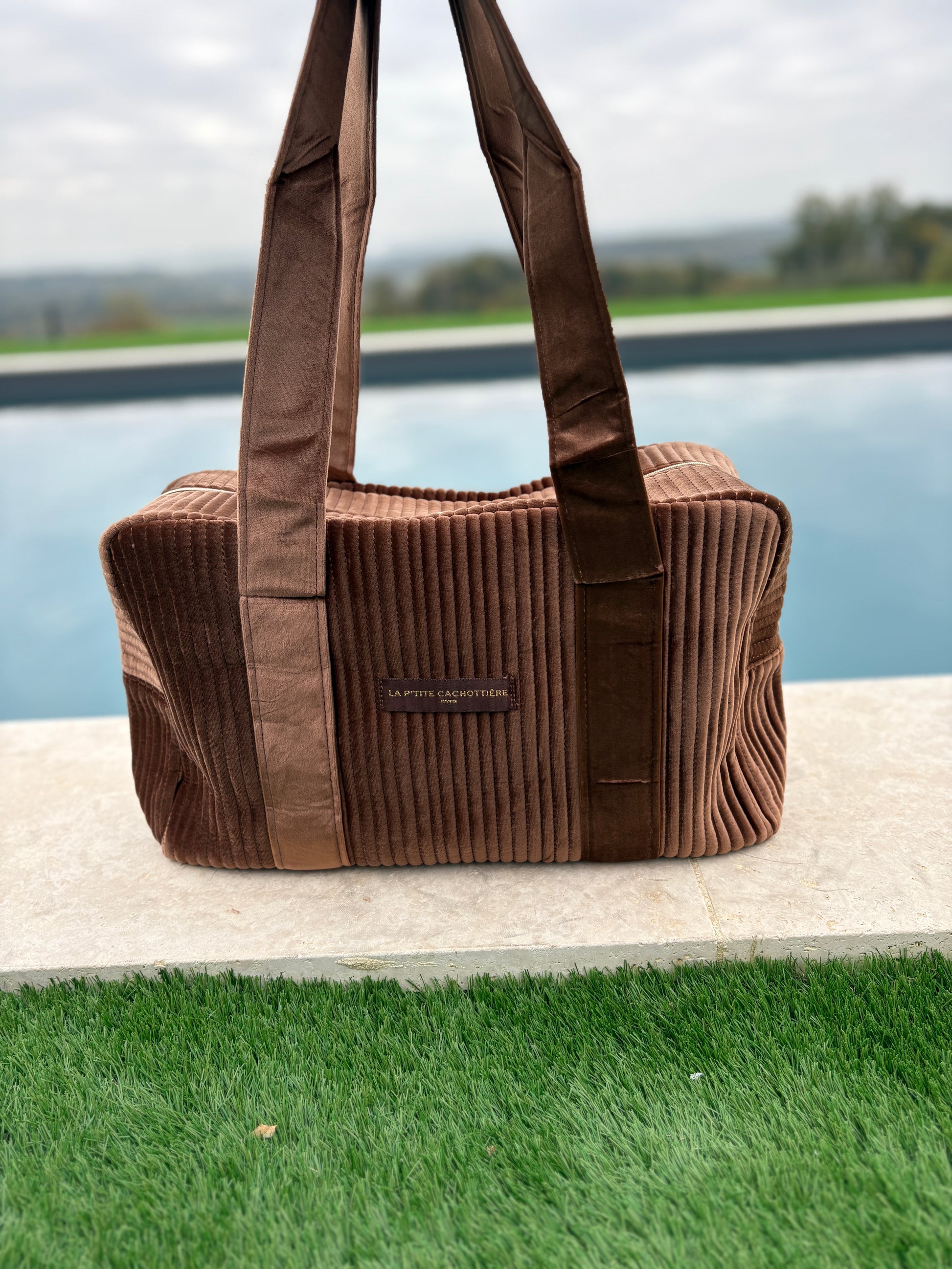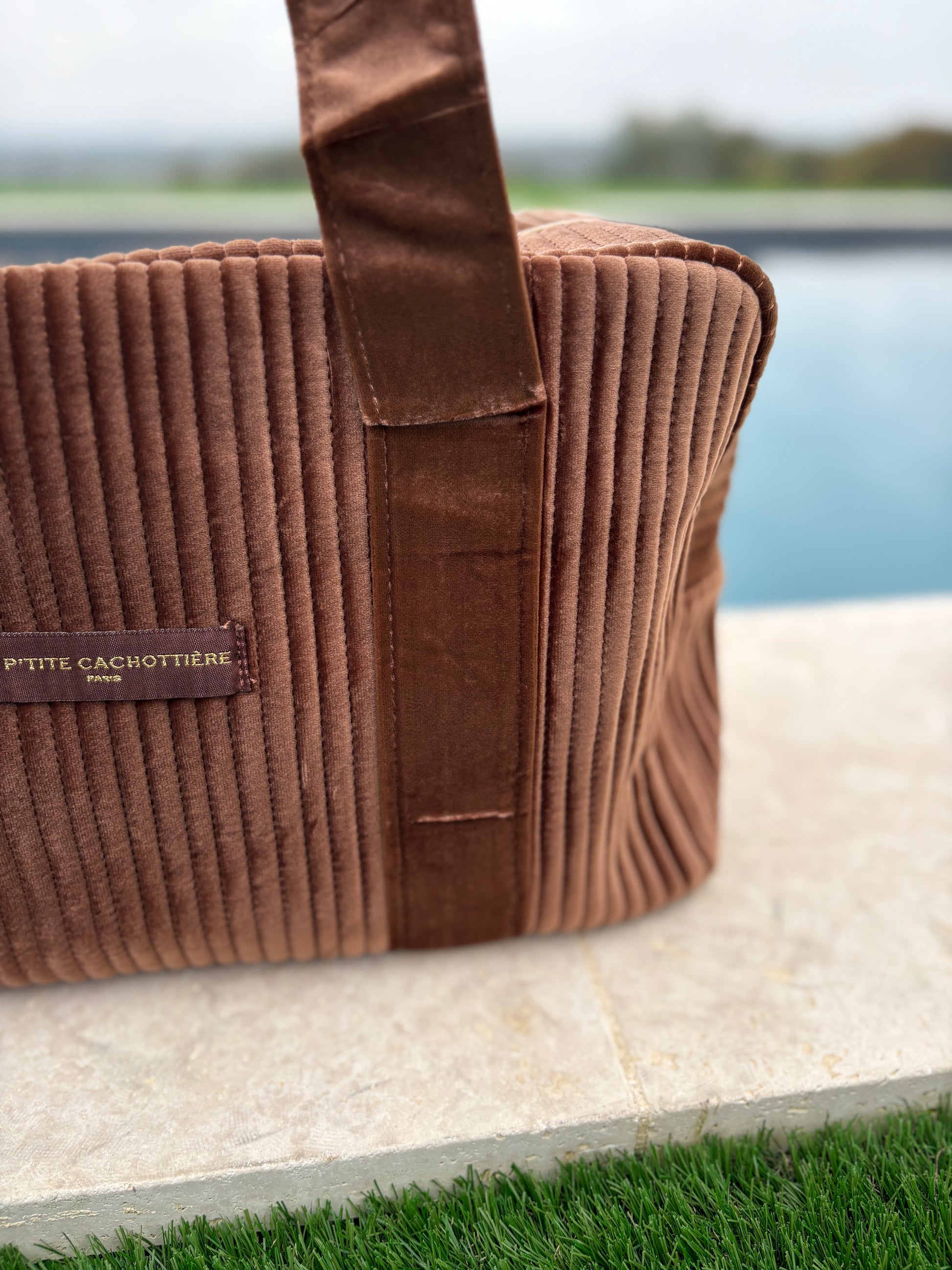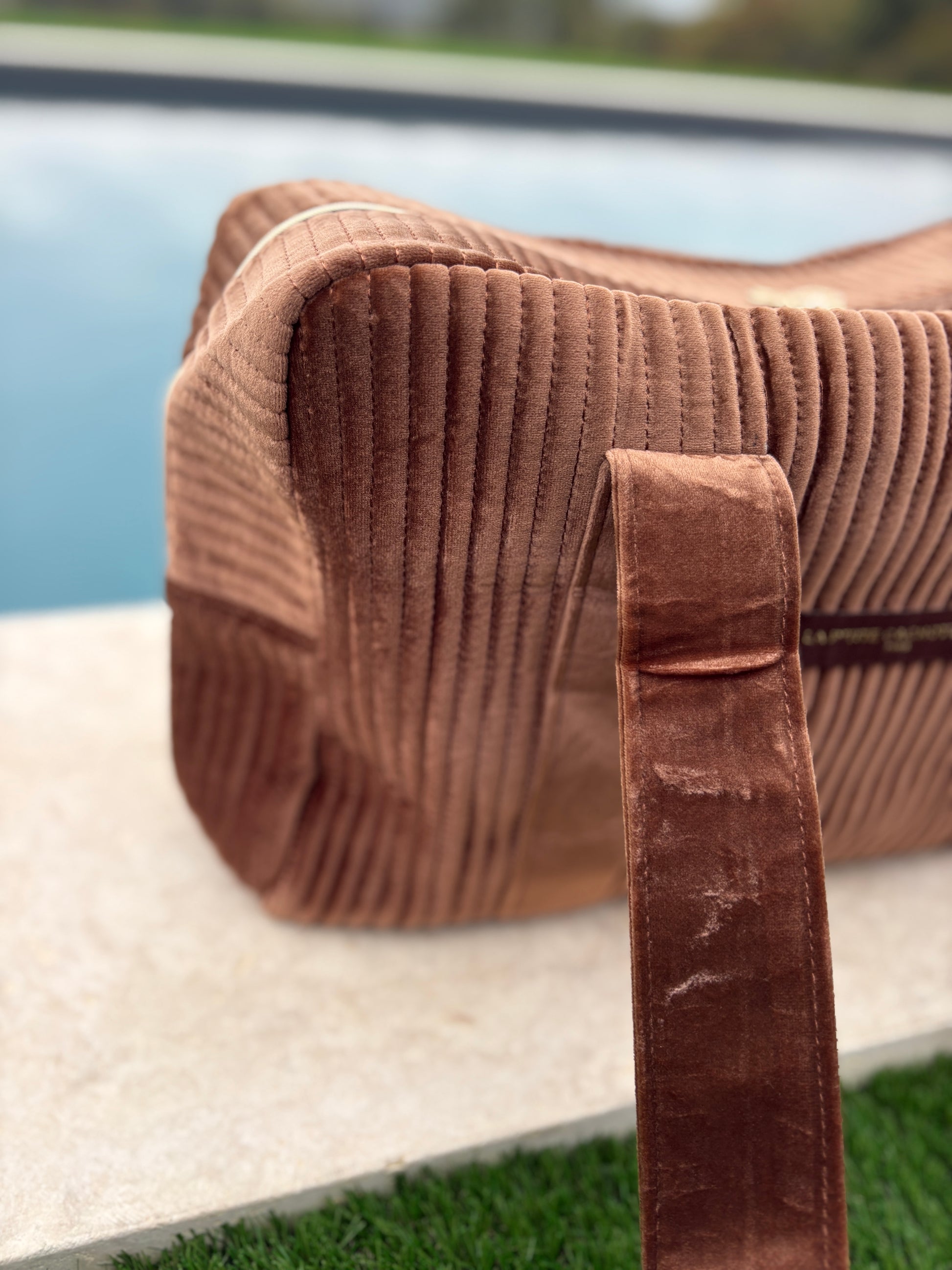 Il est entièrement coloré en marron en velours matelassé ajoutant une touche élégante au sac.