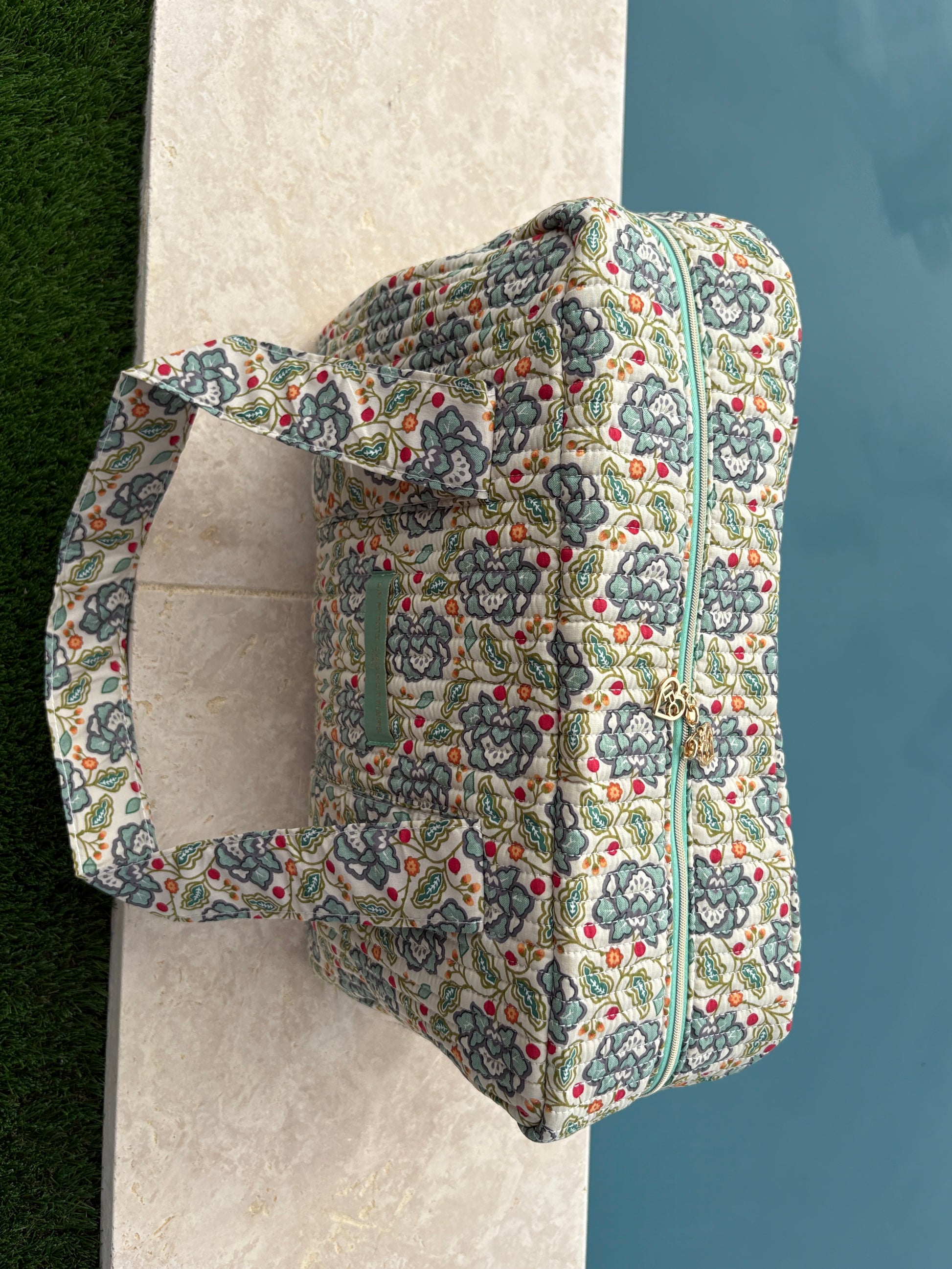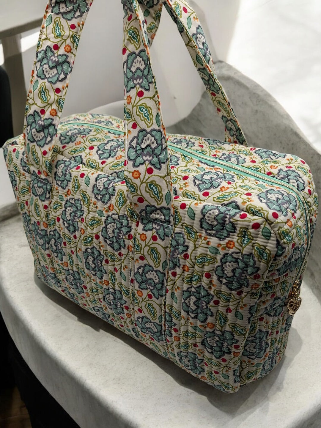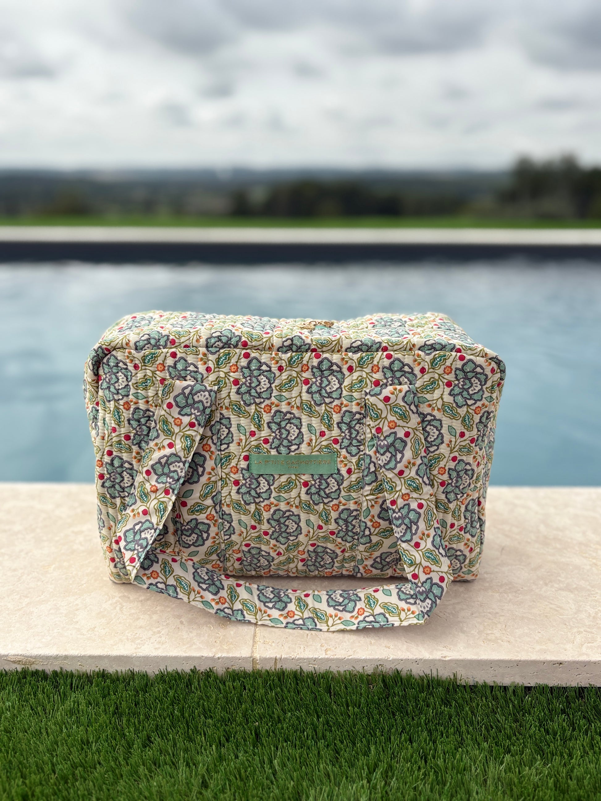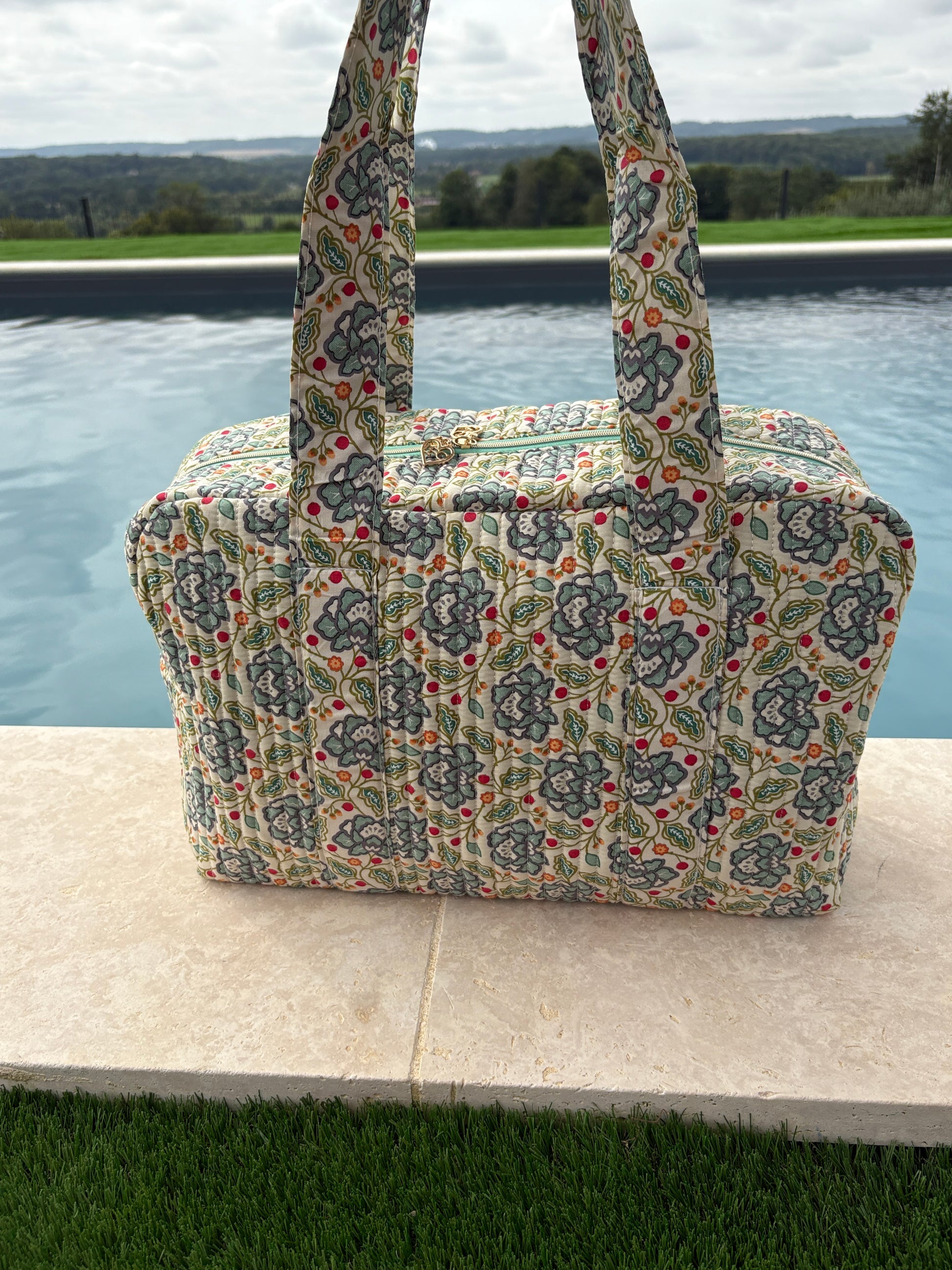 Sac week-end polochon en coton matelassé blanc liberty fleuri jaune et bleu