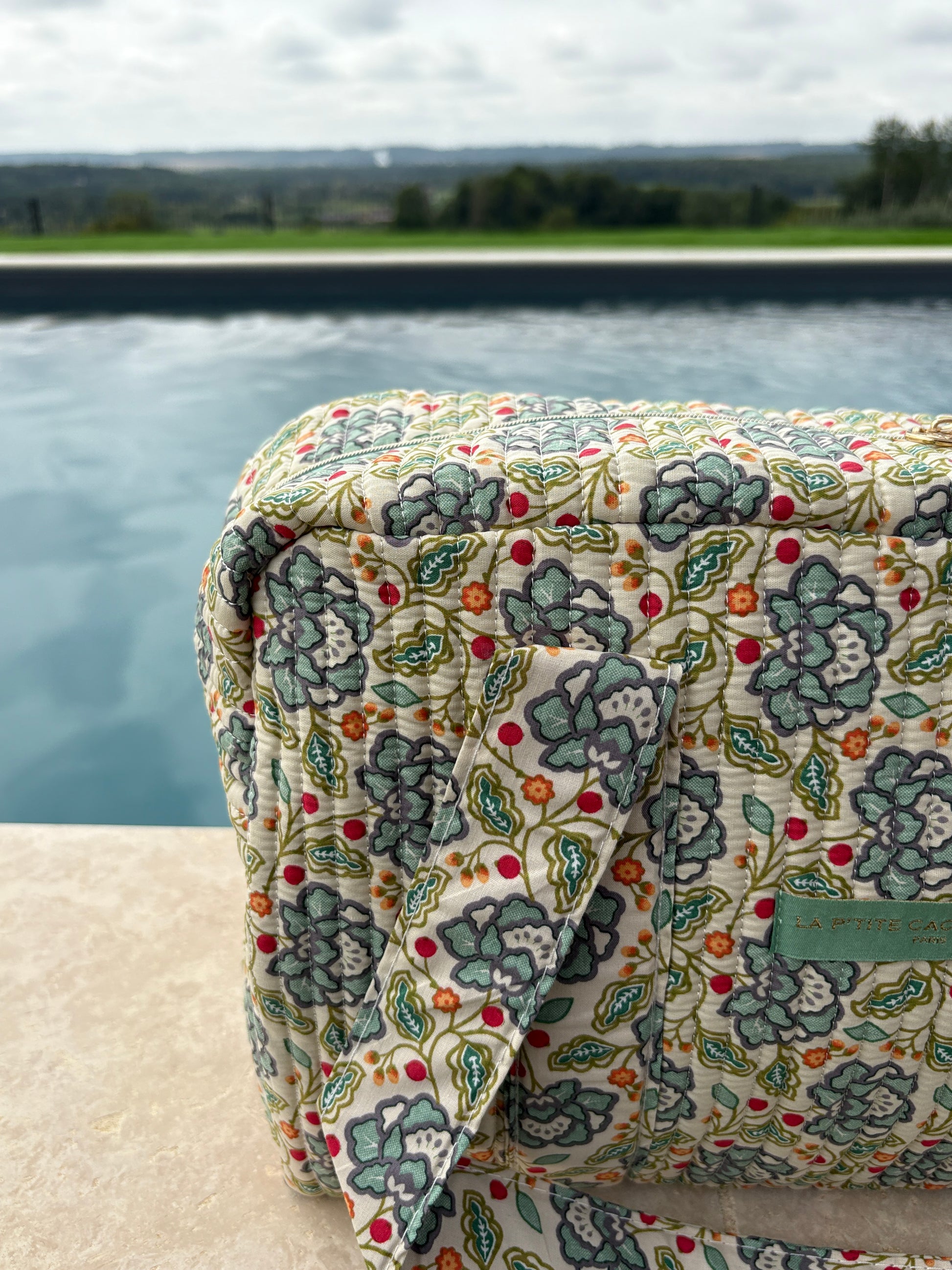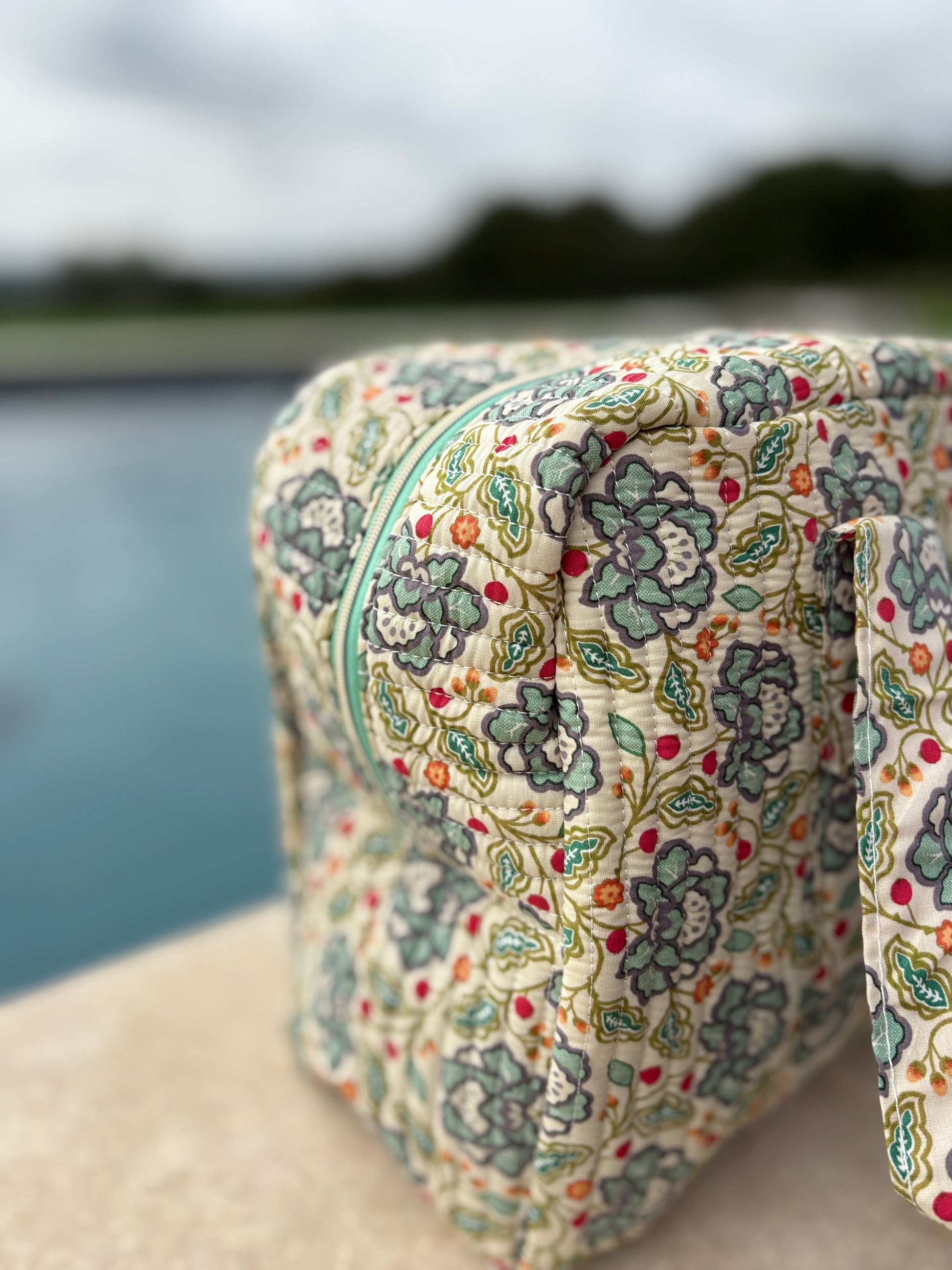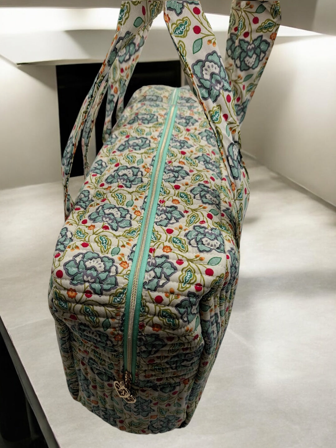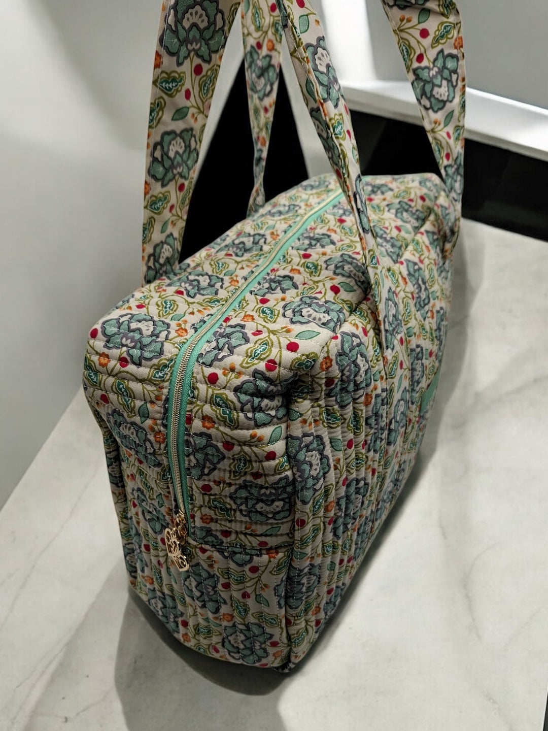 Sac week-end polochon en coton matelassé blanc liberty fleuri jaune et bleu